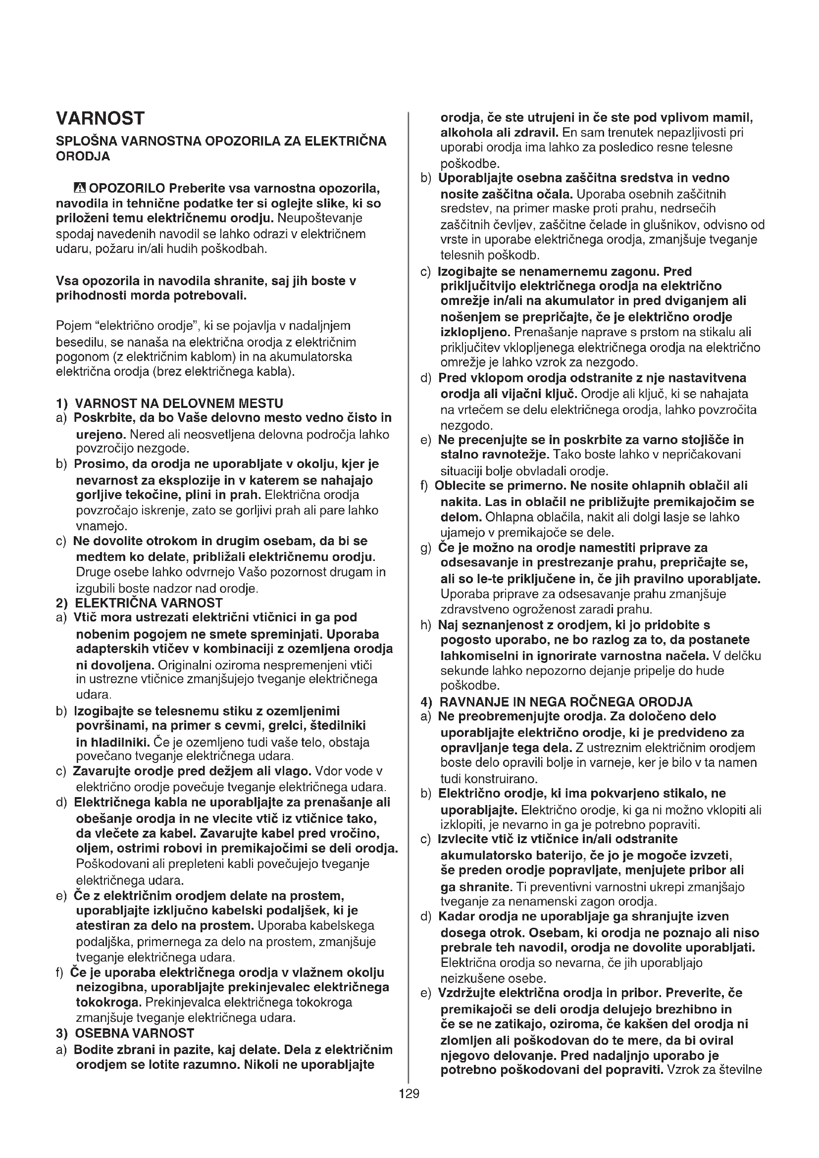 a) Ne preobremenjujte orodja. Za določeno delo uporabljajte električno orodje, ki je predvideno za opravljanje tega dela. Z ustreznim električnim orodjem boste delo opravili bolje in varneje, ker je bilo v ta namen tudi konstruirano. b) Električno orodje, ki ima pokvarjeno stikalo, ne uporabljajte. Električno orodje, ki ga ni možno vklopiti ali izklopiti, je nevarno in ga je potrebno popraviti. c) Izvlecite vtič iz vtičnice in/ali odstranite akumulatorsko baterijo, če jo je mogoče izvzeti, še preden orodje popravljate, menjujete pribor ali ga shranite. Ti preventivni varnostni ukrepi zmanjšajo tveganje za nenamenski zagon orodja. d) Kadar orodja ne uporabljaje ga shranjujte izven dosega otrok. Osebam, ki orodja ne poznajo ali niso prebrale teh navodil, orodja ne dovolite uporabljati. Električna orodja so nevarna, če jih uporabljajo neizkušene osebe. e) Vzdržujte električna orodja in pribor. Preverite, če premikajoči se deli orodja delujejo brezhibno in če se ne zatikajo, oziroma, če kakšen del orodja ni zlomljen ali poškodovan do te mere, da bi oviral njegovo delovanje. Pred nadaljnjo uporabo je potrebno poškodovani del popraviti. Vzrok za številne VARNOST SPLOŠNA VARNOSTNA OPOZORILA ZA ELEKTRIČNA ORODJA - OPOZORILO Preberite vsa varnostna opozorila, navodila in tehnične podatke ter si oglejte slike, ki so priloženi temu električnemu orodju. Neupoštevanje spodaj navedenih navodil se lahko odrazi v električnem udaru, požaru in/ali hudih poškodbah. Vsa opozorila in navodila shranite, saj jih boste v prihodnosti morda potrebovali. Pojem “električno orodje”, ki se pojavlja v nadaljnjem besedilu, se nanaša na električna orodja z električnim pogonom (z električnim kablom) in na akumulatorska električna orodja (brez električnega kabla).