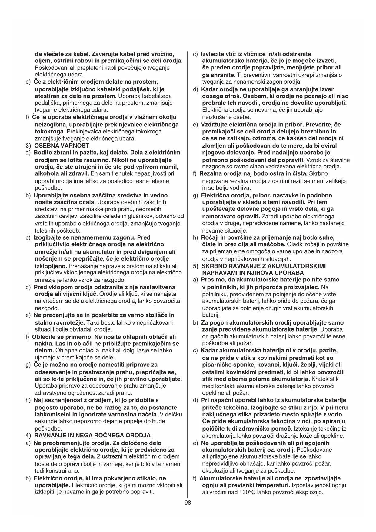 a) Prosimo, da akumulatorske baterije polnite samo v polnilnikih, ki jih priporoča proizvajalec. Na polnilniku, predvidenem za polnjenje določene vrste akumulatorskih baterij, lahko pride do požara, če ga uporabljate za polnjenje drugih vrst akumulatorskih baterij. b) Za pogon akumulatorskih orodij uporabljajte samo zanje predvidene akumulatorske baterije. Uporaba drugačnih akumulatorskih baterij lahko povzroči telesne poškodbe ali požar. c) Kadar akumulatorska baterija ni v orodju, pazite, da ne pride v stik s kovinskimi predmeti kot so pisarniške sponke, kovanci, ključi, žeblji, vijaki ali ostalimi kovinskimi predmeti, ki bi lahko povzročili stik med obema poloma akumulatorja. Kratek stik med kontakti akumulatorske baterije lahko povzroči opekline ali požar. d) Pri napačni uporabi lahko iz akumulatorske baterije priteče tekočina. Izogibajte se stiku z njo. V primeru naključnega stika prizadeto mesto spirajte z vodo. Če pride akumulatorska tekočina v oči, po spiranju poiščite tudi zdravniško pomoč. Iztekanje tekočine iz akumulatorja lahko povzroči draženje kože ali opekline. e) Ne uporabljajte poškodovanih ali prilagojenih akumulatorskih baterij oz. orodij. Poškodovane ali prilagojene akumulatorske baterije se lahko nepredvidljivo obnašajo, kar lahko povzroči požar, eksplozijo ali tveganje za poškodbe. f) Akumulatorske baterije ali orodja ne izpostavljajte ognju ali previsoki temperaturi. Izpostavljenost ognju ali vročini nad 130°C lahko povzroči eksplozijo. da vlečete za kabel. Zavarujte kabel pred vročino, oljem, ostrimi robovi in premikajočimi se deli orodja. Poškodovani ali prepleteni kabli povečujejo tveganje električnega udara. e) Če z električnim orodjem delate na prostem, uporabljajte izključno kabelski podaljšek, ki je atestiran za delo na prostem. Uporaba kabelskega podaljška, primernega za delo na prostem, zmanjšuje tveganje električnega udara. f) Če je uporaba električnega orodja v vlažnem okolju neizogibna, uporabljajte prekinjevalec električnega tokokroga. Prekinjevalca električnega tokokroga zmanjšuje tveganje električnega udara.
