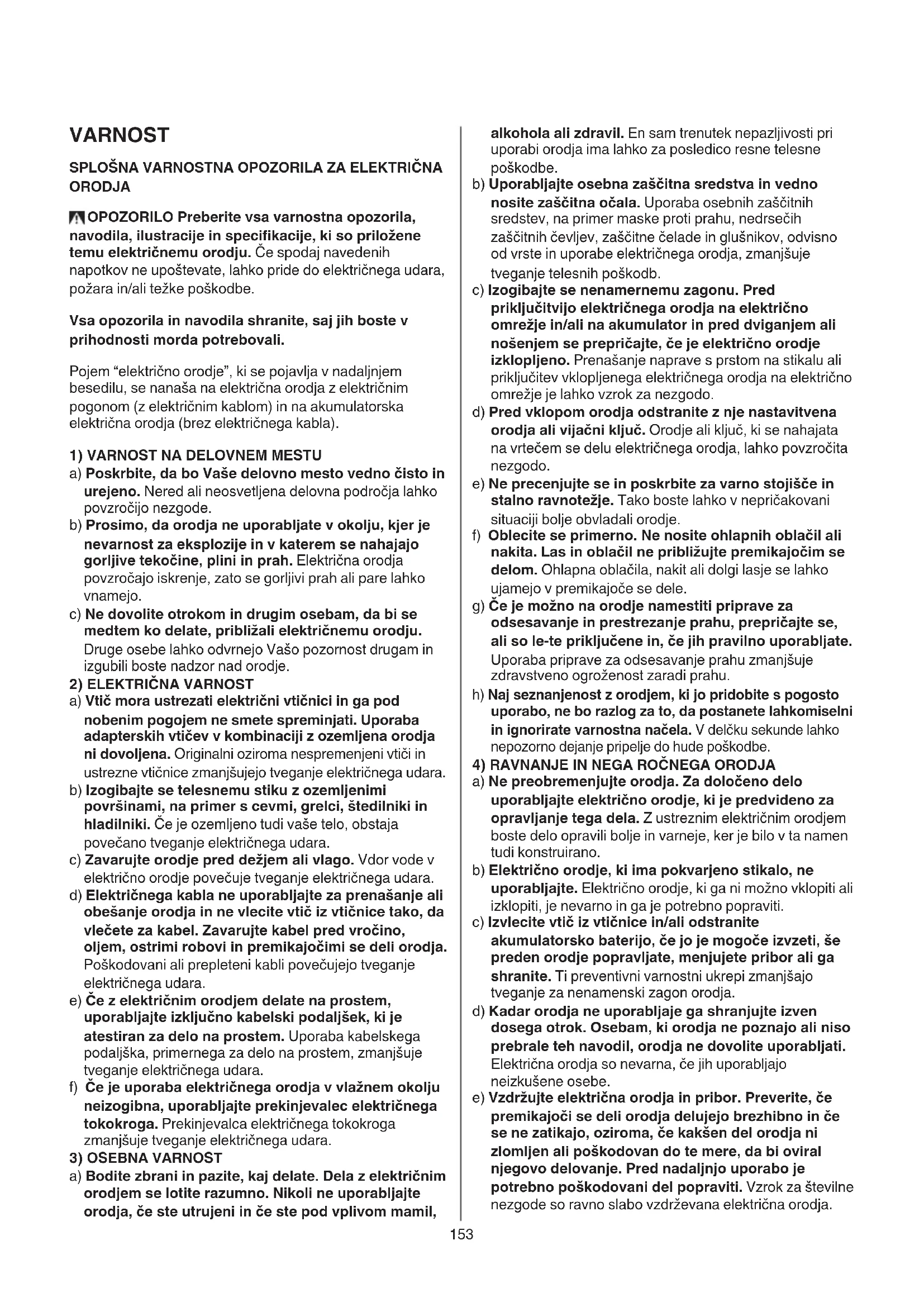 DELI ORODJA 2 A Varnostno stikalo B Sprožilec C Ročica za nastavitev globine rezanja D Skala globine rezanja E Cev za odvajanje prahu F Priključek za odvajanje prahu G Imbus ključ H Mesto za shranjevanje šestkotnega ključa J Gumb za blokado vretena K Vijak lista L Prirobna matica M Gumb za potopno rezanje N Nožni podstavek P Zgornje varovalo Q Signalna lučka za “vklop” R Indikator linije reza S Stransko vodilo T Vijak za nastavitev stranskega vodila V Rezilo iz ojačanega jekla W Diamantni kolut X Karbidni konice žagin list Y Ventilacijske reže Z Gibljivi ščit153 VARNOST SPLOŠNA VARNOSTNA OPOZORILA ZA ELEKTRIČNA ORODJA OPOZORILO Preberite vsa varnostna opozorila, navodila, ilustracije in specifikacije, ki so priložene temu električnemu orodju. Če spodaj navedenih napotkov ne upoštevate, lahko pride do električnega udara, požara in/ali težke poškodbe. Vsa opozorila in navodila shranite, saj jih boste v prihodnosti morda potrebovali. Pojem “električno orodje”, ki se pojavlja v nadaljnjem besedilu, se nanaša na električna orodja z električnim pogonom (z električnim kablom) in na akumulatorska električna orodja (brez električnega kabla).