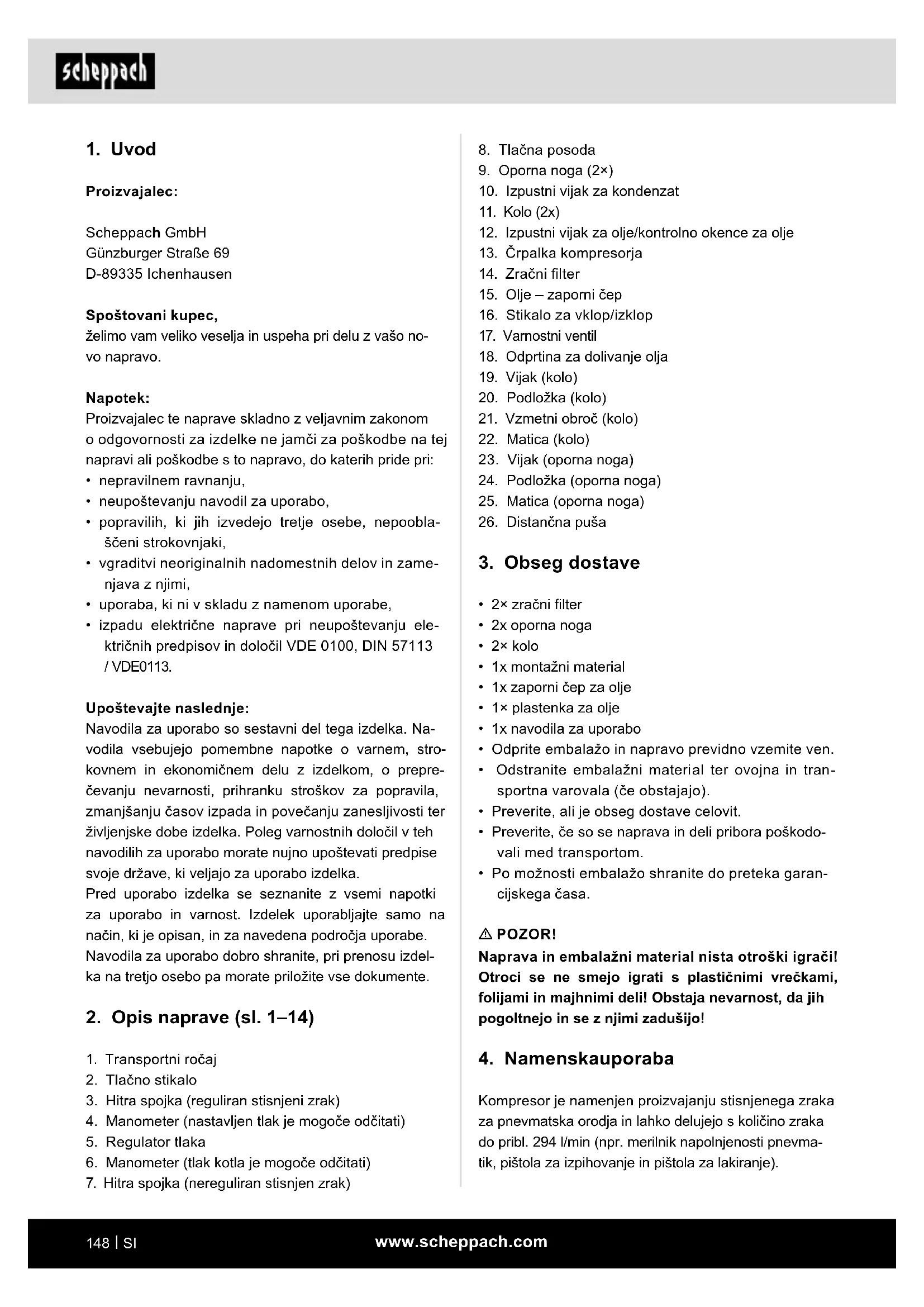 Proizvajalec: Scheppach GmbH Günzburger Straße 69 D-89335 Ichenhausen Spoštovani kupec, želimo vam veliko veselja in uspeha pri delu z vašo no- vo napravo. Napotek: Proizvajalec te naprave skladno z veljavnim zakonom o odgovornosti za izdelke ne jamči za poškodbe na tej napravi ali poškodbe s to napravo, do katerih pride pri:
