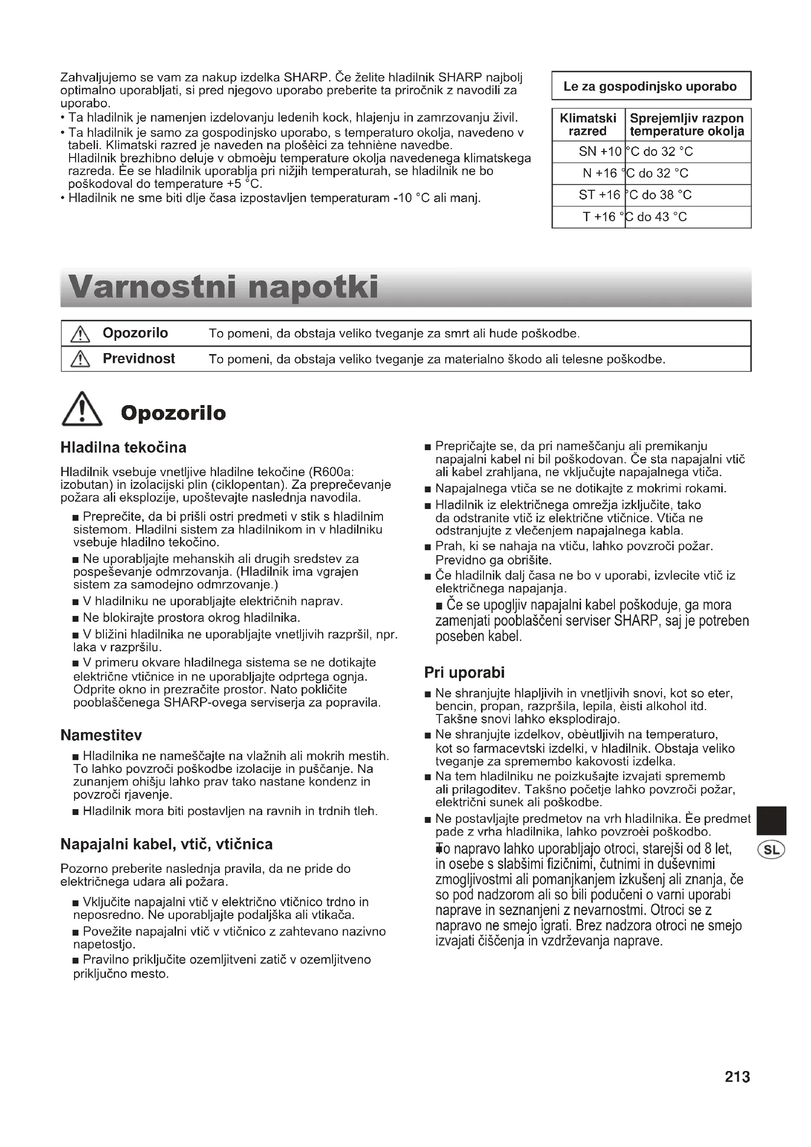 To napravo lahko uporabljajo otroci, starejši od 8 let, in osebe s slabšimi zičnimi, čutnimi in duševnimi zmogljivostmi ali pomanjkanjem izkušenj ali znanja, če so pod nadzorom ali so bili podučeni o varni uporabi naprave in seznanjeni z nevarnostmi. Otroci se z napravo ne smejo igrati. Brez nadzora otroci ne smejo izvajati čiščenja in vzdrževanja naprave. Klimatski razred Sprejemljiv razpon temperature okolja SN +10 °C do 32 °C N +16 °C do 32 °C ST +16 °C do 38 °C T +16 °C do 43 °C Varnostni napotki Opozorilo To pomeni, da obstaja veliko tveganje za smrt ali hude poškodbe. Previdnost To pomeni, da obstaja veliko tveganje za materialno škodo ali telesne poškodbe. Opozorilo (B656)E_3.indb 213 2015/05/21 16:23:39214 Vzdrževanje in čiščenje ■ Da bi preprečili električni udar sunek, izključite hladilnik iz električnega omrežja. ■ Ne škropite vode neposredno na zunanje ohišje ali notranjost. To lahko povzroči rjavenje in poškodbo električne izolacije. Težava ■ Èe zavohate, da se nekaj žge, napajalni vtiè takoj izvlecite iz vtiènice. Nato poklièite pooblašèenega SHARP-ovega servisnega predstavnika. ■ V primeru izpušèanja plina prezraèite prostor, tako da odprete okna. Ne dotikajte se hladilnika ali elektriène vtiènice. Odstranitev ■ Pri odlaganju hladilnika odstranite magnetno tesnilo (tako preprečite morebitno ujetje otrok med igro). ■ Hladilnik je po izteku življenjske dobe treba ustrezno odstraniti. Odpeljite ga do ustreznega obrata, kjer bodo reciklirali vnetljivo hladilno tekoèino in izolacijske pline. Prevoz ■ Ko namešèate ali premikate hladilnik, uporabite vulkanizirano preprogo, da zašèitite tla pred poškodbami. ■ Hladilnik prenašajte za ročice, ki se nahajajo na zadnji strani in na dnu. Èe nepravilno dvignete hladilnik, lahko le-ta povzroèi poškodbe. Previdnost Pri uporabi ■ Ne dotikajte se enote kompresorja ali njenih perifernih delov, saj med delovanjem postanejo izredno vroči, kovinski robovi pa lahko povzročijo poškodbe. ■ Ne dotikajte se živil ali kovinskih vsebnikov v zamrzovalniku z mokrimi rokami. To lahko povzroči ozebline. ■ Ne postavljajte usteklenièene pijaèe in ploèevink v zamrzovalnik. Še posebej, če deluje način »Hitro hlajenje«, obstaja veliko tveganje, da se bodo steklenice razpočile. ■ Za izdelavo ledenih kock ne uporabljajte drugega kot pitno vodo. ■ Ne odpirajte ali zapirajte vrat, ko kdo drugi postavi roko v bližino vrat. Obstaja tveganje, da se prsti drugih ljudi ujamejo med vrata. ■ Ne postavljajte prevelikih predmetov v predalčke v vratih. Če predmeti padejo iz predalčkov, lahko povzročijo poškodbe. Indikator temperature Zadaj Na dnu Naprava ima v predelu hladilnika vgrajen indikator temperature, ki omogoča nadzor povprečne temperature v najhladnejšem območju. Najhladnejše območje Znak označuje najhladnejše območje v predelu za hlajenje. (Predal v vratih na isti višini ni najhladnejši.) Preverjanje temperature v najbolj mrzlem območju Z običajnimi postopki lahko preverjate, če je temperatura v najhladnejšem območju pravilna, po potrebi nastavite temperaturo hladilnika. Da bi v napravi vzdrževali ustrezno temperaturo, redno preverjajte, ali je indikator temperature MODRE barve. Če se indikator temperature obarva BELO, je temperatura previsoka; v tem primeru spremenite nastavitev temperature hladilnika in počakajte vsaj 6 ur, preden ponovno preverite stanje indikatorja temperature. OPOMBA