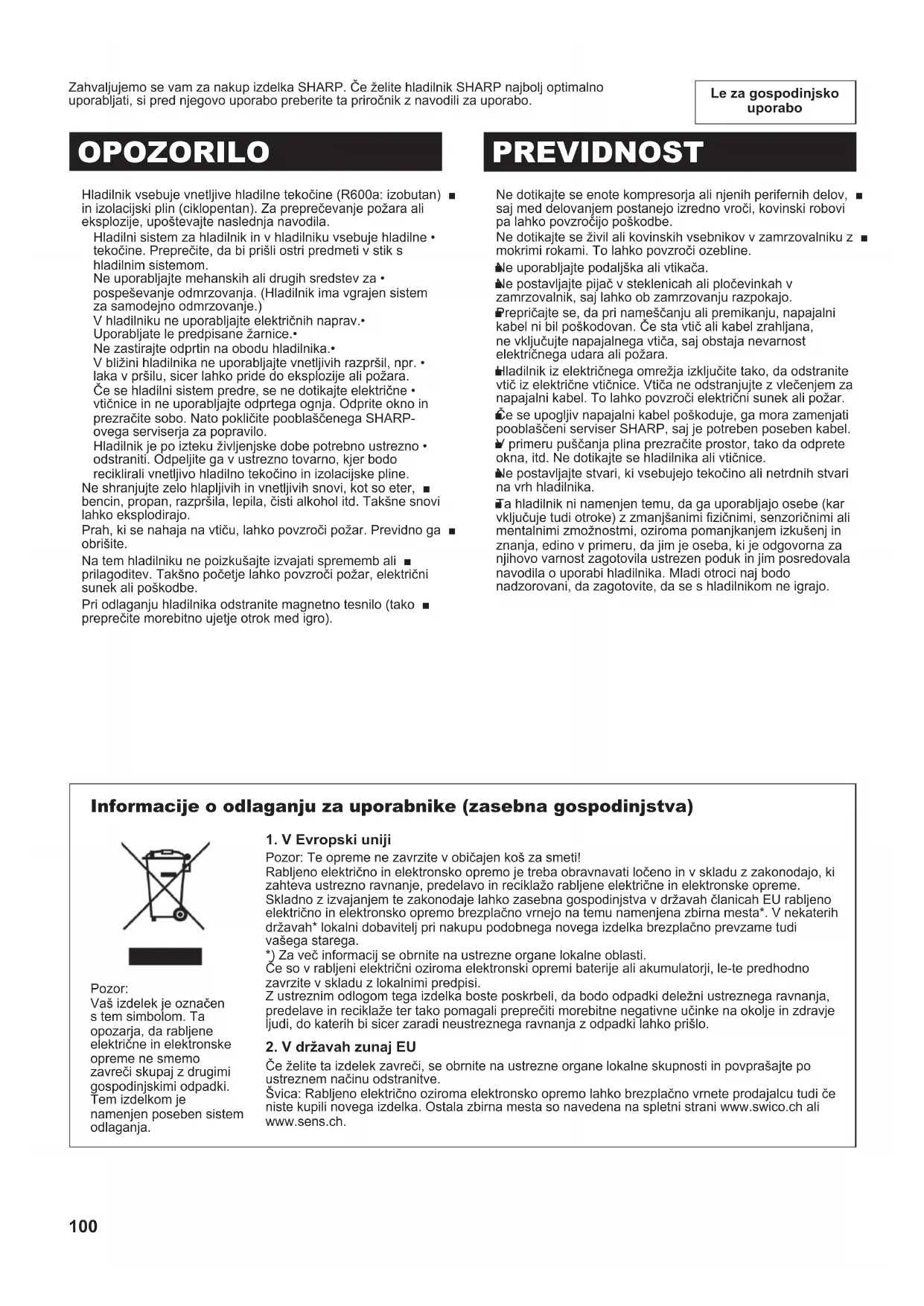 (B246)-E.indb 99 2011/09/01 10:11:57100 Le za gospodinjsko uporabo Zahvaljujemo se vam za nakup izdelka SHARP. Če želite hladilnik SHARP najbolj optimalno uporabljati, si pred njegovo uporabo preberite ta priročnik z navodili za uporabo. Hladilnik vsebuje vnetljive hladilne tekočine (R600a: izobutan) ■ in izolacijski plin (ciklopentan). Za preprečevanje požara ali eksplozije, upoštevajte naslednja navodila. Hladilni sistem za hladilnik in v hladilniku vsebuje hladilne • tekočine. Preprečite, da bi prišli ostri predmeti v stik s hladilnim sistemom. Ne uporabljajte mehanskih ali drugih sredstev za • pospeševanje odmrzovanja. (Hladilnik ima vgrajen sistem za samodejno odmrzovanje.) V hladilniku ne uporabljajte električnih naprav.• Uporabljate le predpisane žarnice.• Ne zastirajte odprtin na obodu hladilnika.• V bližini hladilnika ne uporabljajte vnetljivih razpršil, npr. • laka v pršilu, sicer lahko pride do eksplozije ali požara. Če se hladilni sistem predre, se ne dotikajte električne • vtičnice in ne uporabljajte odprtega ognja. Odprite okno in prezračite sobo. Nato pokličite pooblaščenega SHARP- ovega serviserja za popravilo. Hladilnik je po izteku življenjske dobe potrebno ustrezno • odstraniti. Odpeljite ga v ustrezno tovarno, kjer bodo reciklirali vnetljivo hladilno tekočino in izolacijske pline. Ne shranjujte zelo hlapljivih in vnetljivih snovi, kot so eter, ■ bencin, propan, razpršila, lepila, čisti alkohol itd. Takšne snovi lahko eksplodirajo. Prah, ki se nahaja na vtiču, lahko povzroči požar. Previdno ga ■ obrišite. Na tem hladilniku ne poizkušajte izvajati sprememb ali ■ prilagoditev. Takšno početje lahko povzroči požar, električni sunek ali poškodbe. Pri odlaganju hladilnika odstranite magnetno tesnilo (tako ■ preprečite morebitno ujetje otrok med igro). OPOZORILO PREVIDNOST Ne dotikajte se enote kompresorja ali njenih perifernih delov, ■ saj med delovanjem postanejo izredno vroči, kovinski robovi pa lahko povzročijo poškodbe. Ne dotikajte se živil ali kovinskih vsebnikov v zamrzovalniku z ■ mokrimi rokami. To lahko povzroči ozebline. Ne uporabljajte podaljška ali vtikača. ■ Ne postavljajte pijač v steklenicah ali pločevinkah v ■ zamrzovalnik, saj lahko ob zamrzovanju razpokajo. Prepričajte se, da pri nameščanju ali premikanju, napajalni ■ kabel ni bil poškodovan. Če sta vtič ali kabel zrahljana, ne vključujte napajalnega vtiča, saj obstaja nevarnost električnega udara ali požara. Hladilnik iz električnega omrežja izključite tako, da odstranite ■ vtič iz električne vtičnice. Vtiča ne odstranjujte z vlečenjem za napajalni kabel. To lahko povzroči električni sunek ali požar. Če se upogljiv napajalni kabel poškoduje, ga mora zamenjati ■ pooblaščeni serviser SHARP, saj je potreben poseben kabel. V primeru puščanja plina prezračite prostor, tako da odprete ■ okna, itd. Ne dotikajte se hladilnika ali vtičnice. Ne postavljajte stvari, ki vsebujejo tekočino ali netrdnih stvari ■ na vrh hladilnika. Ta hladilnik ni namenjen temu, da ga uporabljajo osebe (kar ■ vključuje tudi otroke) z zmanjšanimi zičnimi, senzoričnimi ali mentalnimi zmožnostmi, oziroma pomanjkanjem izkušenj in znanja, edino v primeru, da jim je oseba, ki je odgovorna za njihovo varnost zagotovila ustrezen poduk in jim posredovala navodila o uporabi hladilnika. Mladi otroci naj bodo nadzorovani, da zagotovite, da se s hladilnikom ne igrajo. Informacije o odlaganju za uporabnike (zasebna gospodinjstva)
