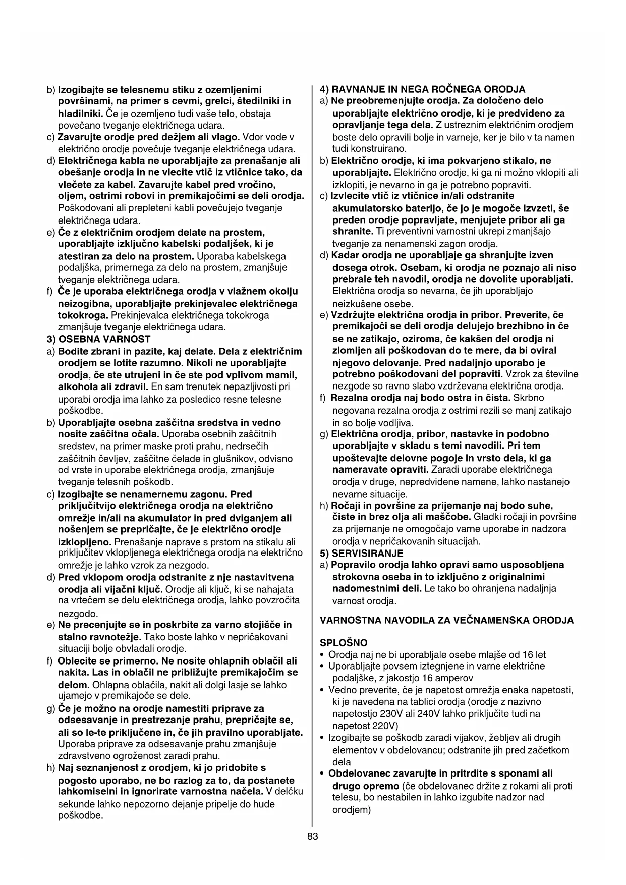 a) Ne preobremenjujte orodja. Za določeno delo uporabljajte električno orodje, ki je predvideno za opravljanje tega dela. Z ustreznim električnim orodjem boste delo opravili bolje in varneje, ker je bilo v ta namen tudi konstruirano. b) Električno orodje, ki ima pokvarjeno stikalo, ne uporabljajte. Električno orodje, ki ga ni možno vklopiti ali izklopiti, je nevarno in ga je potrebno popraviti. c) Izvlecite vtič iz vtičnice in/ali odstranite akumulatorsko baterijo, če jo je mogoče izvzeti, še preden orodje popravljate, menjujete pribor ali ga shranite. Ti preventivni varnostni ukrepi zmanjšajo tveganje za nenamenski zagon orodja. d) Kadar orodja ne uporabljaje ga shranjujte izven dosega otrok. Osebam, ki orodja ne poznajo ali niso prebrale teh navodil, orodja ne dovolite uporabljati. Električna orodja so nevarna, če jih uporabljajo neizkušene osebe. e) Vzdržujte električna orodja in pribor. Preverite, če premikajoči se deli orodja delujejo brezhibno in če se ne zatikajo, oziroma, če kakšen del orodja ni zlomljen ali poškodovan do te mere, da bi oviral njegovo delovanje. Pred nadaljnjo uporabo je potrebno poškodovani del popraviti. Vzrok za številne nezgode so ravno slabo vzdrževana električna orodja. f) Rezalna orodja naj bodo ostra in čista. Skrbno negovana rezalna orodja z ostrimi rezili se manj zatikajo in so bolje vodljiva. g) Električna orodja, pribor, nastavke in podobno uporabljajte v skladu s temi navodili. Pri tem upoštevajte delovne pogoje in vrsto dela, ki ga nameravate opraviti. Zaradi uporabe električnega orodja v druge, nepredvidene namene, lahko nastanejo nevarne situacije. h) Ročaji in površine za prijemanje naj bodo suhe, čiste in brez olja ali maščobe. Gladki ročaji in površine za prijemanje ne omogočajo varne uporabe in nadzora orodja v nepričakovanih situacijah.
