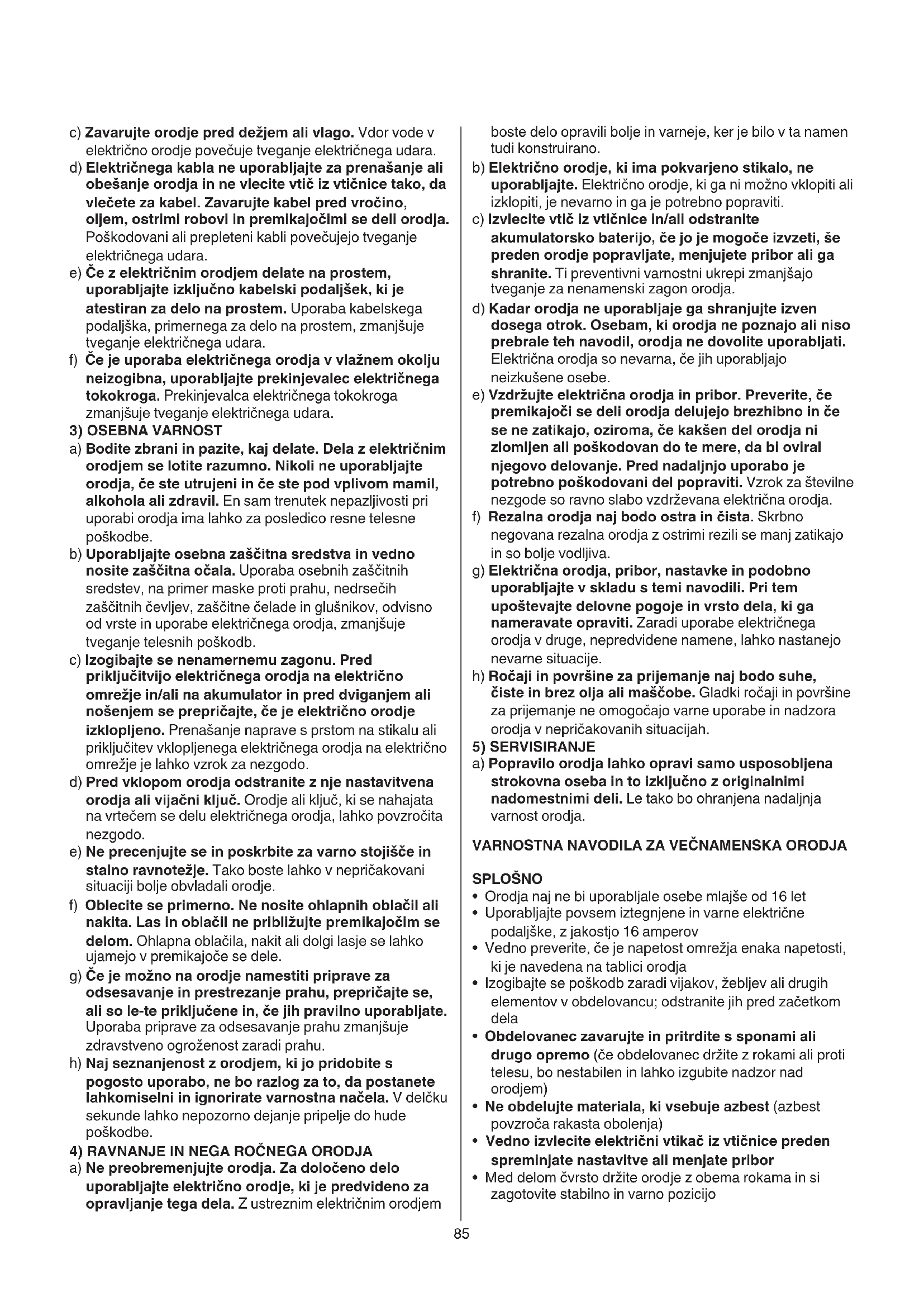 a) Ne preobremenjujte orodja. Za določeno delo uporabljajte električno orodje, ki je predvideno za opravljanje tega dela. Z ustreznim električnim orodjem boste delo opravili bolje in varneje, ker je bilo v ta namen tudi konstruirano. b) Električno orodje, ki ima pokvarjeno stikalo, ne uporabljajte. Električno orodje, ki ga ni možno vklopiti ali izklopiti, je nevarno in ga je potrebno popraviti. c) Izvlecite vtič iz vtičnice in/ali odstranite akumulatorsko baterijo, če jo je mogoče izvzeti, še preden orodje popravljate, menjujete pribor ali ga shranite. Ti preventivni varnostni ukrepi zmanjšajo tveganje za nenamenski zagon orodja. d) Kadar orodja ne uporabljaje ga shranjujte izven dosega otrok. Osebam, ki orodja ne poznajo ali niso prebrale teh navodil, orodja ne dovolite uporabljati. Električna orodja so nevarna, če jih uporabljajo neizkušene osebe. e) Vzdržujte električna orodja in pribor. Preverite, če premikajoči se deli orodja delujejo brezhibno in če se ne zatikajo, oziroma, če kakšen del orodja ni zlomljen ali poškodovan do te mere, da bi oviral njegovo delovanje. Pred nadaljnjo uporabo je potrebno poškodovani del popraviti. Vzrok za številne nezgode so ravno slabo vzdrževana električna orodja. f) Rezalna orodja naj bodo ostra in čista. Skrbno negovana rezalna orodja z ostrimi rezili se manj zatikajo in so bolje vodljiva. g) Električna orodja, pribor, nastavke in podobno uporabljajte v skladu s temi navodili. Pri tem upoštevajte delovne pogoje in vrsto dela, ki ga nameravate opraviti. Zaradi uporabe električnega orodja v druge, nepredvidene namene, lahko nastanejo nevarne situacije. h) Ročaji in površine za prijemanje naj bodo suhe, čiste in brez olja ali maščobe. Gladki ročaji in površine za prijemanje ne omogočajo varne uporabe in nadzora orodja v nepričakovanih situacijah.