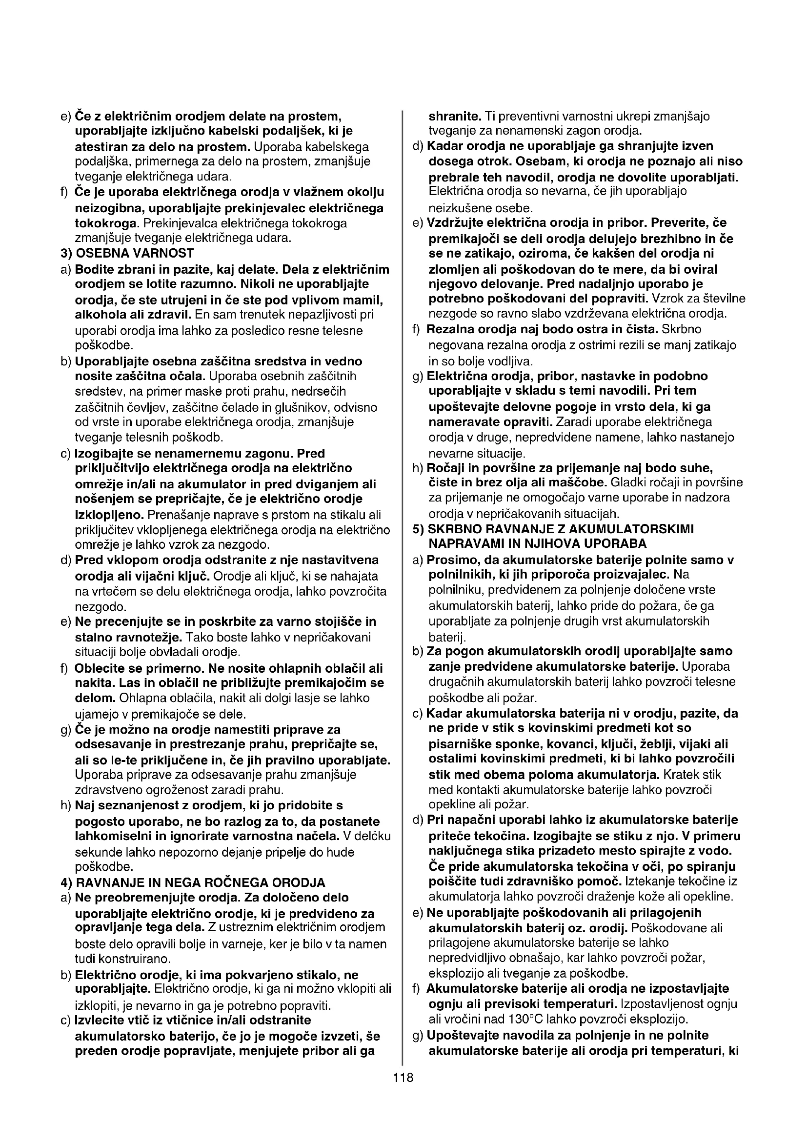 a) Ne preobremenjujte orodja. Za določeno delo uporabljajte električno orodje, ki je predvideno za opravljanje tega dela. Z ustreznim električnim orodjem boste delo opravili bolje in varneje, ker je bilo v ta namen tudi konstruirano. b) Električno orodje, ki ima pokvarjeno stikalo, ne uporabljajte. Električno orodje, ki ga ni možno vklopiti ali izklopiti, je nevarno in ga je potrebno popraviti. c) Izvlecite vtič iz vtičnice in/ali odstranite akumulatorsko baterijo, če jo je mogoče izvzeti, še preden orodje popravljate, menjujete pribor ali ga shranite. Ti preventivni varnostni ukrepi zmanjšajo tveganje za nenamenski zagon orodja. d) Kadar orodja ne uporabljaje ga shranjujte izven dosega otrok. Osebam, ki orodja ne poznajo ali niso prebrale teh navodil, orodja ne dovolite uporabljati. Električna orodja so nevarna, če jih uporabljajo neizkušene osebe. e) Vzdržujte električna orodja in pribor. Preverite, če premikajoči se deli orodja delujejo brezhibno in če se ne zatikajo, oziroma, če kakšen del orodja ni zlomljen ali poškodovan do te mere, da bi oviral njegovo delovanje. Pred nadaljnjo uporabo je potrebno poškodovani del popraviti. Vzrok za številne nezgode so ravno slabo vzdrževana električna orodja. f) Rezalna orodja naj bodo ostra in čista. Skrbno negovana rezalna orodja z ostrimi rezili se manj zatikajo in so bolje vodljiva. g) Električna orodja, pribor, nastavke in podobno uporabljajte v skladu s temi navodili. Pri tem upoštevajte delovne pogoje in vrsto dela, ki ga nameravate opraviti. Zaradi uporabe električnega orodja v druge, nepredvidene namene, lahko nastanejo nevarne situacije. h) Ročaji in površine za prijemanje naj bodo suhe, čiste in brez olja ali maščobe. Gladki ročaji in površine za prijemanje ne omogočajo varne uporabe in nadzora orodja v nepričakovanih situacijah.