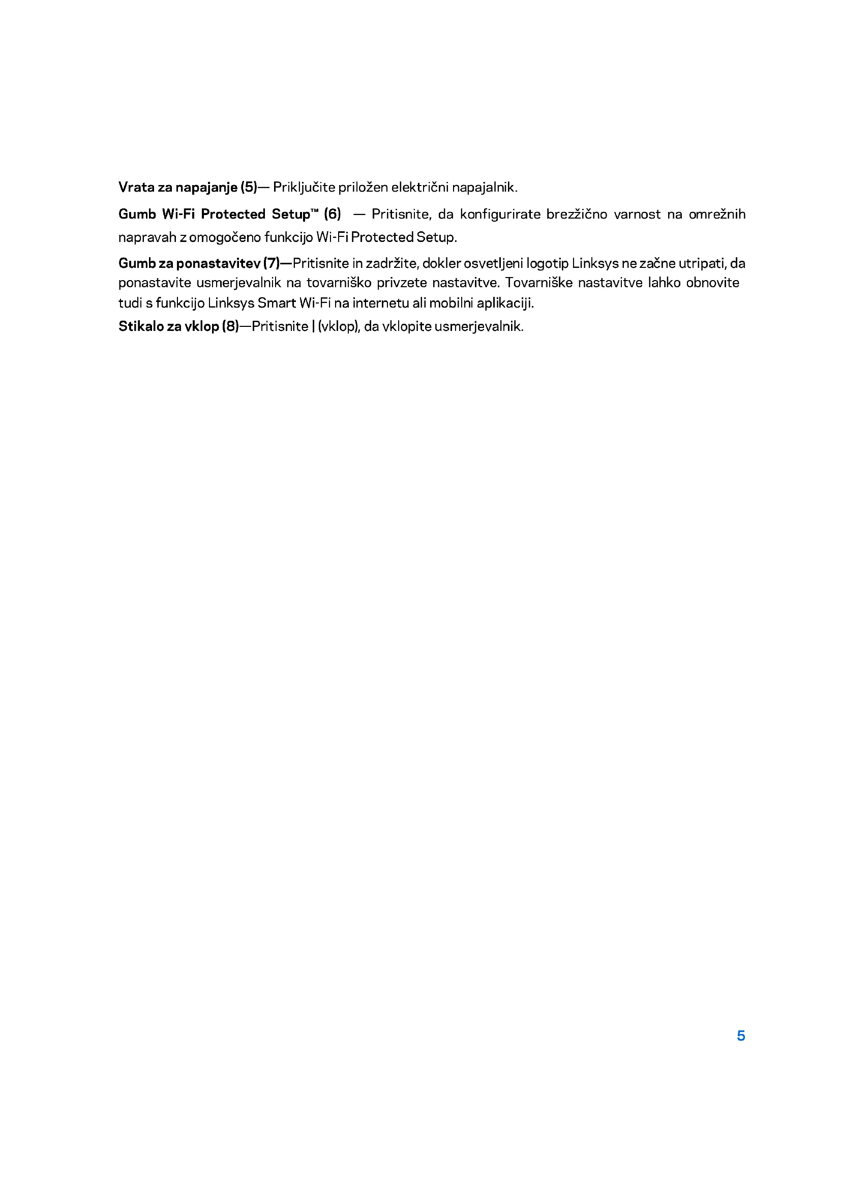 Pojdite na www.linksyssmartwifi.com in se prijavite v svoj račun. Če ste pozabili geslo, kliknite na Forgot your password ? (Pozabili geslo?) in sledite navodilom na zaslonu, da ga obnovite. Za Linksys Smart Wi-Fi pomoč (povežite se z Linksys Smart Wi-Fi, nato pa na vrhu glavnega zaslona kliknite Pomoč)10 Zemljevid omrežja Omogoča vam prikaz in upravljanje vseh omrežnih naprav, ki so povezane z usmerjevalnikom. Ogledate si lahko naprave v glavnem in gostujočem omrežju ali prikažete informacije o kateri koli napravi. Dostop za goste Omogoča vam konfigurirati in nadzirati omrežje, ki ga lahko gosti uporabljajo brez dostopa do vseh vaših omrežnih virov.11 Starševski nadzor Omogoča vam blokirati spletna mesta in nastavljati čase za dostop do interneta. Prednostni vrstni red medijev Omogoča vam nastaviti, katere naprave in aplikacije imajo prednost v vašem omrežnem prometu.12 Preskus hitrosti Omogoča vam preizkusiti hitrost internetne povezave vašega omrežja. Zunanji pomnilnik Omogoča vam dostop do priključenega USB-pogona (ni priložen) in nastavitev souporabe datotek, predstavnostnega strežnika in FTP-dostop.13 Povezljivost Omogoča vam nastaviti osnovne in napredne omrežne nastavitve. Odpravljanje napak Omogoča vam poiskati težave z usmerjevalnikom in preveriti stanje omrežja.14 Brezžična povezava Omogoča vam konfigurirati brezžično omrežje usmerjevalnika. Spremenite lahko način zaščite, geslo, filtriranje MAC in naprave povežete s funkcijo Wi-Fi Protected Setup™. Varnost Omogoča vam konfigurirati varnost brezžičnega omrežja usmerjevalnika. Nastavite lahko požarni zid, nastavitve VPN in določite lastne nastavitve za programe in igre.15 Odpravljanje napak Dodatno pomoč lahko dobite pri naši nagrajeni podpori na naslovu Linksys.com/support/EA7300. Usmerjevalnik ni bil uspešno nastavljen Če Linksys Smart Wi-Fi ni dokončal nastavitve, lahko poskusite z naslednjim: