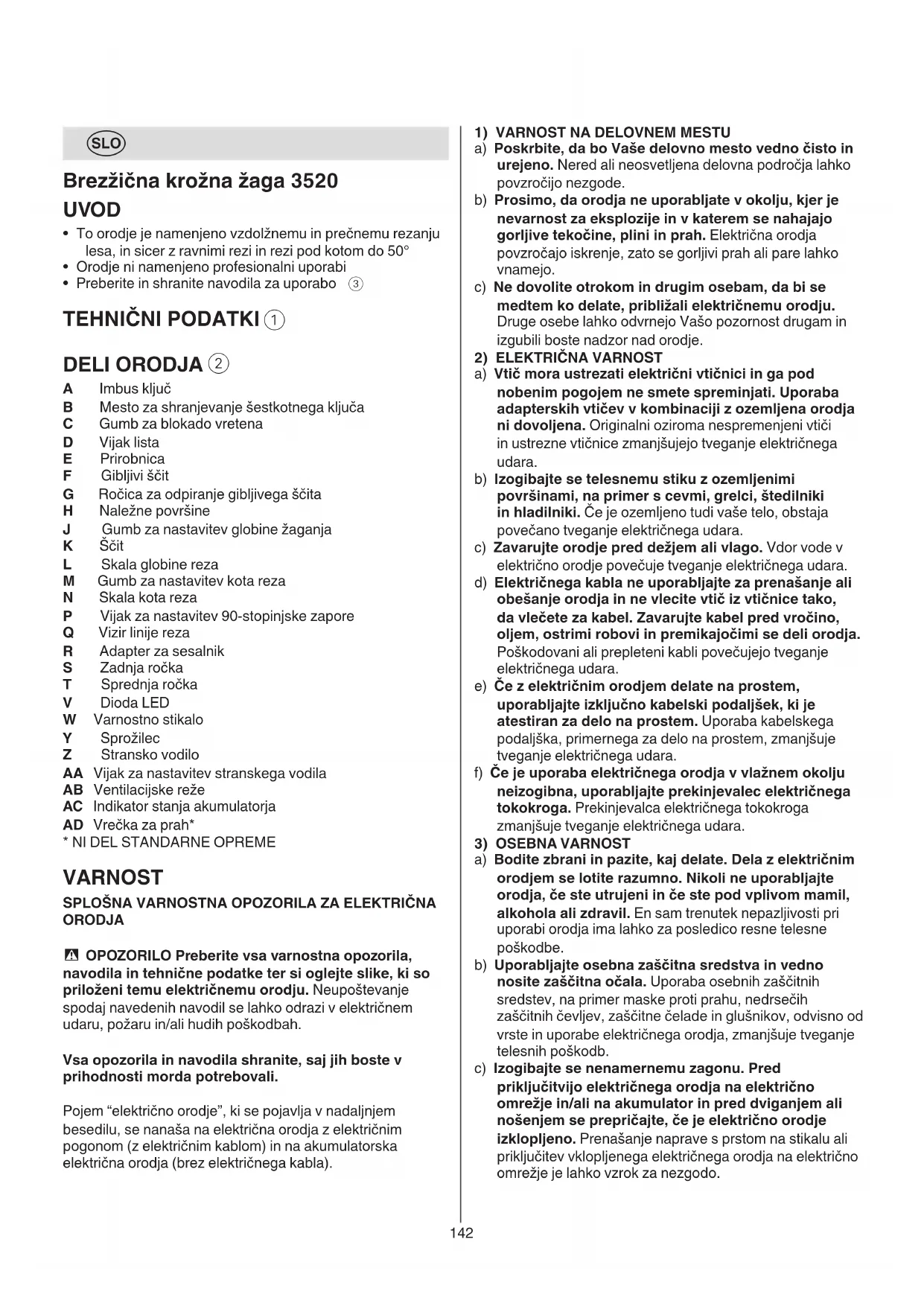 - NI DEL STANDARNE OPREME VARNOST SPLOŠNA VARNOSTNA OPOZORILA ZA ELEKTRIČNA ORODJA - OPOZORILO Preberite vsa varnostna opozorila, navodila in tehnične podatke ter si oglejte slike, ki so priloženi temu električnemu orodju. Neupoštevanje spodaj navedenih navodil se lahko odrazi v električnem udaru, požaru in/ali hudih poškodbah. Vsa opozorila in navodila shranite, saj jih boste v prihodnosti morda potrebovali. Pojem “električno orodje”, ki se pojavlja v nadaljnjem besedilu, se nanaša na električna orodja z električnim pogonom (z električnim kablom) in na akumulatorska električna orodja (brez električnega kabla).143 v polnilnikih, ki jih priporoča proizvajalec. Na polnilniku, predvidenem za polnjenje določene vrste akumulatorskih baterij, lahko pride do požara, če ga uporabljate za polnjenje drugih vrst akumulatorskih baterij. b) Za pogon akumulatorskih orodij uporabljajte samo zanje predvidene akumulatorske baterije. Uporaba drugačnih akumulatorskih baterij lahko povzroči telesne poškodbe ali požar. c) Kadar akumulatorska baterija ni v orodju, pazite, da ne pride v stik s kovinskimi predmeti kot so pisarniške sponke, kovanci, ključi, žeblji, vijaki ali ostalimi kovinskimi predmeti, ki bi lahko povzročili stik med obema poloma akumulatorja. Kratek stik med kontakti akumulatorske baterije lahko povzroči opekline ali požar. d) Pri napačni uporabi lahko iz akumulatorske baterije priteče tekočina. Izogibajte se stiku z njo. V primeru naključnega stika prizadeto mesto spirajte z vodo. Če pride akumulatorska tekočina v oči, po spiranju poiščite tudi zdravniško pomoč. Iztekanje tekočine iz akumulatorja lahko povzroči draženje kože ali opekline. e) Ne uporabljajte poškodovanih ali prilagojenih akumulatorskih baterij oz. orodij. Poškodovane ali prilagojene akumulatorske baterije se lahko nepredvidljivo obnašajo, kar lahko povzroči požar, eksplozijo ali tveganje za poškodbe. f) Akumulatorske baterije ali orodja ne izpostavljajte ognju ali previsoki temperaturi. Izpostavljenost ognju ali vročini nad 130°C lahko povzroči eksplozijo. g) Upoštevajte navodila za polnjenje in ne polnite akumulatorske baterije ali orodja pri temperaturi, ki je izven območja, navedenega v navodilih. Če orodje polnite na nepravilen način ali pri temperaturah, ki so izven določenega območja, lahko pride do poškodb akumulatorske baterije, kar poveča tveganje za požar.
