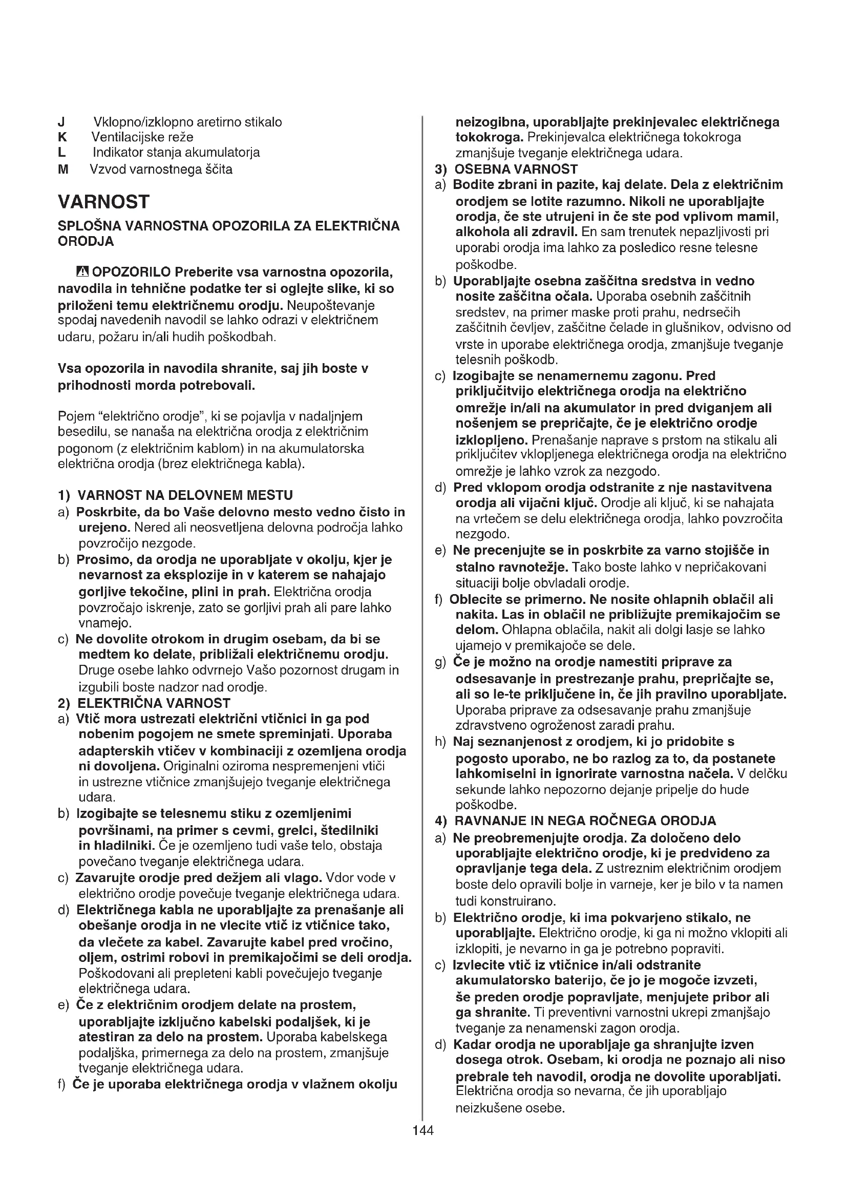 a) Ne preobremenjujte orodja. Za določeno delo uporabljajte električno orodje, ki je predvideno za opravljanje tega dela. Z ustreznim električnim orodjem boste delo opravili bolje in varneje, ker je bilo v ta namen tudi konstruirano. b) Električno orodje, ki ima pokvarjeno stikalo, ne uporabljajte. Električno orodje, ki ga ni možno vklopiti ali izklopiti, je nevarno in ga je potrebno popraviti. c) Izvlecite vtič iz vtičnice in/ali odstranite akumulatorsko baterijo, če jo je mogoče izvzeti, še preden orodje popravljate, menjujete pribor ali ga shranite. Ti preventivni varnostni ukrepi zmanjšajo tveganje za nenamenski zagon orodja. d) Kadar orodja ne uporabljaje ga shranjujte izven dosega otrok. Osebam, ki orodja ne poznajo ali niso prebrale teh navodil, orodja ne dovolite uporabljati. Električna orodja so nevarna, če jih uporabljajo neizkušene osebe. J Vklopno/izklopno aretirno stikalo K Ventilacijske reže L Indikator stanja akumulatorja M Vzvod varnostnega ščita VARNOST SPLOŠNA VARNOSTNA OPOZORILA ZA ELEKTRIČNA ORODJA - OPOZORILO Preberite vsa varnostna opozorila, navodila in tehnične podatke ter si oglejte slike, ki so priloženi temu električnemu orodju. Neupoštevanje spodaj navedenih navodil se lahko odrazi v električnem udaru, požaru in/ali hudih poškodbah. Vsa opozorila in navodila shranite, saj jih boste v prihodnosti morda potrebovali. Pojem “električno orodje”, ki se pojavlja v nadaljnjem besedilu, se nanaša na električna orodja z električnim pogonom (z električnim kablom) in na akumulatorska električna orodja (brez električnega kabla).
