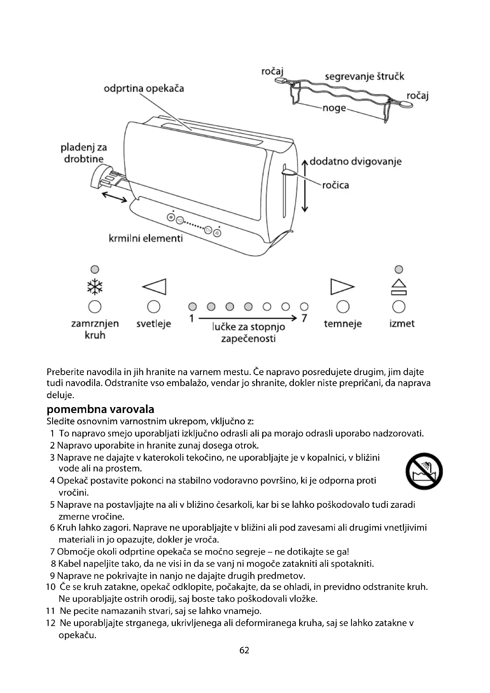 Opekač kruha je namenjen predvsem kruhu. Izogibajte se pečenju predebelih ali mokrih živil, ki bi lahko zamašila režami.