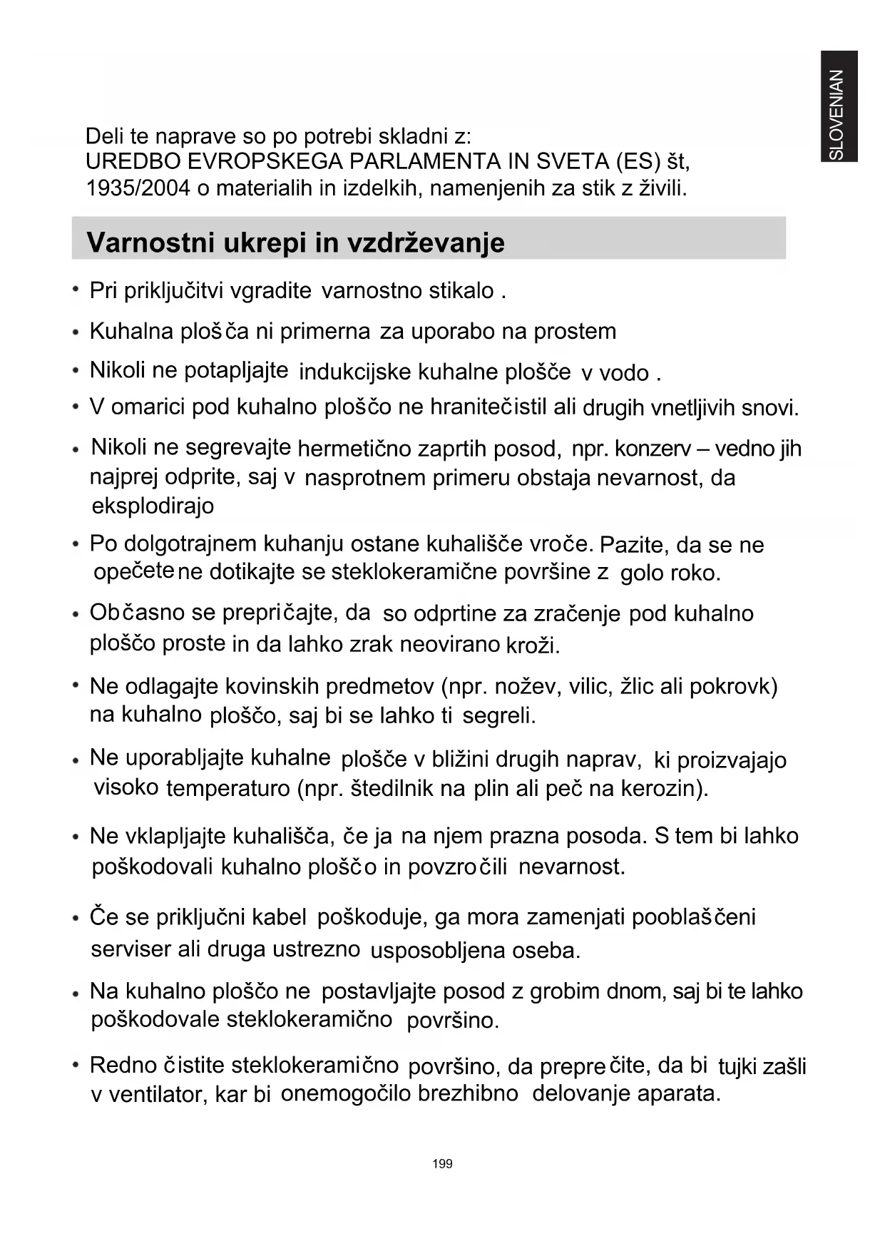 - Indukcijski kuhalni plošči lahko nastavite največjo raven moči, pri čemer lahko izbirate med različnimi ravnmi. SLOVENIAN 209ýišþenje in vzdrževanje ýišþenje indukcijske kuhalne plošþe je povsem enostavno: Vrsta neþistoþe ýišþenje Pripomoþek za þišþenje Manj umazana površina Namoþite z vroþo vodo in obrišite do suhega Gobica Madeži in sledi vodnega kamna Nanesite malo belega kisa na madež, obrišite z mehko krpo ali uporabite namensko þistilo Posebna lepilna folija za steklokeramiko Staljeni sladkor, alu- filija ali plastika Neþistoþo odstranite s posebnim strgalom za steklokeramiko (najboljša so silikonska) Posebna lepilna folija za steklokeramiko Opomba: Pred þišþenjem izklopite aparat. Prikaz in odpravljanje nepravilnosti v delovanju Napaka Možni razlogi Rešitev F0/F1/F2 okvara ventilatorja obrnite se na pooblašþeni servis F3-F8 okvara senzorja temperature obrnite se na pooblašþeni servis E1/E2 neustrezna elektriþna napetost preverite elektriþno napajanje, nato ponovno vklopite aparat E3/E4 nepravilna temperatura preverite ustreznost posode E5/E6 nezadostna toplota ponovno vklopite aparat potem, ko se je shladil V zgornji razpredelnici je naveden seznam najbolj pogostih nepravilnosti v delovanju. Indukcijske kuhalne plošþe nikoli ne razstavljajte sami, saj bi lahko povzroþili še hujšo okvaro. Servisiranje ýe se kuhalna plošþa pokvari: - najprej preverite, da je pravilno prikljuþena na elektriþno omrežje; nato - poskusite odpraviti napako s pomoþjo zgornje razpredelnice. ýe vam problema ne uspe odpraviti, izkljuþite kuhalno plošþo iz elektriþnega omrežja. Ne poskušajte je sami popraviti, ampak se obrnite na najbližji pooblašþeni servis. Pridržujemo si pravico do sprememb brez predhodnega obvestila in do tiskarskih napak. Izdelek je oznaþen skladno z direktivo evropske Gospodarske zbornice 2012/19 o odpadni elektriþni in elektronski opremi (WEEE). S pravilnim naþinom odstranjevanja izdelka boste pomagali prepreþiti morebitne negativne posledice na okolje in zdravje ljudi, ki bi jih lahko povzroþilo nepravilno odstranjevanje aparata. Simbol na izdelku oznaþuje, da s tem izdelkom ni dovoljeno ravnati kot z obiþajnimi gospodinjskimi odpadki. Izdelek odpeljite na ustrezno zbirno mesto za predelavo elektriþne in elektronske opreme. Odstranjevanje mora biti opravljeno skladno z lokalnimi okoljevarstvenimi predpisi o odstranjevanju odpadkov.Za podrobnejše informacije o odstranjevanju in predelavi tega izdelka se obrnite na pristojen mestni organ za odstranjevanje odpadkov, komunalno službo ali trgovino, v kateri ste izdelek kupili. SLOVENIAN 211Označením tohto výrobku značkou na vlastnú zodpovednosť potvrdzujeme zhodu so všetkými relevantnými európskymi bezpečnostnými, zdravotnými a environmentálnymi požiadavkami, ktoré sa v právnych predpisoch vzťahujú na tento výrobok. V závislosti od aplikácie, diely tohto spotrebiča spĺňajú požiadavky: NARIADENIA (ES) č. 1935/2004 o materiáloch a predmetoch určených na styk s potravinami. Bezpečnostné upozornenia a údržba: