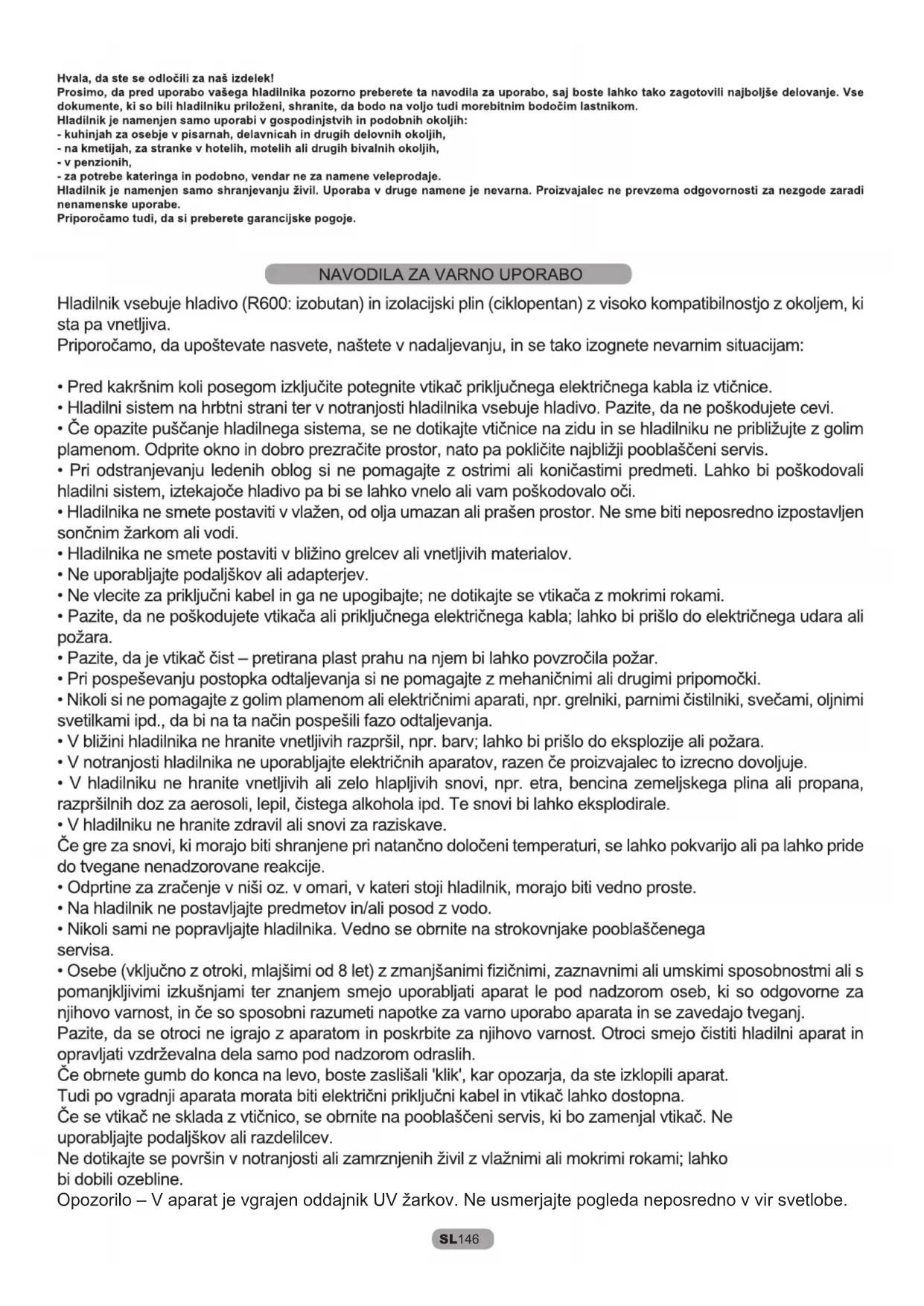 28 4 6SL 150 LED UVA luči (če je prisoten) Žarnice LED UVA aktivirajo titanov filter in sprožijo “fotokatalitsko” reakcijo, ta pa uniči bakterije, ki so prisotne v zraku v notranjosti hladilnika. Reakcija poteka, ko so vrata hladilnika zaprta, kar prepreči, da bi prečiščeni zrak uhajal na prosto. Pri ventiliranih modelih aparatov (Statični in Frost Free) je sistem vgrajen v ventilator (Sky Fan) in se aktivira vsakič, ko se zažene kompresor. Po 30 minutah delovanja antibakterijskega sistema v zraku ni bilo več zaznanih 99,9 % bakterij, ki smo jih zaradi testiranja vstavili v hladilnik. Pri modelih Total No Frost je sistem vgrajen v Sky Box in se aktivira vsakič, ko se zažene kompresor. Po 8 minutah delovanja antibakterijskega sistema v zraku ni bilo več zaznanih 99,9 % bakterij, ki smo jih zaradi testiranja vstavili v hladilnik. Filter je trajen in ga ni potrebno menjati.SL 151SL 152SL 153SL 154SL 155SL 15641042401 03/2017
