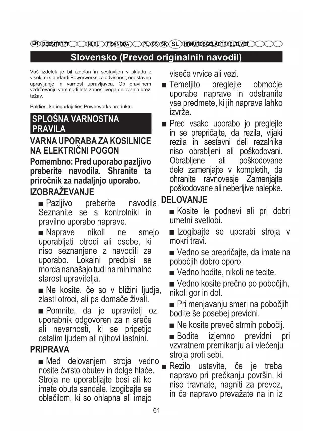HR HU RO BG EL AR TR HE LT LV ET Vaš izdelek je bil izdelan in sestavljen v skladu z visokimi standardi Powerworks za odvisnost, enostavno upravljanje in varnost upravljavca. Ob pravilnem vzdrževanju vam nudi leta zanesljivega delovanja brez težav. Paldies, ka iegādājāties Powerworks produktu.