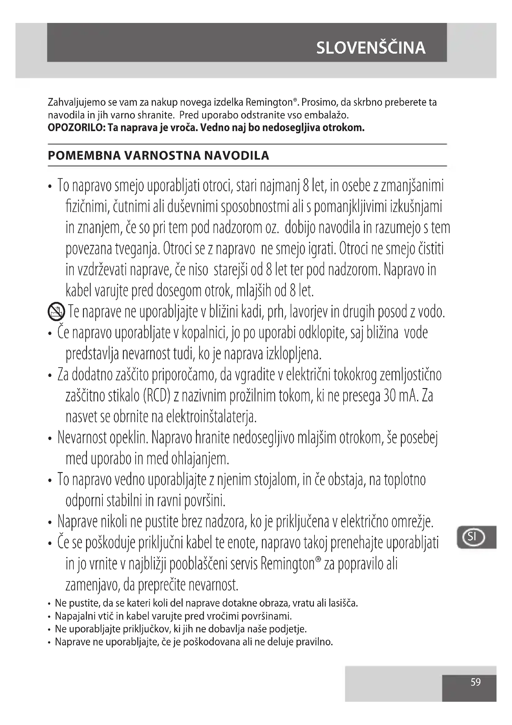 - Če se poškoduje priključni kabel te enote, napravo takoj prenehajte uporabljati in jo vrnite v najbližji pooblaščeni servis Remington® za popravilo ali zamenjavo, da preprečite nevarnost.