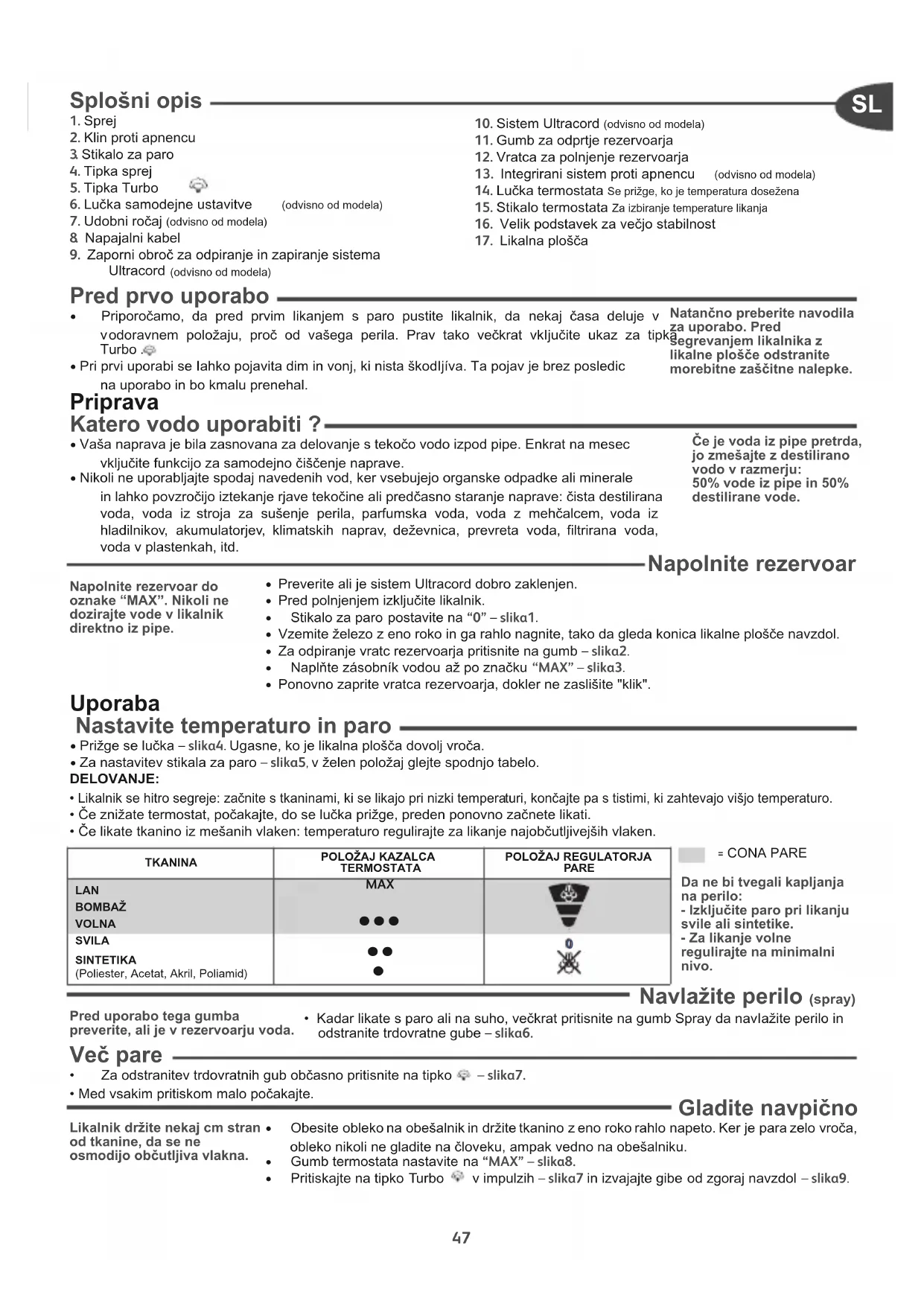 REŠITVE Skozi Iuknje v likalniplošči teče voda.Izbrana temperatura ne omogočanastajanja pare.Termostat nastavite na območje za paro (od ••do MAX).Paro uporabljate, ko likalnik še ni dovoljsegret.Počakajte, da ugasne lučka. repogosto uporabljate ukaz Turbo .Pred vsako uporabo počakajte nekaj sekund.Premočan pretok pare.Zmanjšajte pretok.Likalnik ste pospravili, ne da bi gapred tem izpraznili in ne da bi stikalopostavili na “0”.Poglejte poglavje “Pospravite likalnik”. Iz likalne plošče odte- kajo rjavkaste kapljice, ki povzročajo madeže na perilu. Uporabljate kemične proizvode za odstranjevanje vodnega kamna. Vodi v rezervoarju ne dodajajte nobenega kemičnega proizvoda. Ne uporabljate ustrezne vrste vode. Vključite samodejno čiščenje in preberite poglavje “Katero vodo uporabiti ?”. V Iuknjicah likalne plošče so se nabrala zoglenela tekstilna vlakna. Vključite samodejno čiščenje in z vlažno gobo očistite ploščo. Občasno posesajte Iuknje v likalni plošči. Likalna plošča je umazana ali rjava in Iahko omadežuje perilo. Uporabljate previsoko temperaturo. Očistite Iikalno pIoščo, kot je opisano zgoraj. Poglejte tabelo temperatur in regulirajte termostat. Vaše perilo ni dovolj izplaknjeno ali pa uporabljate škrob. Očistite Iikalno pIoščo, kot je opisano zgoraj. Škrob razpršite na nasprotni strani površine za likanje. Likalnik ustvarjapremalo ali nič pare.Rezervoar je prazen.Napolnite ga s tekočo vodo iz pipe.Klin proti apnencu je umazan.Očistite klin proti apnencu.V likalniku se je nabralo preveč vodnegakamna.Očistite klin proti apnencu in vključitesamodejno čiščenje.Likalniku ste predolgo uporabljali na suho.Vključite samodejno čiščenje. Likalna pIošča je opraskana ali poškodovana. Likalnik ste odložili s ploščo navzdol na kovinski podstavek. Likalnik vedno odložite v navpičen položaj. Voda izteka iz pokrovarezervoarja.Slabo ste zaprli vratca rezervoarja.Poglejte ali so vratca rezervoarja dobro zaprta (dokler ne zaslišite "klik"). Likalnik ustvarja para na koncu polnjenja rezervoarja. Stikalo za paro ni postavljeno na “0”. Prenehajte, če stikalo za paro ni postavljeno na “0”. Razpršilo ne razpršuje.Rezervoar za vodo ni dovolj napolnjen.Napolnite rezervoar za vodo.