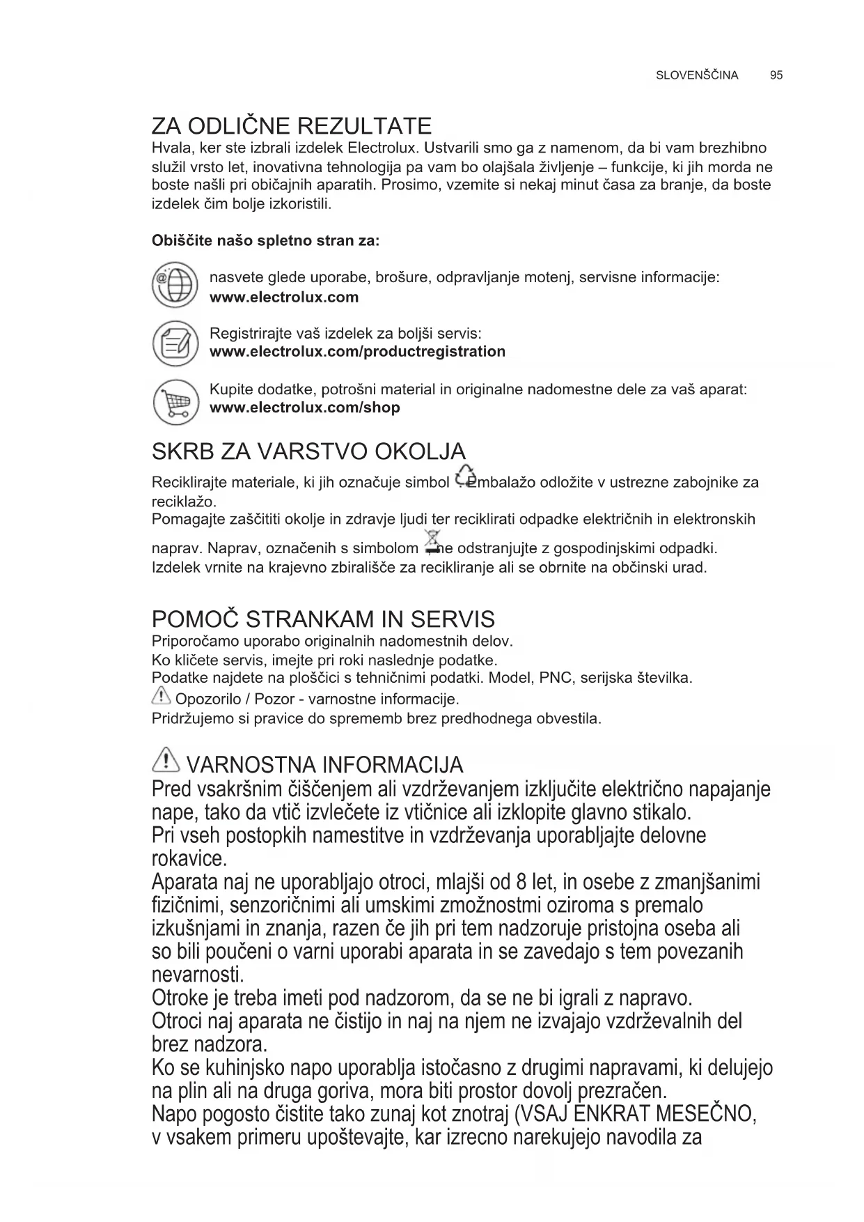 Hvala, ker ste izbrali izdelek Electrolux Ustvarili smo ga z namenom, da bi vam brezhibno služil vrsto let, inovativna tehnologija pa vam bo olajšala življenje – funkcije, ki jih morda ne boste našli pri običajnih aparatih. Prosimo, vzemite si nekaj minut časa za branje, da boste izdelek čim bolje izkoristili. Obiščite našo spletno stran za: nasvete glede uporabe, brošure, odpravljanje motenj, servisne informacije: www.electrolux.com Registrirajte vaš izdelek za boljši servis: www.electrolux.com/productregistration Kupite dodatke, potrošni material in originalne nadomestne dele za vaš aparat: www.electrolux.com/shop