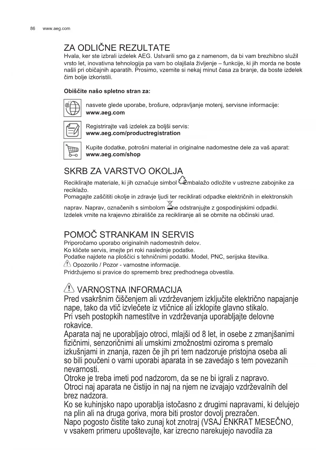 Priporočamo uporabo originalnih nadomestnih delov. Ko kličete servis, imejte pri roki naslednje podatke. Podatke najdete na ploščici s tehničnimi podatki. Model, PNC, serijska številka. Opozorilo / Pozor - varnostne informacije. Pridržujemo si pravice do sprememb brez predhodnega obvestila. VARNOSTNA INFORMACIJA Pred vsakršnim čiščenjem ali vzdrževanjem izključite električno napajanje nape, tako da vtič izvlečete iz vtičnice ali izklopite glavno stikalo. Pri vseh postopkih namestitve in vzdrževanja uporabljajte delovne rokavice. Aparata naj ne uporabljajo otroci, mlajši od 8 let, in osebe z zmanjšanimi zičnimi, senzoričnimi ali umskimi zmožnostmi oziroma s premalo izkušnjami in znanja, razen če jih pri tem nadzoruje pristojna oseba ali so bili poučeni o varni uporabi aparata in se zavedajo s tem povezanih nevarnosti. Otroke je treba imeti pod nadzorom, da se ne bi igrali z napravo. Otroci naj aparata ne čistijo in naj na njem ne izvajajo vzdrževalnih del brez nadzora. Ko se kuhinjsko napo uporablja istočasno z drugimi napravami, ki delujejo na plin ali na druga goriva, mora biti prostor dovolj prezračen. Napo pogosto čistite tako zunaj kot znotraj (VSAJ ENKRAT MESEČNO, v vsakem primeru upoštevajte, kar izrecno narekujejo navodila za
