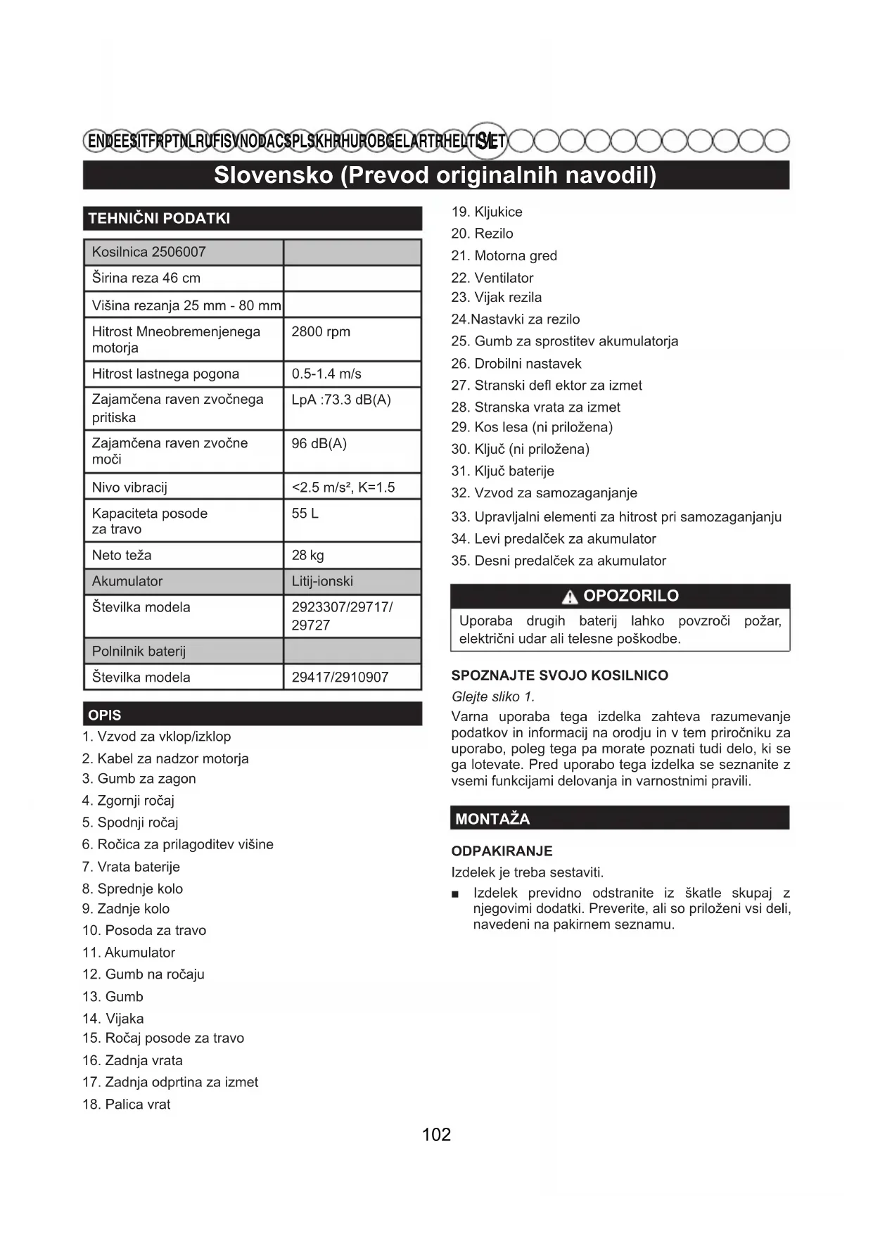 EN DE ES IT FR PT NL RU FI SV NO DA CS PL SK HR HU RO BG EL AR TR HE LT LV ET TEHNIČNI PODATKIKosilnica 2506007Širina reza 46 cmVišina rezanja 25 mm - 80 mmHitrost Mneobremenjenegamotorja2800 rpmHitrost lastnega pogona 0.5-1.4 m/sZajamčena raven zvočnega pritiskaLpA :73.3 dB(A)Zajamčena raven zvočne moči 96 dB(A)Nivo vibracij <2.5 m/s², K=1.5Kapaciteta posodeza travo 55 L Neto teža 28 kgAkumulator Litij-ionskiŠtevilka modela 2923307/29717/29727Polnilnik baterijŠtevilka modela 29417/2910907 OPIS 1. Vzvod za vklop/izklop2. Kabel za nadzor motorja3. Gumb za zagon4. Zgornji ročaj5. Spodnji ročaj6. Ročica za prilagoditev višine7. Vrata baterije8. Sprednje kolo9. Zadnje kolo10. Posoda za travo11. Akumulator12. Gumb na ročaju13. Gumb Vijaka15. Ročaj posode za travo16. Zadnja vrata17. Zadnja odprtina za izmet18. Palica vrat19. Kljukice20. Rezilo21. Motorna gred22. Ventilator23. Vijak rezila24.Nastavki za rezilo25. Gumb za sprostitev akumulatorja26. Drobilni nastavek27. Stranski defl ektor za izmet28. Stranska vrata za izmet29. Kos lesa (ni priložena)30. Ključ (ni priložena)31. Ključ baterije32. Vzvod za samozaganjanje 33. Upravljalni elementi za hitrost pri samozaganjanju34. Levi predalček za akumulator35. Desni predalček za akumulator OPOZORILO Uporaba drugih baterij lahko povzroči požar, električni udar ali telesne poškodbe. SPOZNAJTE SVOJO KOSILNICOGlejte sliko 1. Varna uporaba tega izdelka zahteva razumevanje podatkov in informacij na orodju in v tem priročniku za uporabo, poleg tega pa morate poznati tudi delo, ki se ga lotevate. Pred uporabo tega izdelka se seznanite z vsemi funkcijami delovanja in varnostnimi pravili.MONTAŽAODPAKIRANJEIzdelek je treba sestaviti. ■ Izdelek previdno odstranite iz škatle skupaj z njegovimi dodatki. Preverite, ali so priloženi vsi deli, navedeni na pakirnem seznamu. 102Slovensko (Prevod originalnih navodil)