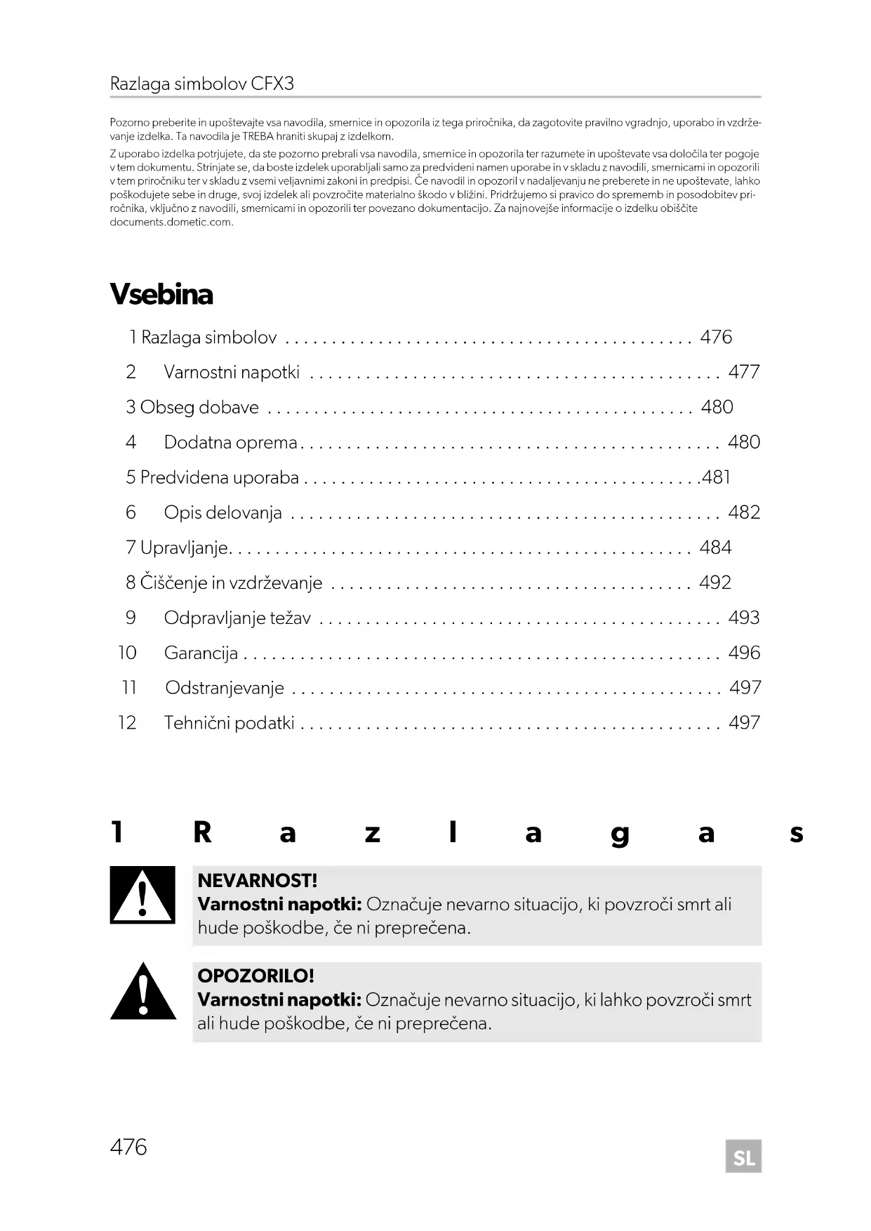 NEVARNOST! Varnostni napotki: Označuje nevarno situacijo, ki povzroči smrt ali hude poškodbe, če ni preprečena. OPOZORILO! Varnostni napotki: Označuje nevarno situacijo, ki lahko povzroči smrt ali hude poškodbe, če ni preprečena.SL CFX3 Varnostni napotki