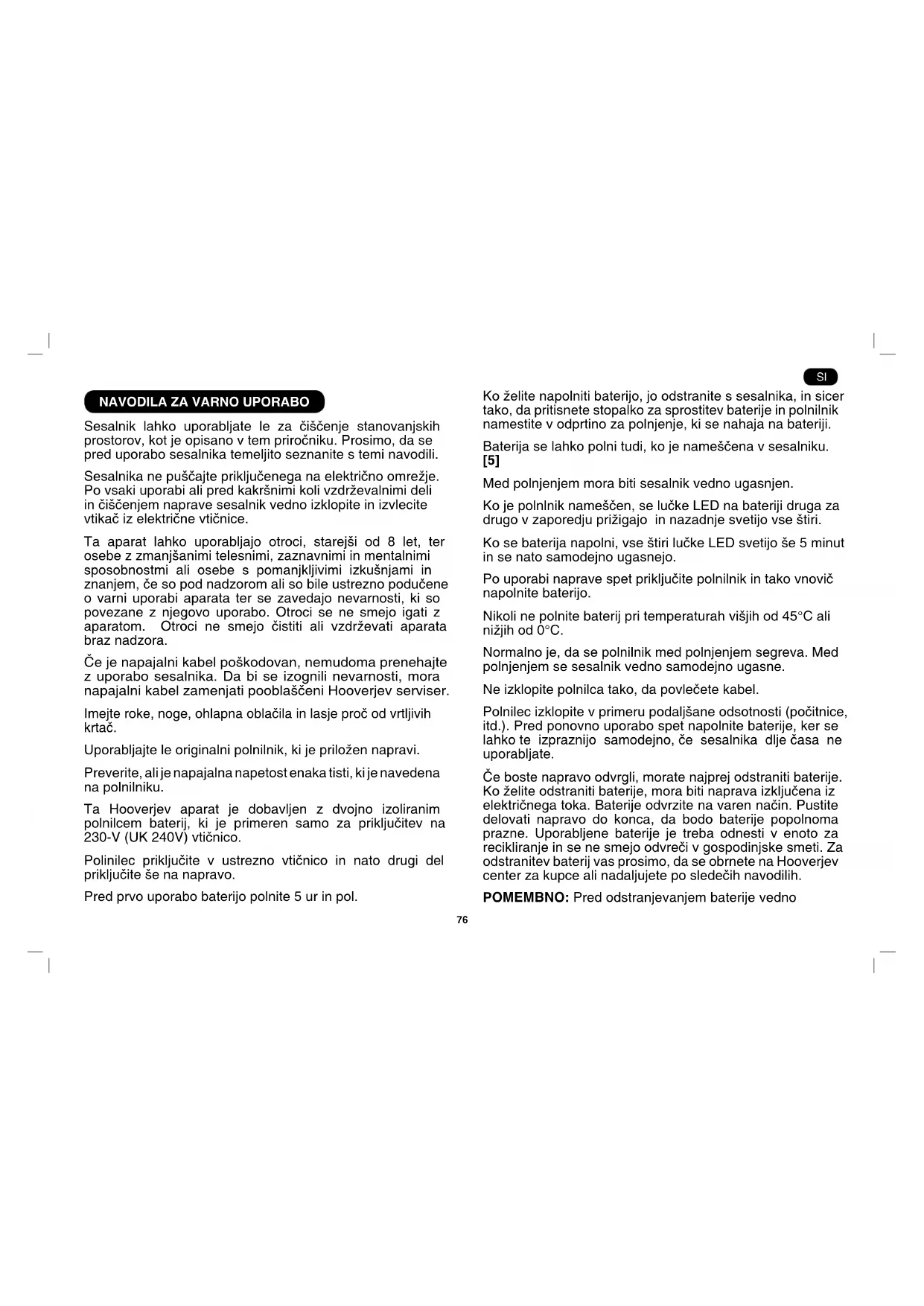 - Baterija: BAT18VLI 39800040 Kakovost HOOVERJeve tovarne so bile predmet neodvisnega ocenjevanja kakovosti. Naši izdelki so narejeni s pomočjo sistema kakovosti, ki izpolnjuje zahteve standarda ISO 9001. Vaša garancija Garancijski pogoji za to napravo so taki, kot jih določi zastopnik v državi, kjer je naprava prodana. Podrobnosti glede garancijskih pogojev lahko dobite od prodajalca, pri katerem ste napravo kupili. Če želite uveljavljati kakršno koli garancijo, potrebujete potrdilo o nakupu ali račun. POMEMBNO: Baterija tega sesalnika ima dvoletno garancijo, ta pa stopi v veljavo na dan nakupa. Po dveh letih je stranka sama odgovorna za nakup in plačilo nove baterije. Garancija se lahko spreminja brez predhodnega obvestila.
