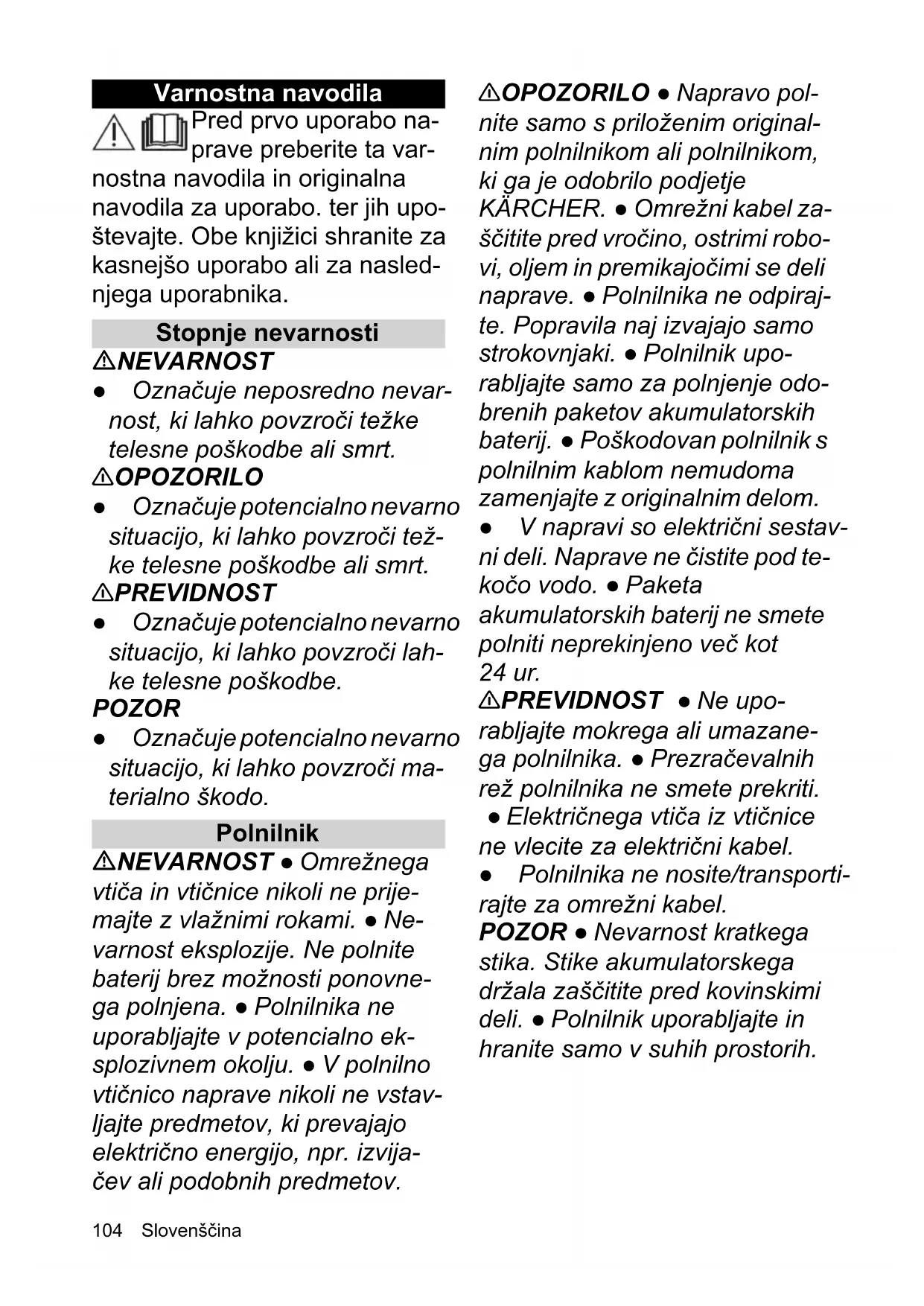 몇 PREVIDNOST ● Ne upo- rabljajte mokrega ali umazane- ga polnilnika. ● Prezračevalnih rež polnilnika ne smete prekriti. ● Električnega vtiča iz vtičnice ne vlecite za električni kabel. ● Polnilnika ne nosite/transporti- rajte za omrežni kabel. POZOR ● Nevarnost kratkega stika. Stike akumulatorskega držala zaščitite pred kovinskimi deli. ● Polnilnik uporabljajte in hranite samo v suhih prostorih.6ORYHQģÏLQD Akumulator NEVARNOST ● V polnilno vtičnico naprave nikoli ne vstav- ljajte predmetov, ki prevajajo električno energijo, npr. izvija- čev ali podobnih predmetov. ● Akumulatorske baterije ne iz- postavljajte močni sončni svetlo- bi, vročini in ognju. POZOR ● Ta naprava vsebuje akumulatorje, ki niso zamenljivi. Ne velja za naprave z zamenljivimi paketi akumulatorskih baterij Varna uporaba 몇 OPOZORILO ● Osebe ali otroci z zmanjšanimi telesnimi, čutnimi ali duševnimi sposobnostmi oziroma osebe, ki niso seznanjene s temi navodili, ne smejo uporabljati na- prave. ● Osebe z zmanjšanimi tele- snimi, čutnimi ali duševnimi sposobnostmi oziroma s pomanj- kljivimi izkušnjami in znanjem sme- jo uporabljati napravo samo pod ustreznim nadzorom ali če so jih osebe, pristojne za njihovo varnost, poučile o varni uporabi naprave in če razumejo potencialne nevarnos- ti. ● Otroci se ne smejo igrati z na- pravo. ● Otrokom preprečite igro z napra- vo. ● Napravo uporabljajte samo v skladu z namenom uporabe. Upo- števajte krajevne danosti in pri delu z napravo pazite na tretje osebe, zlasti na otroke. ● V območjih ne- varnosti (npr. na bencinskih posta- jah) upoštevajte ustrezne varnostne predpise. Naprave nikoli ne uporabljajte v po- tencialno eksplozivnih prostorih. ● Ne čistite predmetov, ki vsebujejo zdravju škodljive snovi (npr. az- best). ● Nevarnost poškodb. Raz- pršenega curka ne usmerite proti očem. 몇 PREVIDNOST ● Naprave ne uporabljajte po padcu, ob vidnih poškodbah ali netesnosti. ● Na- pravo uporabljajte in skladiščite samo v skladu z opisom oz. sli- ko. ● Naprave med delovanjem nikoli ne pustite brez nadzora. ● Da zagotovite stabilnost, na- pravo postavite na trdno ravno podlago. ● Prevrnitev naprave lahko povzroči nesrečo ali po- škodbe. Pred vsemi dejav- nostmi z ali na napravi zagotovite, da je naprava stabil- na. POZOR ● Ne dodajajte nobenih čistil ali drugih dodatkov. ● Po- škodbe naprave. V posodo za vodo nikoli ne nalivajte razredčil, tekočin z vsebnostjo razredčil ali nerazredčenih kislih (npr . čistil, bencina, razredčil za barve in acetona).
