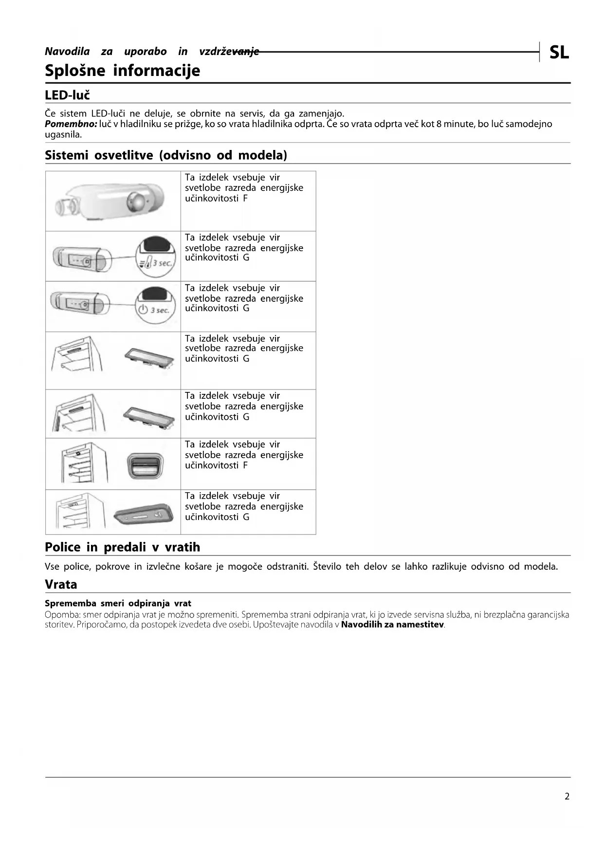 Splošne informacije LED-luč Če sistem LED-luči ne deluje, se obrnite na servis, da ga zamenjajo. Pomembno: luč v hladilniku se prižge, ko so vrata hladilnika odprta. Če so vrata odprta več kot 8 minute, bo luč samodejno ugasnila. Sistemi osvetlitve (odvisno od modela) Ta izdelek vsebuje vir svetlobe razreda energijske učinkovitosti F Ta izdelek vsebuje vir svetlobe razreda energijske učinkovitosti G Ta izdelek vsebuje vir svetlobe razreda energijske učinkovitosti G Ta izdelek vsebuje vir svetlobe razreda energijske učinkovitosti G Ta izdelek vsebuje vir svetlobe razreda energijske učinkovitosti G Ta izdelek vsebuje vir svetlobe razreda energijske učinkovitosti F Ta izdelek vsebuje vir svetlobe razreda energijske učinkovitosti G Police in predali v vratih Vse police, pokrove in izvlečne košare je mogoče odstraniti. Število teh delov se lahko razlikuje odvisno od modela. Vrata Sprememba smeri odpiranja vrat Opomba: smer odpiranja vrat je možno spremeniti. Sprememba strani odpiranja vrat, ki jo izvede servisna služba, ni brezplačna garancijska storitev. Priporočamo, da postopek izvedeta dve osebi. Upoštevajte navodila v Navodilih za namestitev.Navodila za uporabo in vzdrževanje