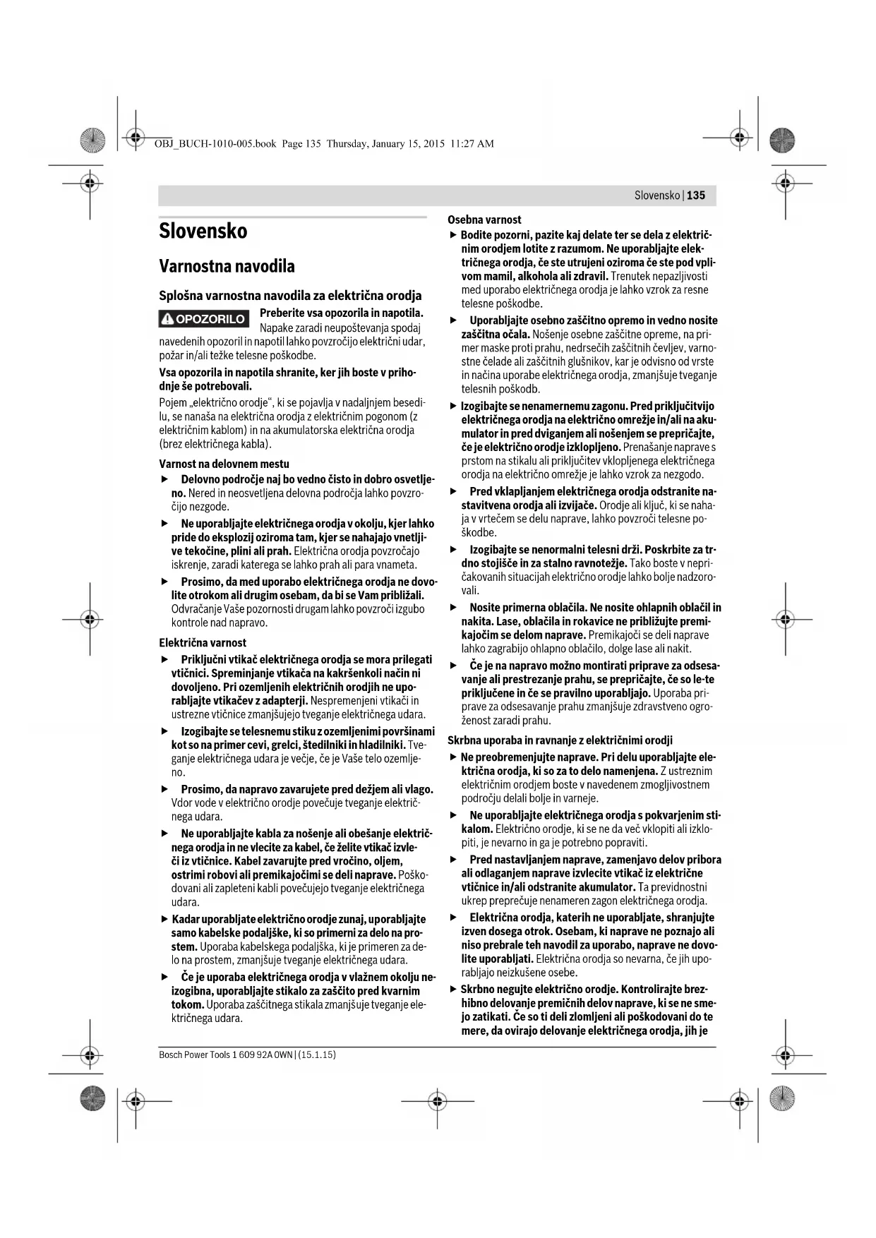 Servisna služba i savetovanje o upotrebi Servisna služba odgovoriće na vaša pitanja o popravcima i održavanju vašeg proizvoda i o rezervnim delovima. Uvećane crteže i informacije o rezervnim delovima možete naći na našoj adresi: www.bosch-pt.com Bosch tim za savetovanje o upotrebi će vam rado pomoći ako imate pitanja o našim proizvodima i priboru. Molimo navedite neizostavno kod svih pitanja i naručivanja rezervnih delova broj predmeta sa 10 brojčanih mesta prema tipskoj tablici električnog alata. Srpski Bosch-Service Dimitrija Tucovića 59 11000 Beograd Tel.: (011) 6448546 Fax: (011) 2416293 E-Mail: asboschz@EUnet.yu Transport Akumulatori koji sadrže litijum jon podležu zahtevima prava o opasnim materijama. Akumulatore može korisnik transportovati na putu bez drugih pakovanja. Kod slanja preko trećih lica (na primer vazdušnih transportom ili špedicijom) mora se obratiti pažnja na posebne zahteve u pogledu pakovanja i označavanja. Ovde se mora pozvati kod pripreme komada za slanje ekspert za opasne materije. Šaljite akumuatore samo ako kućište nije oštećeno. Odlepite otvorene kontakte i upakujte akumulator tako, da se ne pokreće u paketu. Molimo da obratite pažnju na eventualne dalje nationalne propise. Uklanjanje djubreta Električne alate, akumulatore, pribor i pakovanja treba odvoziti reciklaži koja odgovara zaštiti čovekove sredine. Ne bacajte električne alate i akumulatore/baterije u kućno djubre! Samo za EU-zemlje: Prema evropskoj smernici 2012/19/EU ne moraju više neupotrebljivi električni uredjaji a prema evropskoj smernici 2006/66/EC ne moraju ni akumulatori/ba- trerije koji su u kvaru ili istrošeni da se odvojeno sakupljaju i odvoze reciklaži koja odgovara zaštiti čovekove sredine. Akku/baterije: Li-jonska: Molimo da obratite pažnju na uputstva u odeljku „Transport“, stranici 134. Zadržavamo pravo na promene. OBJ_BUCH-1010-005.book Page 134 Thursday, January 15, 2015 11:27 AMSlovensko | 135 Bosch Power Tools 1 609 92A 0WN | (15.1.15) Slovensko Varnostna navodila Splošna varnostna navodila za električna orodja Preberite vsa opozorila in napotila. Napake zaradi neupoštevanja spodaj navedenih opozoril in napotil lahko povzročijo električni udar, požar in/ali težke telesne poškodbe. Vsa opozorila in napotila shranite, ker jih boste v priho- dnje še potrebovali. Pojem „električno orodje“, ki se pojavlja v nadaljnjem besedi- lu, se nanaša na električna orodja z električnim pogonom (z električnim kablom) in na akumulatorska električna orodja (brez električnega kabla). Varnost na delovnem mestu Delovno področje naj bo vedno čisto in dobro osvetlje- no. Nered in neosvetljena delovna področja lahko povzro- čijo nezgode. Ne uporabljajte električnega orodja v okolju, kjer lahko pride do eksplozij oziroma tam, kjer se nahajajo vnetlji- ve tekočine, plini ali prah. Električna orodja povzročajo iskrenje, zaradi katerega se lahko prah ali para vnameta. Prosimo, da med uporabo električnega orodja ne dovo- lite otrokom ali drugim osebam, da bi se Vam približali. Odvračanje Vaše pozornosti drugam lahko povzroči izgubo kontrole nad napravo. Električna varnost Priključni vtikač električnega orodja se mora prilegati vtičnici. Spreminjanje vtikača na kakršenkoli način ni dovoljeno. Pri ozemljenih električnih orodjih ne upo- rabljajte vtikačev z adapterji. Nespremenjeni vtikači in ustrezne vtičnice zmanjšujejo tveganje električnega udara. Izogibajte se telesnemu stiku z ozemljenimi površinami kot so na primer cevi, grelci, štedilniki in hladilniki. Tve- ganje električnega udara je večje, če je Vaše telo ozemlje- no. Prosimo, da napravo zavarujete pred dežjem ali vlago. Vdor vode v električno orodje povečuje tveganje električ- nega udara. Ne uporabljajte kabla za nošenje ali obešanje električ- nega orodja in ne vlecite za kabel, če želite vtikač izvle- či iz vtičnice. Kabel zavarujte pred vročino, oljem, ostrimi robovi ali premikajočimi se deli naprave. Poško- dovani ali zapleteni kabli povečujejo tveganje električnega udara. Kadar uporabljate električno orodje zunaj, uporabljajte samo kabelske podaljške, ki so primerni za delo na pro- stem. Uporaba kabelskega podaljška, ki je primeren za de- lo na prostem, zmanjšuje tveganje električnega udara. Če je uporaba električnega orodja v vlažnem okolju ne- izogibna, uporabljajte stikalo za zaščito pred kvarnim tokom. Uporaba zaščitnega stikala zmanjšuje tveganje ele- ktričnega udara. Osebna varnost Bodite pozorni, pazite kaj delate ter se dela z električ- nim orodjem lotite z razumom. Ne uporabljajte elek- tričnega orodja, če ste utrujeni oziroma če ste pod vpli- vom mamil, alkohola ali zdravil. Trenutek nepazljivosti med uporabo električnega orodja je lahko vzrok za resne telesne poškodbe. Uporabljajte osebno zaščitno opremo in vedno nosite zaščitna očala. Nošenje osebne zaščitne opreme, na pri- mer maske proti prahu, nedrsečih zaščitnih čevljev, varno- stne čelade ali zaščitnih glušnikov, kar je odvisno od vrste in načina uporabe električnega orodja, zmanjšuje tveganje telesnih poškodb. Izogibajte se nenamernemu zagonu. Pred priključitvijo električnega orodja na električno omrežje in/ali na aku- mulator in pred dviganjem ali nošenjem se prepričajte, če je električno orodje izklopljeno. Prenašanje naprave s prstom na stikalu ali priključitev vklopljenega električnega orodja na električno omrežje je lahko vzrok za nezgodo. Pred vklapljanjem električnega orodja odstranite na- stavitvena orodja ali izvijače. Orodje ali ključ, ki se naha- ja v vrtečem se delu naprave, lahko povzroči telesne po- škodbe. Izogibajte se nenormalni telesni drži. Poskrbite za tr- dno stojišče in za stalno ravnotežje. Tako boste v nepri- čakovanih situacijah električno orodje lahko bolje nadzoro- vali. Nosite primerna oblačila. Ne nosite ohlapnih oblačil in nakita. Lase, oblačila in rokavice ne pribli