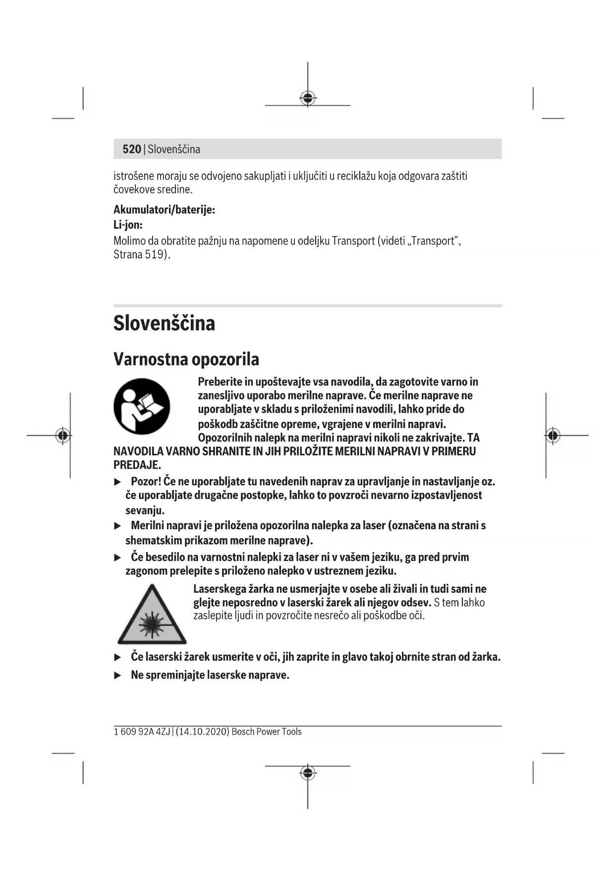 Frekvenčni pas med delovanjem 2402–2480MHz 2402–2480MHz Najv. moč oddajanja signala 8mW 8mW A) Pri merjenju od sprednjega roba merilne naprave velja za visoko odbojnost ciljne površine (npr. prebeljena stena), šibko osvetlitev ozadja in delovno temperaturo 25°C. Prav tako je treba upoštevati odstopanje zaradi razdalje ±0,05mm/m. B) Pri merjenju od sprednjega roba merilne naprave velja za visoko odbojnost ciljne površine (npr. prebeljena stena), močno osvetlitev ozadja in delovno temperaturo 25°C. Prav tako je treba upoštevati odstopanje zaradi razdalje ±0,15mm/m. C) Po umerjanju pri 0° in 90° je treba upoštevati še dodatno napako nagiba ±0,01°/stopinjo do največ 45° (najv.). Kot referenčna raven za merjenje nagiba se uporablja leva stran merilne naprave. D) Pri delovni temperaturi 25°C E) Pri neprekinjenem merjenju je največja delovna temperatura +40 °C. F) Nastane samo neprevodna umazanija, vendar lahko kljub temu občasno pride do prevodnosti, ki jo povzroči kondenzat. G) Funkcija Bluetooth® je izklopljena H) Pri napravah s funkcijo Bluetooth® Low Energy glede na model in operacijski sistem morda ni možno vzpostaviti povezave. Naprave s funkcijo Bluetooth® morajo podpirati protokol GATT. Za nedvoumno identifikacijo vaše merilne naprave je na tipski ploščici navedena serijska številka(11). 1 609 92A 4ZJ | (14.10.2020) Bosch Power ToolsSlovenščina | 527 Vmesnik Bluetooth® Prenos podatkov na druge naprave Merilna naprava je opremljena z modulom Bluetooth®, ki omogoča radijski prenos podatkov na določene prenosne naprave z vmesnikom Bluetooth® (npr. pametni telefon, tablični računalnik). Informacije o potrebnih sistemskih pogojih za povezavo Bluetooth® so vam na voljo na Boschevi spletni strani www.bosch-pt.com. u Več informacij vam je na voljo na Boschevi strani z izdelki. Pri prenosu podatkov s funkcijo Bluetooth® lahko pride do časovnih zakasnitev med končno mobilno napravo in merilno napravo. To je lahko odvisno od medsebojne oddaljenosti obeh naprav ali od objekta meritev. Vklop vmesnika Bluetooth® za prenos podatkov na končno mobilno napravo Prepričajte se, da je vmesnik Bluetooth® na vaši mobilni končni napravi vklopljen. Pritisnite tipko(1), da prikličete meni Bluetooth® in nato znova pritisnite tipko(1) (ali tipko(6) [+]), da vklopite vmesnik Bluetooth®. Če je najdenih več aktivnih merilnih naprav, na podlagi serijske številke izberite ustrezno merilno napravo. Serijska številka(11) je navedena na tipski ploščici merilne naprave. Stanje povezave in aktivna povezava(b) sta prikazani v statusni vrstici(h) merilne naprave. Za razširitev nabora funkcij so vam na voljo aplikacije Bosch. Te si lahko prenesete iz ustreznih spletnih trgovin glede na svojo mobilno končno napravo. Izklop vmesnika Bluetooth® Pritisnite tipko(1), da prikličete meni Bluetooth® in nato znova pritisnite tipko(1) (ali tipko(3) [–]), da izklopite vmesnik Bluetooth®. Namestitev Namestitev/menjava baterij Pri uporabi merilne naprave priporočamo uporabo alkalnih manganskih baterij ali nikelj- kovinsko hidridnih akumulatorskih baterij (še posebej pri nizkih temperaturah delovanja). Z 1,2-voltnimi akumulatorskimi baterijami se lahko glede na zmogljivost mogoče izvede več merjenj pri 1,5-voltnih baterijah. Za odpiranje pokrova predala za baterije(13) pritisnite na blokirni mehanizem(12) in snemite pokrov predala za baterije. Vstavite baterije oz. akumulatorske baterije. Pri tem Bosch Power Tools 1 609 92A 4ZJ | (14.10.2020)528 | Slovenščina pazite na pravilno polariteto baterij, ki mora ustrezati skici na notranji strani predala za baterije. Pri nizkem stanju napolnjenosti baterij oz. akumulatorskih baterij se na zaslonu prikaže poziv za vklop načina varčevanja z baterijami. Pri aktivnem načinu varčevanja z baterijami se podaljša čas delovanja baterij in simbol za baterije na zaslonu je obkrožen z rumeno(glejte „Meni „Nastavitve“ (glejte slikoC)“, Stran530). Ko se na zaslonu prvič prikaže prazen simbol za baterije, je možno opraviti še omejeno število meritev. Ko je prikazan prazen simbol za baterije v rdeči barvi, meritev ni več mogoče opravljati. Zamenjajte baterije oz. akumulatorske baterije. Zamenjati morate vedno vse baterije oz. akumulatorske baterije. Uporabite samo baterije ali akumulatorske baterije enega proizvajalca in z enako kapaciteto. u Če merilne naprave dlje časa ne boste uporabljali, iz nje odstranite baterije oz. akumulatorske baterije. Baterije in akumulatorske baterije lahko pri daljšem skladiščenju korodirajo in se samodejno izpraznijo. Vstavljanje/menjava litij-ionske akumulatorske baterije (pribor) Vstavite litij-ionsko akumulatorsko baterijo(24) (glejte slikoA). Litij-ionsko akumulatorsko baterijo(24) odstranite tako, da pritisnete blokado(25) in litij-ionsko akumulatorsko baterijo odstranite. Delovanje Polnjenje litij-ionske akumulatorske baterije (pribor) Opomba: akumulatorska baterija je ob dobavi delno napolnjena. Da zagotovite polno moč akumulatorske baterije, jo pred prvo uporabo popolnoma napolnite. Vhod USB za priključek kabla USB(26) in kontrolna lučka za polnjenje sta pod pokrovom vhoda USB(27) na litij-ionski akumulatorski bateriji(24) (pribor). Odprite pokrov vhoda USB(27) in priključite kabel USB(26). Med postopkom polnjenja lahko prikaz napolnjenosti baterij na zaslonu odstopa od dejanskega stanja napolnjenosti litij-ionske akumulatorske baterije(24). Če je litij-ionska akumulatorska baterija(24) popolnoma napolnjena, kontrolna lučka za polnjenje sveti zeleno. Med polnjenjem kontrolna lučka sveti rumeno. Rdeča kontrolna lučka pomeni, da polnilna napetost ali polnilni tok nista primerna. 1 609 92A 4ZJ | (14.10.2020) Bosch Power ToolsSlovenščina | 529 Uporaba u Vklopljene merilne naprave nikoli ne puščajte brez nadzora. Po uporabi jo izklopite. Laserski žarek lahko zaslepi druge osebe. u Merilno napravo zavarujte pred vlago in neposrednim sončnim sevanjem. u Mer
