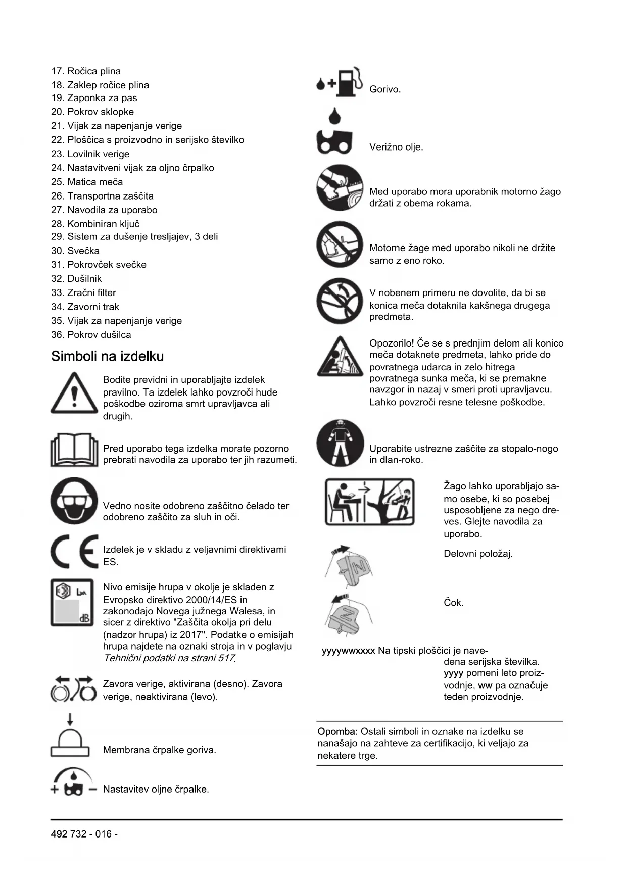 Zavora verige, aktivirana (desno). Zavora verige, neaktivirana (levo). Membrana črpalke goriva. Nastavitev oljne črpalke. Gorivo. Verižno olje. Med uporabo mora uporabnik motorno žago držati z obema rokama. Motorne žage med uporabo nikoli ne držite samo z eno roko. V nobenem primeru ne dovolite, da bi se konica meča dotaknila kakšnega drugega predmeta. Opozorilo! Če se s prednjim delom ali konico meča dotaknete predmeta, lahko pride do povratnega udarca in zelo hitrega povratnega sunka meča, ki se premakne navzgor in nazaj v smeri proti upravljavcu. Lahko povzroči resne telesne poškodbe. Uporabite ustrezne zaščite za stopalo-nogo in dlan-roko. Žago lahko uporabljajo sa- mo osebe, ki so posebej usposobljene za nego dre- ves. Glejte navodila za uporabo. Delovni položaj. Čok. yyyywwxxxx Na tipski ploščici je nave- dena serijska številka. yyyy pomeni leto proiz- vodnje, ww pa označuje teden proizvodnje. Opomba: Ostali simboli in oznake na izdelku se nanašajo na zahteve za certifikacijo, ki veljajo za nekatere trge. 492 732 - 016 -Stopnja emisij Euro V OPOZORILO: Zaradi predelave motorja se razveljavi EU-homologacija tega izdelka. Varnost Varnostne definicije Spodnje definicije označujejo stopnjo resnosti posameznih opozorilnih besed. OPOZORILO: Poškodbe oseb. POZOR: Poškodbe izdelka. Opomba: Te informacije olajšajo uporabo izdelka. Splošna varnostna navodila OPOZORILO: Pred uporabo izdelka preberite navodila v povezavi z opozorili v nadaljevanju.