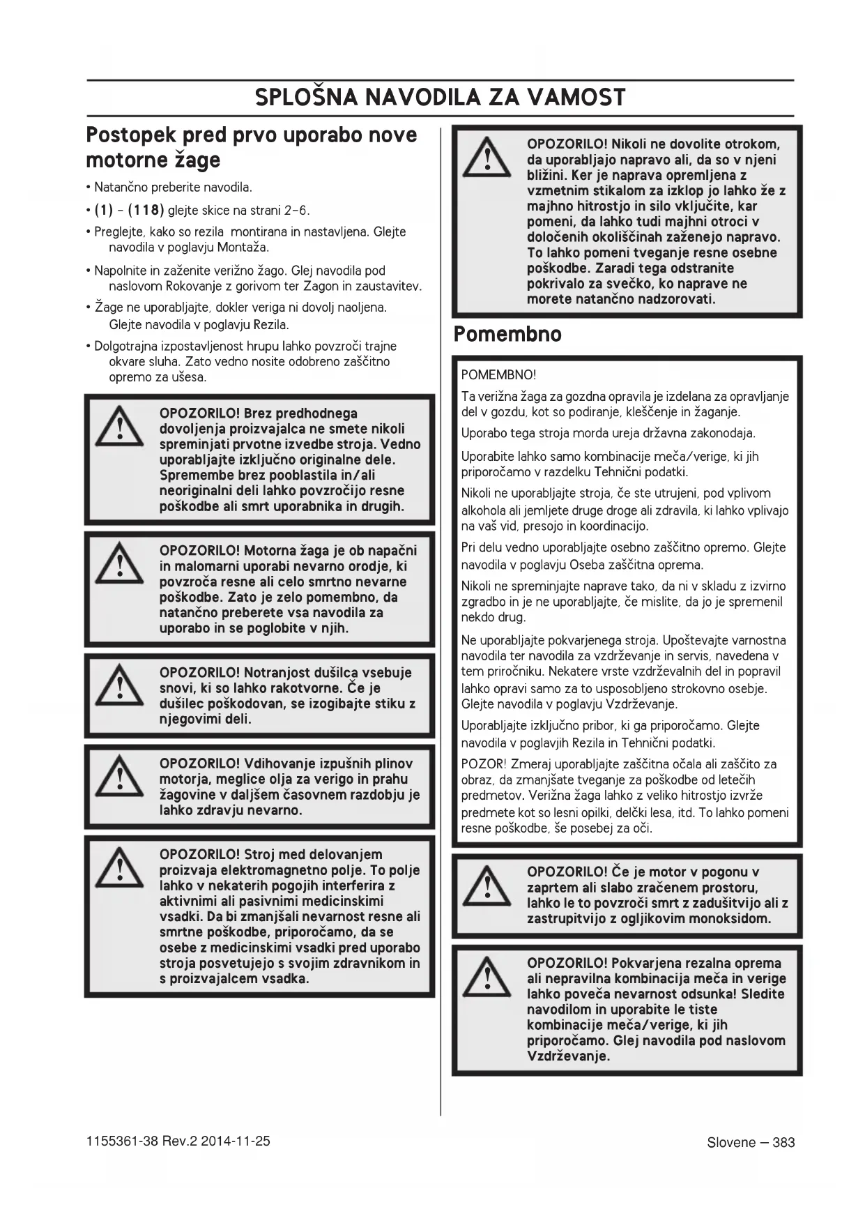 OPOZORILO! Pokvarjena rezalna oprema ali nepravilna kombinacija meãa in verige lahko poveãa nevarnost odsunka! Sledite navodilom in uporabite le tiste kombinacije meãa/verige, ki jih priporoãamo. Glej navodila pod naslovom VzdrÏevanje.SPLO·NA NAVODILA ZA VAMOST 384 – Slovene 1155361-38 Rev.2 2014-11-25 Zmeraj uporabljajte zdrav razum (2) Ni moÏno opisati vseh situacij, ki se lahko zgodijo pri uporabi veriÏne Ïage. Zmeraj bodite pazljivi in uporabljajte zdrav razum. Izogibajte se situacijam za katere menite, da so izven va‰ih zmoÏnosti. âe ste po branju teh navodil ‰e vedno negotovi o delovnih postopkih se pred nadaljevanjem posvetujte z izvedencem. V vsakem primeru kontaktirajte va‰ega prodajalca, ãe imate ‰e kakr‰nakoli vpra‰anja glede uporabe Ïag. Z veseljem vam bomo pomagali in svetovali ter pomagali, da boste veriÏno Ïago uporabljali uãinkovito in varno. âe je moÏno se udeleÏite usposabljanja za uporabo Ïage. Va‰ prodajalec, lesna ‰ola ali knjiÏnica vam lahko posredujejo informacije o usposabljanjih in literaturi, ki so na voljo. Nenehno delamo na izbolj‰avah zgradbe in tehnologije – izbolj‰ave, ki poveãajo va‰o varnost in uãinek. Redno obiskujte va‰ega prodajalca, da preverite kak‰no korist lahko imate od novih prednosti, ki bile vpeljane. Osebna za‰ãitna oprema