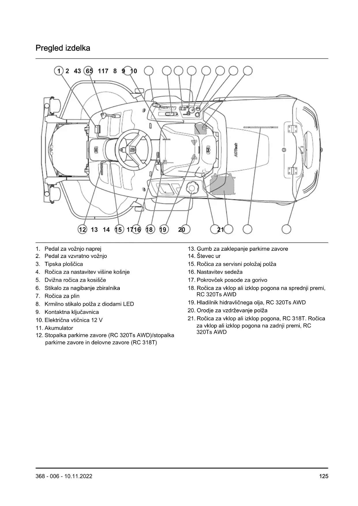 naklonom. Izdelka ne uporabljajte na pobočjih z naklonom, večjim od 10°. Na izdelku ali opremi ni dovoljeno prevažati potnikov. Zapeljite naprej. Nevtralno. Zapeljite vzvratno. Parkirna zavora, model RC 320Ts AWD. Delovna zavora in parkirna zavora, model RC 318T. Izklopite motor. Zaženite motor. Luči. Število vrtljajev motorja – veliko. Število vrtljajev motorja – majhno. Polž je v servisnem položaju. Kosišče ni nameščeno. Zbiralnik je poln. Loputa zbiralnika je odprta. Zbiralnik ni spuščen. Indikatorska lučka stanja za sistem polža. Nagnite in odprite zbiralnik. Spustite zbiralnik v delovni položaj. Gorivo. Najv. 10% etanola. Višina košnje. Servisni položaj za ročico za nastavitev višine košnje. Rezila so aktivirana. Rezila so deaktivirana. Servisni položaj za kosišče. Položaj za košnjo za kosišče. Polž je v delovnem položaju. Polž je v servisnem položaju. 128 368 - 006 - 10.11.2022Ne stopajte tukaj. Hidrostatična sklopka. Nivo olja. Nevarnost poškodb zaradi stisnjenja! Nevarnost poškodb zaradi stisnjenja! Izognite se stiku z ohišjem opreme. Vroča površina. Ne dotikajte se. Izdelek je v skladu z veljavnimi predpisi CE. Izdelek je v skladu z veljavnimi direktivami ZK. Emisija hrupa v okolje je skladna z direktivami in uredbami EU, ZK ter zakonodajo Novega južnega Walesa, in sicer z direktivo "Zaščita okolja pri delu (nadzor hrupa) iz 2017". Zajamčena raven zvočne moči izdelka je navedena na oznaki in v Tehničnih podatkih na strani Tehnični podatki na strani 158 in na oznaki. Vedno uporabljajte odobreno zaščito za sluh. yyyywwxxxxx Na tipski ploščici je navedena serijska številka. yyyy je proizvodno leto, ww je proizvodni teden in xxxx je serijska številka. Opomba: Ostali simboli in oznake na izdelku se nanašajo na zahteve za certifikacijo, ki veljajo za nekatere trge. Stopnja emisij Euro V OPOZORILO: Zaradi predelave motorja se razveljavi EU-homologacija tega izdelka. Odgovornost proizvajalca Kot je navedeno v zakonodaji, ki ureja odgovornost proizvajalca, ne prevzemamo nikakršne odgovornosti za poškodbe, ki bi jih naši izdelki povzročili v naslednjih primerih: