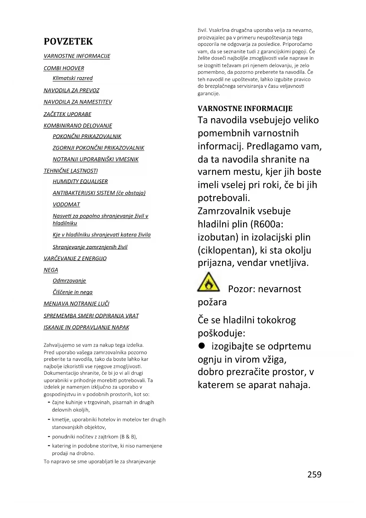 Termostaty, czujniki temperatury, płytki obwodów drukowanych przez okres co najmniej siedmiu lat od wprowadzenia do obrotu ostatniego egzemplarza danego modelu klamki, zawiasy do drzwi, tace i koszyki przez okres co najmniej siedmiu lat oraz uszczelki drzwiowe przez okres co najmniej 10 lat od wprowadzenia do obrotu ostatniego egzemplarza danego modelu Więcej informacji na temat produktu można znaleźć na stronie https://eprel.ec.europa.eu/ lub zeskanować QR na etykiecie energetycznej dostarczonej z urządzeniem259 Slovenščina POVZETEK VARNOSTNE INFORMACIJE COMBI HOOVER Klimatski razred NAVODILA ZA PREVOZ NAVODILA ZA NAMESTITEV ZAČETEK UPORABE KOMBINIRANO DELOVANJE POKONČNI PRIKAZOVALNIK ZGORNJI POKONČNI PRIKAZOVALNIK NOTRANJI UPORABNIŠKI VMESNIK TEHNIČNE LASTNOSTI HUMIDITY EQUALISER ANTIBAKTERIJSKI SISTEM (če obstaja) VODOMAT Nasveti za popolno shranjevanje živil v hladilniku Kje v hladilniku shranjevati katera živila Shranjevanje zamrznjenih živil VARČEVANJE Z ENERGIJO NEGA Odmrzovanje Čiščenje in nega MENJAVA NOTRANJE LUČI SPREMEMBA SMERI ODPIRANJA VRAT ISKANJE IN ODPRAVLJANJE NAPAK Zahvaljujemo se vam za nakup tega izdelka. Pred uporabo vašega zamrzovalnika pozorno preberite ta navodila, tako da boste lahko kar najbolje izkoristili vse njegove zmogljivosti. Dokumentacijo shranite, če bi jo vi ali drugi uporabniki v prihodnje morebiti potrebovali. Ta izdelek je namenjen izključno za uporabo v gospodinjstvu in v podobnih prostorih, kot so: - čajne kuhinje v trgovinah, pisarnah in drugih delovnih okoljih, - kmetije, uporabniki hotelov in motelov ter drugih stanovanjskih objektov, - ponudniki nočitev z zajtrkom (B & B), - katering in podobne storitve, ki niso namenjene prodaji na drobno. To napravo se sme uporabljati le za shranjevanje živil. Vsakršna drugačna uporaba velja za nevarno, proizvajalec pa v primeru neupoštevanja tega opozorila ne odgovarja za posledice. Priporočamo vam, da se seznanite tudi z garancijskimi pogoji. Če želite doseči najboljše zmogljivosti vaše naprave in se izogniti težavam pri njenem delovanju, je zelo pomembno, da pozorno preberete ta navodila. Če teh navodil ne upoštevate, lahko izgubite pravico do brezplačnega servisiranja v času veljavnosti garancije. VARNOSTNE INFORMACIJE Ta navodila vsebujejo veliko pomembnih varnostnih informacij. Predlagamo vam, da ta navodila shranite na varnem mestu, kjer jih boste imeli vselej pri roki, če bi jih potrebovali. Zamrzovalnik vsebuje hladilni plin (R600a: izobutan) in izolacijski plin (ciklopentan), ki sta okolju prijazna, vendar vnetljiva. Pozor: nevarnost požara Če se hladilni tokokrog poškoduje: izogibajte se odprtemu ognju in virom vžiga, dobro prezračite prostor, v katerem se aparat nahaja. Čas delovanja v odstotkih:260 OPOZORILO! Med čiščenjem/prenašanjem aparata pazite, da se ne dotaknete kovinskih žic kondenzatorja na zadnji strani aparata, saj si pri tem lahko poškodujete prste in roke ali pa povzročite poškodbe izdelka. Ta aparat ni namenjen za zlaganje pod ali na druge aparate. Ne poskušajte se usesti ali stopiti na vrh vašega aparata, saj ni temu namenjen. Pri tem lahko poškodujete sebe ali aparat. Pazite, da med prenašanjem ali prestavljanjem aparata pod njim ne ukleščite priključnega kabla, saj ga s tem lahko odrežete ali poškodujete. Pri nameščanju aparata pazite, da ne poškodujete talnih oblog, cevi, stenskih oblog ipd. Aparata ne prestavljajte tako, da ga vlečete za pokrov ali ročaj. Ne pustite otrokom, da bi se igrali z aparatom ali posegali v njegove nastavitve. Naša družba zavrača vsakršno odgovornost v primeru neupoštevanja navodil. Aparata ne nameščajte na vlažno, mastno ali prašno mesto in ne izpostavljajte ga neposredni sončni svetlobi ali vodi. Aparata ne nameščajte v bližino grelnikov ali vnetljivih materialov. V primeru izpada električne energije ne odpirajte pokrova. Če izpad ne traja dlje kot 20 ur, to ne bi smelo vplivati na zamrznjena živila. Če izpad električne energije traja dlje, živila preverite in jih takoj pojejte ali pa jih skuhajte in nato zamrznite. Če pokrov zamrzovalne skrinje težko odprete takoj po tem, ko ste ga pravkar zaprli, ne skrbite. To je posledica razlike v tlaku, ki se izenači in po261 nekaj minutah omogoči normalno odpiranje pokrova. Aparata ne priključujte na električno napajanje, dokler ne odstranite vseh zaščit, ki so bile potrebne zaradi pakiranja in prevoza. Preden aparat vključite, ga pustite najmanj 4 ure mirovati, da se olje v kompresorju posede, če ste aparat prevažali v vodoravni legi. Zamrzovalnik uporabljajte le za predvidene namene (in sicer za shranjevanje in zamrzovanje užitnih živil). V vinski vitrini ne shranjujte zdravil ali snovi za raziskovalne namene. Če snovi, ki jih shranjujete, zahtevajo strogi nadzor temperature shranjevanja, se lahko pokvarijo ali pa pride do nenadzorovane reakcije, ki je lahko nevarna. Pred kakršnimi koli posegi iztaknite vtič priključnega kabla iz omrežne vtičnice. Ob dostavi se prepričajte, da izdelek ni poškodovan ter da so vsi sestavni deli in dodatki brezhibno ohranjeni. Če opazite puščanje hladilnega sistema, se ne dotikajte stenske vtičnice in ne uporabljajte odprtega ognja. Odprite okno in prezračite prostor. Nato pokličite serviserja zaradi popravila. Ne uporabljajte podaljškov ali adapterjev. Priključnega kabla ne vlecite premočno in ne zvijajte ga ter ne dotikajte se vtiča z mokrimi rokami. Pazite, da ne poškodujete vtiča in/ali priključnega kabla, saj to lahko povzroči električni udar ali požar. Ne postavljajte ali shranjujte vnetljivih in zelo hlapnih snovi, kot so eter, bencin, UNP, propan, aerosolni262 razpršilci, lepila, čisti alkohol ipd. Te snovi lahko povzročijo eksplozijo. Če je električni kabel poškodovan, ga mora zamenjati izdelovalec, tehnik za servis ali podobno kvalificiran tehnik, da se izognete tveganju. V bližini vinske vitrine ne uporabljajte in ne shranjujte vne