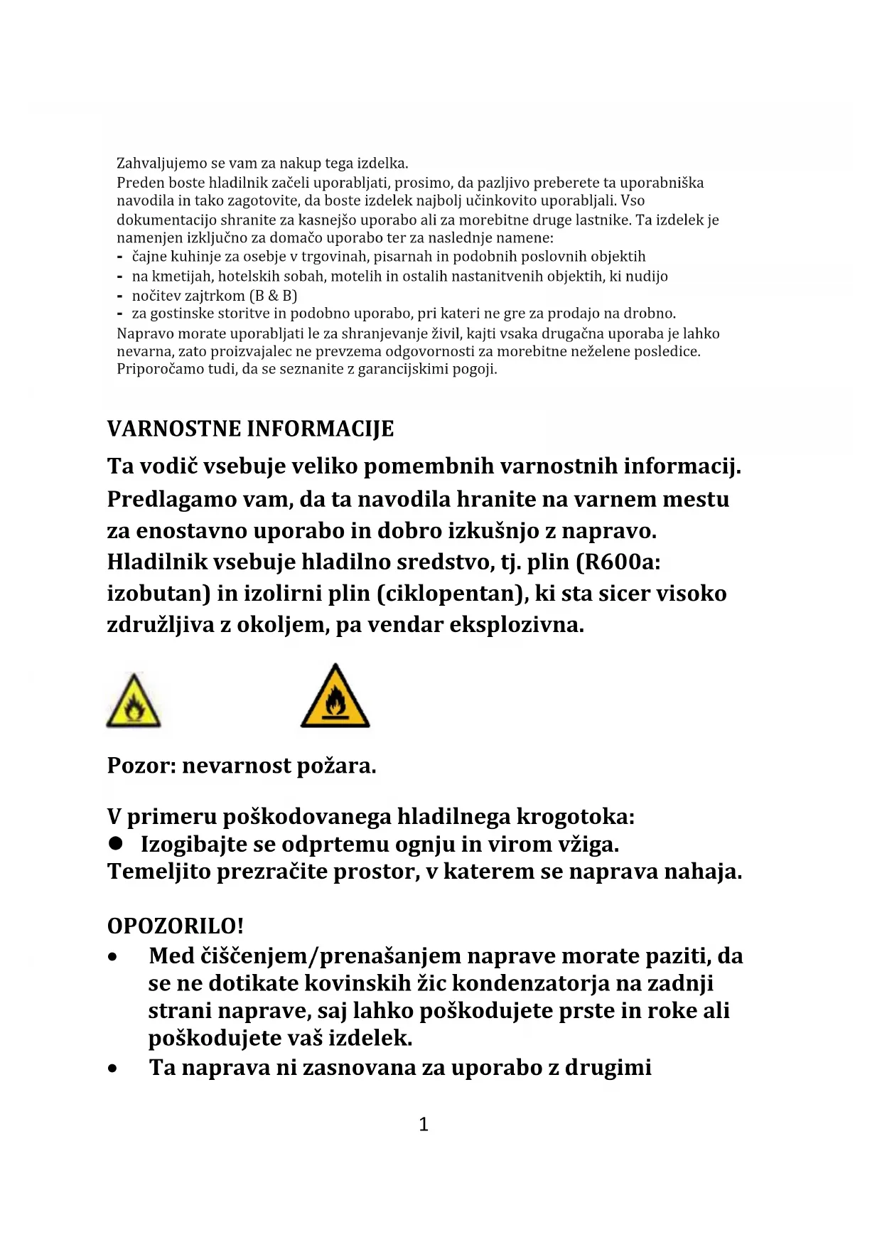 4.INSTALACIJA 5.VSAKODNEVNA UPORABA STRAN 1-8 STRAN 9 STRAN 10-12 STRAN 13-14 STRAN 15-201 Zahvaljujemo se vam za nakup tega izdelka. Preden boste hladilnik začeli uporabljati, prosimo, da pazljivo preberete ta uporabniška navodila in tako zagotovite, da boste izdelek najbolj učinkovito uporabljali. Vso dokumentacijo shranite za kasnejšo uporabo ali za morebitne druge lastnike. Ta izdelek je namenjen izključno za domačo uporabo ter za naslednje namene: - čajne kuhinje za osebje v trgovinah, pisarnah in podobnih poslovnih objektih - na kmetijah, hotelskih sobah, motelih in ostalih nastanitvenih objektih, ki nudijo - nočitev zajtrkom (B & B) - za gostinske storitve in podobno uporabo, pri kateri ne gre za prodajo na drobno. Napravo morate uporabljati le za shranjevanje živil, kajti vsaka drugačna uporaba je lahko nevarna, zato proizvajalec ne prevzema odgovornosti za morebitne neželene posledice. Priporočamo tudi, da se seznanite z garancijskimi pogoji. VARNOSTNE INFORMACIJE Ta vodič vsebuje veliko pomembnih varnostnih informacij. Predlagamo vam, da ta navodila hranite na varnem mestu za enostavno uporabo in dobro izkušnjo z napravo. Hladilnik vsebuje hladilno sredstvo, tj. plin (R600a: izobutan) in izolirni plin (ciklopentan), ki sta sicer visoko združljiva z okoljem, pa vendar eksplozivna. Pozor: nevarnost požara. V primeru poškodovanega hladilnega krogotoka: Izogibajte se odprtemu ognju in virom vžiga. Temeljito prezračite prostor, v katerem se naprava nahaja. Odstotek teka OPOZORILO! Med čiščenjem/prenašanjem naprave morate paziti, da se ne dotikate kovinskih žic kondenzatorja na zadnji strani naprave, saj lahko poškodujete prste in roke ali poškodujete vaš izdelek. Ta naprava ni zasnovana za uporabo z drugimi2 napravami. Ne poskušajte sedeti ali stati na napravi, ker ni zasnovana za tako uporabo. Lahko poškodujete sebe ali napravo. Prepričajte se, da se napajalni kabel med in po prenosu/premikanju naprave ne zatakne pod napravo, da preprečite, da bi se napajalni kabel prerezal ali poškodoval. Pri nameščanju naprave pazite, da ne poškodujete talnih oblog, cevi, stenskih oblog itd. Naprave ne premikajte z vlečenjem za pokrov ali ročaj. Ne dovolite otrokom, da se igrajo z napravo ali s krmilnimi elementi. Naše podjetje ne prevzema nobene odgovornosti, če ne upoštevate navodil. Naprave ne nameščajte v vlažne, zamaščene ali prašne predele, niti je ne izpostavljajte neposredni sončni svetlobi ali tekoči vodi. Naprave ne nameščajte blizu grelnikov ali vnetljivih snovi. Če pride do izpada elektrike, ne odpirajte pokrova. Če izpad traja manj kot 20 ur, to ne bo vplivalo na zamrznjeno hrano. Če izpad traja dalj časa, potem je hrano potrebno preveriti in pojesti ali pa skuhati in nato ponovno zamrzniti. Če ugotovite, da je pokrov zamrzovalne skrinje težko odpreti takoj potem ko ste ga zaprli, ne skrbite. To je posledica razlike v tlaku, ki se bo izenačil in omogočil normalno odpiranje pokrova po nekaj minutah. Naprave ne priključujte na električno napajanje, dokler ne odstranite vseh embalažnih in tranzitnih ščitnikov. Pred vklopom pustite napravo stati vsaj 4 ure, da se kompresorsko olje poravna, če se je naprava prevažala vodoravno.3 Ta zamrzovalna naprava se sme uporabljati samo za predviden namen (t.j. shranjevanje in zamrzovanje živil). V hladilnik za vino ne shranjujte zdravil ali materialov za znanstvene raziskave. Snov, ki zahteva natančen nadzor temperature shranjevanja bi se pri shranjevanju v tej napravi lahko začela kvariti ali nekontrolirano reagirati, kar bi privedlo do nevarne situacije. Pred vsakim posegom na napravi, odklopite napajalni kabel iz vtičnice. Ob dostavi preverite, ali je izdelek poškodovan in če so vsi deli in dodatki v brezhibnem stanju. Če opazite puščanje hladilnega sredstva, se nikakor ne dotikajte tega mesta in v nobenem primeru ne uporabljajte odprtega ognja. Odprite okno in prezračite prostor. Nato se s serviserjem posvetujte glede popravila. Za priklop naprave ne uporabljajte podaljškov ali adapterjev. Napajalnega kabla ne raztegujte prekomerno, niti ga pretirano ne upogibajte, vtikača pa se ne dotikajte z mokrimi rokami. Pazite, da vtikača ali napajalnega kabla ne boste poškodovali; to bi lahko privedlo do električnega udara ali požara. Če je napajalni kabel poškodovan, ga mora zamenjati proizvajalec, njegov serviser ali podobno usposobljena oseba, da preprečite nevarnost. Na napravo ne postavljajte, niti v njej ne shranjujte vnetljivih in možno hlapljivih snovi kot so eter, bencin, LPG plin, propan, aerosoli v razpršilu, lepila, čisti alkohol itd. Te snovi lahko povzročijo eksplozijo.4 Blizu hladilnika za vino ne uporabljajte ali shranjujte vnetljivih pršil, kot je na primer barva v pršilu. Lahko povzroči eksplozijo ali požar. Na napravo ne postavljajte predmetov in posod, napolnjenih z vodo. Ne priporočamo uporabe podaljševalnih vodnikov in večsmernih adapterjev. Naprave ne odstranjujte v ognju. Pazite, da pri prevozu in uporabi ne poškodujete hladilnega kroga/cevi naprave. V primeru poškodb ne izpostavljajte naprave ognju, morebitnemu viru vžiga in takoj prezračite sobo, v kateri se naprava nahaja. Hladilni sistem, nameščen v notranjosti in na zunanjem delu hladilnika za vino, vsebuje hladilno sredstvo. Zato pazite, da ne boste poškodovali napeljave. V notranjosti predelov za shranjevanje živil ne uporabljajte električnih naprav, razen če so tipa, priporočenega s strani proizvajalca. Ne poškodujte krogotoka hladilnega sredstva. Za pospeševanje procesa odmrzovanje ne uporabljajte mehanskih naprav ali drugih načinov, razen tisti, priporočenih s strani proizvajalca. V predelih za shranjevanje živil ne uporabljajte električnih naprav, razen tistih, ki jih priporoča proizvajalec. Ne dotikajte se notranjih hladilnih elementov, zlasti z mokrimi rokami, da se izognete razpokam ali poškodbam. Prezračevalne odprtine, v ohišju naprave ali vgrajene v n