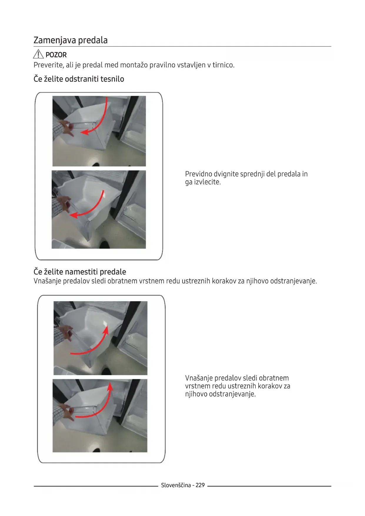 ‐ Deli, ki jih lahko servisira uporabnik so omejeni na ročaje (samo nekateri modeli), tesnila, predale in tečaje. OPOMBA Po popravilu s strani nepooblaščenega ponudnika storitev, samostojnemu popravljanju ali neprofesionalnem popravilu izdelka, Samsung ni odgovoren za kakršno koli škodo na izdelku, kakršno koli poškodbo ali katero koli drugo težavo z varnostjo izdelka, ki jo povzroči vsak poskus popravila izdelka, ki ne upošteva skrbno teh navodil za popravilo in vzdrževanje. Vsaka škoda na izdelku, ki jo povzroči poskus popravila izdelka s strani osebe, ki ni pooblaščeni ponudnik storitev Samsung, ne bo zajeta v garanciji. POZOR