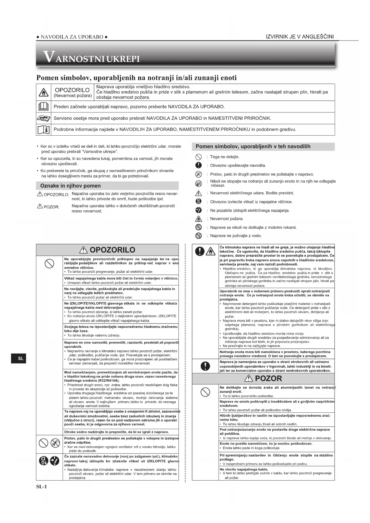 - Ker so v izdelku vrteči se deli in deli, ki lahko povzročijo električni udar, morate pred uporabo prebrati “Varnostne ukrepe”.• Ker so opozorila, ki so navedena tukaj, pomembna za varnost, jih morate obvezno upoštevati.• Ko preberete ta priročnik, ga skupaj z namestitvenim priročnikom shranite na lahko dosegljivem mestu za primer, da bi ga potrebovali. Oznake in njihov pomen OPOZORILO:Napačna uporaba bo zelo verjetno povzročila resno nevar-nost, ki lahko privede do smrti, hude poškodbe ipd. POZOR:Napačna uporaba lahko v določenih okoliščinah povzroči resno nevarnost. VARNOSTNI UKREPI Pomen simbolov, uporabljenih na notranji in/ali zunanji enoti OPOZORILO (Nevarnost požara)Naprava uporablja vnetljivo hladilno sredstvo.Če hladilno sredstvo pušča in pride v stik s plamenom ali grelnim telesom, začne nastajati strupen plin, hkrati pa obstaja nevarnost požara.Preden začnete uporabljati napravo, pozorno preberite NAVODILA ZA UPORABO.Servisno osebje mora pred uporabo prebrati NAVODILA ZA UPORABO in NAMESTITVENI PRIROČNIK.Podrobne informacije najdete v NAVODILIH ZA UPORABO, NAMESTITVENEM PRIROČNIKU in podobnem gradivu. OPOZORILO Ne uporabljajte provizoričnih priklopov na napajanje ter ne upo-rabljajte podaljškov ali razdelilnikov za priklop več naprav v eno omrežno vtičnico.• To lahko povzroči pregrevanje, požar ali električni udar.Vtikač napajalnega kabla mora biti čist in čvrsto vstavljen v vtičnico.• Umazan vtikač lahko povzroči požar ali električni udar.Ne navijajte, vlecite, poškodujte ali predelujte napajalnega kabla in nanj ne odlagajte težkih predmetov.• To lahko povzroči požar ali električni udar.Ne IZKLOPITE/VKLOPITE glavnega stikala in ne odklopite vtikača napajalnega kabla med delovanjem.• To lahko povzroči iskrenje, ki lahko zaneti požar.• Ko notranjo enoto IZKLOPITE z daljinskim upravljalnikom, IZKLOPITE glavno stikalo ali odklopite vtikač napajalnega kabla. Svojega telesa ne izpostavljajte neposrednemu hladnemu zračnemu toku dlje časa.• To lahko škoduje vašemu zdravju.Naprave ne sme namestiti, premestiti, razstaviti, predelati ali popraviti uporabnik.• Nepravilno ravnanje s klimatsko napravo lahko povzroči požar, električni udar, poškodbo, puščanje vode, ipd. Posvetujte se s prodajalcem.• Če je napajalni kabel poškodovan, ga mora proizvajalec ali pooblaščeni serviser zamenjati, da prepreči morebitno nevarnost.Med nameščanjem, premeščanjem ali servisiranjem enote pazite, da v hladilni tokokrog ne pride nobena druga snov, razen navedenega hladilnega sredstva (R32/R410A).• Prisotnost drugih snovi, npr. zraka, lahko povzroči neobičajen dvig tlaka in privede do eksplozije ali poškodbe.• Uporaba drugega hladilnega sredstva od posebej določenega za ta sistem lahko povzroči mehansko okvaro, motnje delovanja sistema ali okvaro enote. V najhujšem primeru lahko to privede do resnega ogrožanja varnosti izdelka.Te naprave naj ne uporabljajo osebe z omejenimi fi zičnimi, zaznavnimi ali duševnimi zmožnostmi, osebe brez zadostnih izkušenj in znanja (vključno z otroci), razen če so pod nadzorom oziroma jih o uporabi pouči oseba, ki je odgovorna za njihovo varnost.Otroke vedno nadzirajte in preprečite, da bi se igrali z napravo. Prstov, palic in drugih predmetov ne potiskajte v vstopne in izstopne zračne odprtine.• Ker se med delovanjem vgrajeni ventilator vrti z visoko hitrostjo, lahko pride do poškodb. Če zaznate nenavadno delovanje (vonj po zažganem ipd.), klimatsko napravo takoj izklopite ter iztaknite vtikač ali IZKLOPITE glavno stikalo.• Nadaljnje delovanje klimatske naprave v neustreznem stanju lahko povzroči okvaro, požar ali električni udar. V tem primeru se obrnite na prodajalca. Če klimatska naprava ne hladi ali ne greje, je možno uhajanje hladilne tekočine. Če ugotovite, da hladilno sredstvo pušča, takoj izklopite napravo, dobro prezračite prostor in se posvetujte s prodajalcem. Če je pri popravilu treba napravo znova napolniti s hladilnim sredstvom, serviserja prosite, naj vam razloži podrobnosti.• Hladilno sredstvo, ki ga uporablja klimatska naprava, ni škodljivo. Običajno ne pušča. Če pa hladilno sredstvo pušča in pride v stik s plamenom ali grelnim telesom ventilatorskega grelnika, kerozinskega grelnika ali plinskega gorilnika in začne nastajati strupen plin, hkrati pa obstaja nevarnost požara.Uporabnik ne sme v nobenem primeru poskusiti oprati notranjosti notranje enote. Če je notranjost enote treba očistiti, se obrnite na prodajalca.• Neprimeren detergent lahko poškoduje plastični material v notranjosti enote, kar lahko povzroči puščanje vode. Če detergent pride v stik z električnimi deli ali motorjem, to lahko povzroči okvaro, dimljenje ali požar.• Naprava mora biti v prostoru, kjer ni stalno delujočih virov vžiga (npr. odprtega plamena, naprave s plinskim gorilnikom ali električnega grelnika).• Upoštevajte, da hladilno sredstvo morda nima vonja.• Ne uporabljajte drugih sredstev za pospeševanje odmrzovanja ali za čiščenje naprave kot tistih, ki jih priporoča proizvajalec.• Ne predirajte in ne zažigajte naprave.Notranja enota mora biti nameščena v prostoru, katerega površina presega navedeno vrednost. O tem se posvetujte s prodajalcem.Naprava je namenjena za uporabo s strani strokovnih ali ustrezno usposobljenih uporabnikov v trgovinah, lahki industriji in na kmeti-jah ter za komercialno uporabo s strani nestrokovnih uporabnikov. POZOR Ne dotikajte se dovoda zraka ali aluminijastih lamel na notranji/zunanji enoti.• To bi lahko povzročilo poškodbe.Naprave ne smete poškropiti z insekticidom ali z gorljivim razpršilnim sredstvom.• To lahko povzroči požar ali poškodbo ohišja.Hišnih ljubljenčkov in rastlin ne izpostavljajte neposrednemu zrač-nemu toku.• To lahko škoduje zdravju živali ali sobnih rastlin.Pod notranjo/zunanjo enoto ne postavite druge električne naprave ali pohištva.• Iz nap