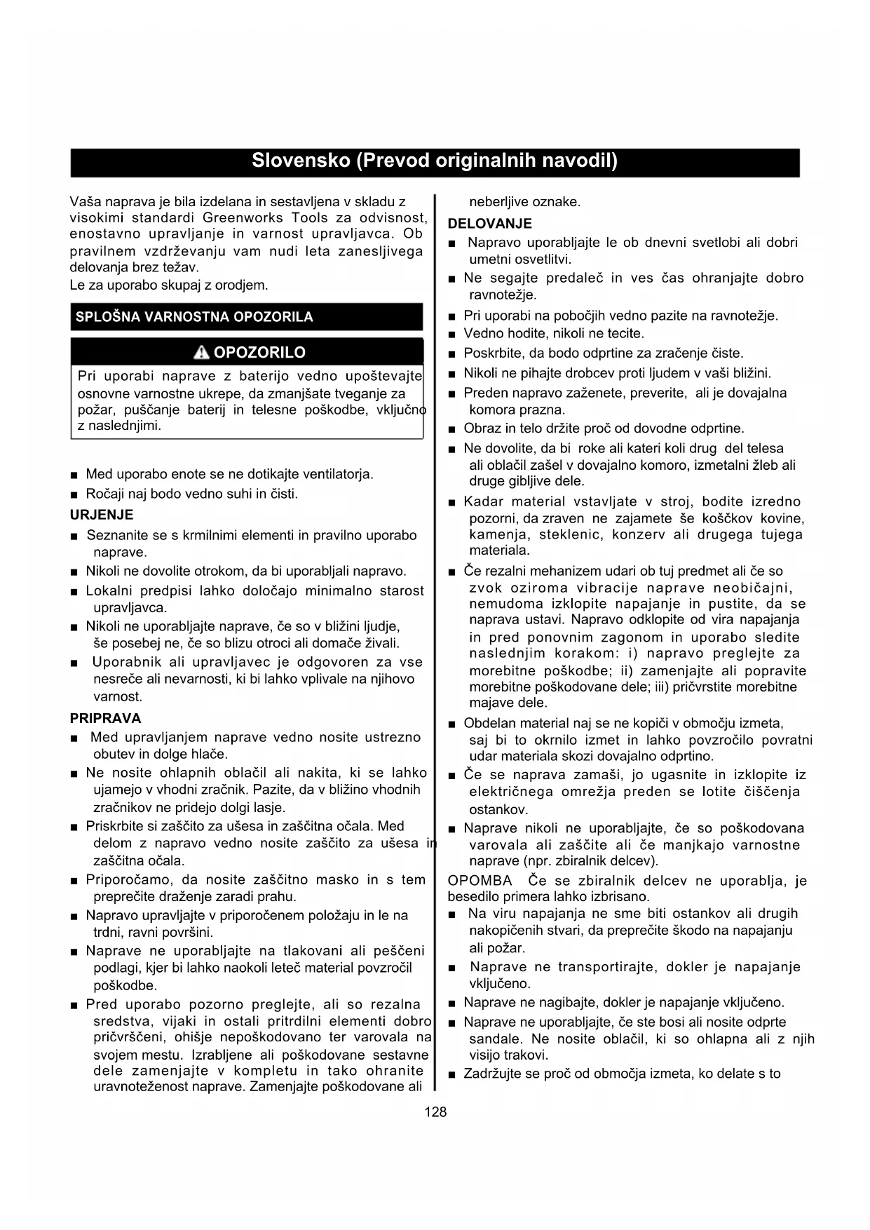 Slovensko (Prevod originalnih navodil) Vaša naprava je bila izdelana in sestavljena v skladu z visokimi standardi Greenworks Tools za odvisnost, enostavno upravljanje in varnost upravljavca. Ob pravilnem vzdrževanju vam nudi leta zanesljivega delovanja brez težav. Le za uporabo skupaj z orodjem. SPlOŠNA VARNOSTNA OPOZORIlA OPOZORIlO Pri uporabi naprave z baterijo vedno upoštevajte osnovne varnostne ukrepe, da zmanjšate tveganje za požar, puščanje baterij in telesne poškodbe, vključno z naslednjimi. ■ Med uporabo enote se ne dotikajte ventilatorja. ■ Ročaji naj bodo vedno suhi in čisti. URJENJE ■ Seznanite se s krmilnimi elementi in pravilno uporabo naprave. ■ Nikoli ne dovolite otrokom, da bi uporabljali napravo. ■ Lokalni predpisi lahko določajo minimalno starost upravljavca. ■ Nikoli ne uporabljajte naprave, če so v bližini ljudje, še posebej ne, če so blizu otroci ali domače živali. ■ Uporabnik ali upravljavec je odgovoren za vse nesreče ali nevarnosti, ki bi lahko vplivale na njihovo varnost. PRIPRAVA ■ Med upravljanjem naprave vedno nosite ustrezno obutev in dolge hlače. ■ Ne nosite ohlapnih oblačil ali nakita, ki se lahko ujamejo v vhodni zračnik. Pazite, da v bližino vhodnih zračnikov ne pridejo dolgi lasje. ■ Priskrbite si zaščito za ušesa in zaščitna očala. Med delom z napravo vedno nosite zaščito za ušesa in zaščitna očala. ■ Priporočamo, da nosite zaščitno masko in s tem preprečite draženje zaradi prahu. ■ Napravo upravljajte v priporočenem položaju in le na trdni, ravni površini. ■ Naprave ne uporabljajte na tlakovani ali peščeni podlagi, kjer bi lahko naokoli leteč material povzročil poškodbe. ■ Pred uporabo pozorno preglejte, ali so rezalna sredstva, vijaki in ostali pritrdilni elementi dobro pričvrščeni, ohišje nepoškodovano ter varovala na svojem mestu. Izrabljene ali poškodovane sestavne dele zamenjajte v kompletu in tako ohranite uravnoteženost naprave. Zamenjajte poškodovane ali neberljive oznake. DElOVANJE ■ Napravo uporabljajte le ob dnevni svetlobi ali dobri umetni osvetlitvi. ■ Ne segajte predaleč in ves čas ohranjajte dobro ravnotežje. ■ Pri uporabi na pobočjih vedno pazite na ravnotežje. ■ Vedno hodite, nikoli ne tecite. ■ Poskrbite, da bodo odprtine za zračenje čiste. ■ Nikoli ne pihajte drobcev proti ljudem v vaši bližini. ■ Preden napravo zaženete, preverite, ali je dovajalna komora prazna. ■ Obraz in telo držite proč od dovodne odprtine. ■ Ne dovolite, da bi roke ali kateri koli drug del telesa ali oblačil zašel v dovajalno komoro, izmetalni žleb ali druge gibljive dele. ■ Kadar material vstavljate v stroj, bodite izredno pozorni, da zraven ne zajamete še koščkov kovine, kamenja, steklenic, konzerv ali drugega tujega materiala. ■ Če rezalni mehanizem udari ob tuj predmet ali če so zvok oziroma vibracije naprave neobičajni, nemudoma izklopite napajanje in pustite, da se naprava ustavi. Napravo odklopite od vira napajanja in pred ponovnim zagonom in uporabo sledite naslednjim korakom: i) napravo preglejte za morebitne poškodbe; ii) zamenjajte ali popravite morebitne poškodovane dele; iii) pričvrstite morebitne majave dele. ■ Obdelan material naj se ne kopiči v območju izmeta, saj bi to okrnilo izmet in lahko povzročilo povratni udar materiala skozi dovajalno odprtino. ■ Če se naprava zamaši, jo ugasnite in izklopite iz električnega omrežja preden se lotite čiščenja ostankov. ■ Naprave nikoli ne uporabljajte, če so poškodovana varovala ali zaščite ali če manjkajo varnostne naprave (npr. zbiralnik delcev). OPOMBA Če se zbiralnik delcev ne uporablja, je besedilo primera lahko izbrisano. ■ Na viru napajanja ne sme biti ostankov ali drugih nakopičenih stvari, da preprečite škodo na napajanju ali požar. ■ Naprave ne transportirajte, dokler je napajanje vključeno. ■ Naprave ne nagibajte, dokler je napajanje vključeno. ■ Naprave ne uporabljajte, če ste bosi ali nosite odprte sandale. Ne nosite oblačil, ki so ohlapna ali z njih visijo trakovi. ■ Zadržujte se proč od območja izmeta, ko delate s to129 Slovensko (Prevod originalnih navodil) Vaša naprava je bila izdelana in sestavljena v skladu z visokimi standardi Greenworks Tools za odvisnost, enostavno upravljanje in varnost upravljavca. Ob pravilnem vzdrževanju vam nudi leta zanesljivega delovanja brez težav. Le za uporabo skupaj z orodjem. SPlOŠNA VARNOSTNA OPOZORIlA OPOZORIlO Pri uporabi naprave z baterijo vedno upoštevajte osnovne varnostne ukrepe, da zmanjšate tveganje za požar, puščanje baterij in telesne poškodbe, vključno z naslednjimi. ■ Med uporabo enote se ne dotikajte ventilatorja. ■ Ročaji naj bodo vedno suhi in čisti. URJENJE ■ Seznanite se s krmilnimi elementi in pravilno uporabo naprave. ■ Nikoli ne dovolite otrokom, da bi uporabljali napravo. ■ Lokalni predpisi lahko določajo minimalno starost upravljavca. ■ Nikoli ne uporabljajte naprave, če so v bližini ljudje, še posebej ne, če so blizu otroci ali domače živali. ■ Uporabnik ali upravljavec je odgovoren za vse nesreče ali nevarnosti, ki bi lahko vplivale na njihovo varnost. PRIPRAVA ■ Med upravljanjem naprave vedno nosite ustrezno obutev in dolge hlače. ■ Ne nosite ohlapnih oblačil ali nakita, ki se lahko ujamejo v vhodni zračnik. Pazite, da v bližino vhodnih zračnikov ne pridejo dolgi lasje. ■ Priskrbite si zaščito za ušesa in zaščitna očala. Med delom z napravo vedno nosite zaščito za ušesa in zaščitna očala. ■ Priporočamo, da nosite zaščitno masko in s tem preprečite draženje zaradi prahu. ■ Napravo upravljajte v priporočenem položaju in le na trdni, ravni površini. ■ Naprave ne uporabljajte na tlakovani ali peščeni podlagi, kjer bi lahko naokoli leteč material povzročil poškodbe. ■ Pred uporabo pozorno preglejte, ali so rezalna sredstva, vijaki in ostali pritrdilni elementi dobro pričvrščeni, oh