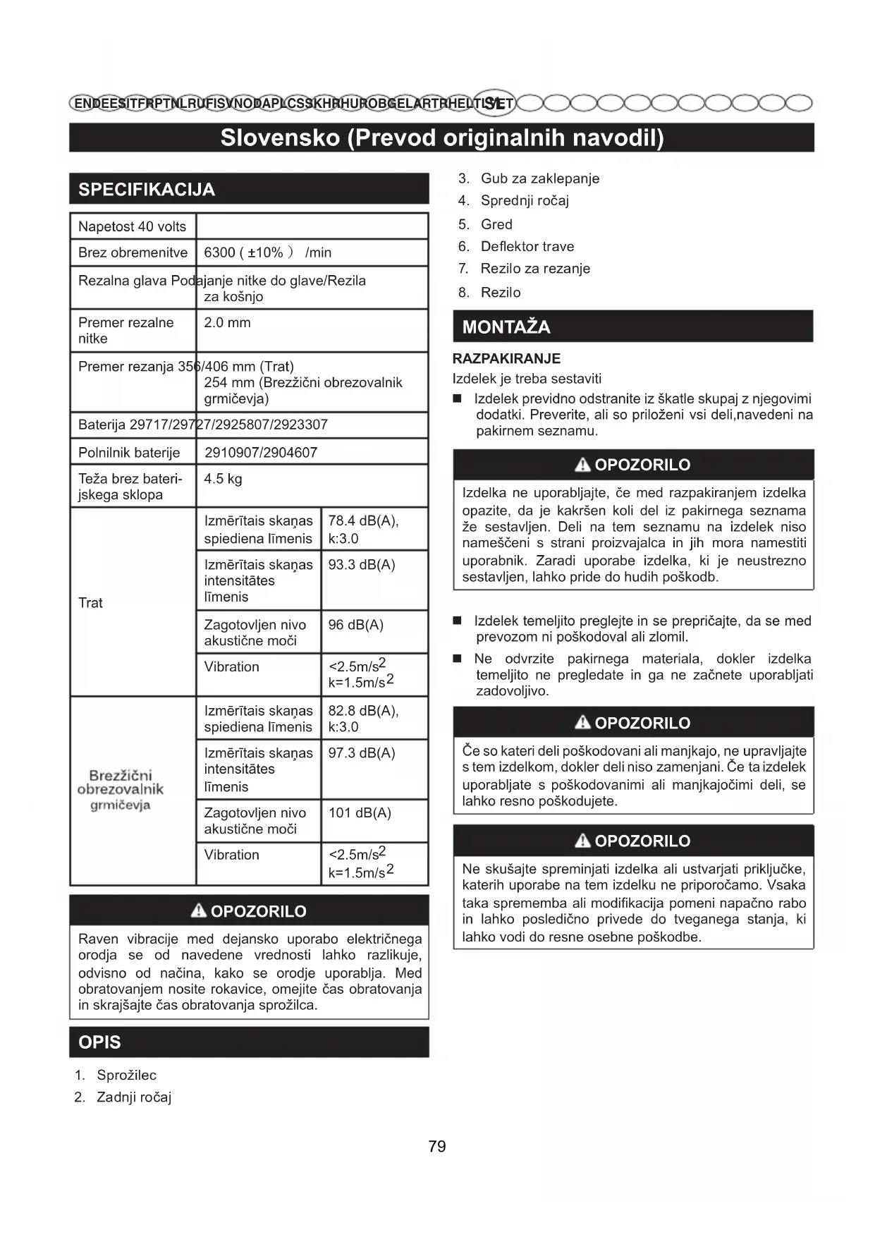 EN DE ES IT FR PT NL RU FI SV NO DA PL CS SK HR HU RO BG EL AR TR HE LT LV ET OPOZORILO Zavorna tekočina, gorivo, izdelki na bazi petroleja in pronicajoče olje naj nikoli ne pridejo v stik s plastičnimi deli. Kemikalije lahko plastiko poškodujejo, oslabijo ali uničijo, kar lahko privede do hudih telesnih poškodb. Stranka lahko popravi ali sama zamenja le dele, ki so navedeni na seznamu delov. Vse druge dele sme zamenjati ali popraviti le pooblaščeni serviser. OPOZORILO Da bi se izognili hudim telesnim poškodbam, med čiščenjem ali vzdrževanjem iz orodja vedno odstranite baterije. ZAMENJAVA VRETENA Glejte Sliko 9. Uporabljajte le monolamentno nitko premera 2 mm. Odstranjevanje baterije. Pritisnite jezičke na straneh pokrova vretena. Za odstranitev držalo vretena povlecite navzgor. Odstranite staro vreteno. Za namestitev novega vretena se prepričajte, da je nitka ujeta v reži na novem vretenu. Prepričajte se, da konec nitke sega približno 15 cm prek reže. Namestite novo vreteno, tako da sta nitka in reža poravnani z odprtino v vpenjalni glavi. Nitko navijte v odprtino. Povlecite vrvico, ki sega iz vpenjalne glave, tako da se vrvica sprosti iz reže v vretenu. Ponovno namestite vreteno, tako da pritisnete jeziček v reže in ga potiskate navzdol, dokler se držalo vretena ne zaskoči. ZAMENJAVA NITKE Glejte Sliko 10. Odstranjevanje baterije. Z vpenjalne glave odstranite vreteno. OPOMBA: Odstranite staro nitko, ki je ostala na vretenu. O drežite kos nitke, dolg približno 3 metra. Prepognite nitko na sredini in obesite zanko za režo na sredinskem obroču vretena. Prepričajte se, da se je nitka zaskočila na mestu v reži. Enakomerno in čvrsto navijte nitko v smeri urinega kazalca. Ko končate, vstavite nitko v režo tako, da se ne more odviti. Nitke ne navijte prek robu vretena. SESTAVA REZALNIKA Glejte Sliko 11. Opozorilo: Bodite pozorni na ostre robove in nosite roka- vice. Odstranite baterijo. Prepričajte se, da »F« nameščen v gred rezalnika. Skozi luknji vstavite ustrezen izvijač. Rezilo »G« postavite na vrh distančnika »F« in se prepričajte, da je poravnano. Obložko »H« postavite na rezilo »G«. Pokrov »I« postavite čez obložko »H«. S ključem 19 mm ali 3/4” pritrdite matico »J« v nasprotni smeri urinega kazalca na 44–58 N.M ali 32–42 ft/lbs vrtilnega momenta. Zavrtite rezilo »B«, da se prepričate, ali je varno pritrjeno. SHRANJEVANJE KOSILNICE Pred shranjevanjem iz kosilnice odstranite baterijo. Shranite jo izven dosega otrok. Shranite jo proč od korozivnih sredstev, kot so vrtne kemikalije in soli za topljenje ledu. Baterije hranite in polnite na hladnem mestu. Temperature nad ali pod normalno sobno temperaturo skrajšujejo življenjsko dobo baterije. Baterijo shranite tam, kjer je temperatura pod 27°C in kjer ni vlage. Vse baterije postopno izgubljajo napolnjenost. Višja kot je temperatura, hitreje se praznijo. Če napravo uskladiščite za daljša obdobja, ne da bi jo uporabljali, baterije ponovno napolnite približno na vsak mesec ali dva. Taka praksa bo podaljšala življenjsko dobo baterij. Rezalnik med transportom zavarujte, da preprečite škodo ali poškodbe. Preden napravo shranite jo očistite in poskrbite za ustrezno vzdrževanje in uporabite varovala za kovinska rezila. Uporabite varovala za kovinska rezila med transportom in skladiščenjem. VAROVANJE OKOLJA Varovanje okolja mora biti pomemben in prednostni vidik pri uporabi stroja, v korist civilnega sožitja in okolja, v katerem živimo. Pazite, da s svojim delom ne motite sosedov. Natančno upoštevajte lokalne predpise za odlaganje embalaže, olja, bencina, filtrov, pokvarjenih delov ali katerega koli elementa, ki močno vpliva na okolje; teh odpadkov ne smete odvreči v smeti, ampak jih morate ločiti in jih izročiti posebnim zbirnim centrom, ki bodo poskrbeli za njihovo reciklažo. Natančno upoštevajte lokalne predpise za odlaganje odpadnega materiala po košnji. 82Slovensko (Prevod originalnih navodil)