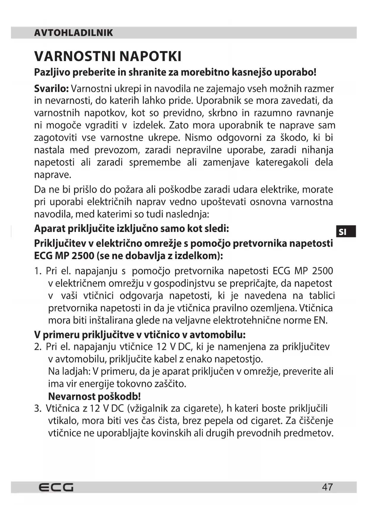 AVTOHLADILNIK VARNOSTNI NAPOTKI Pazljivo preberite in shranite za morebitno kasnejšo uporabo! Svarilo: Varnostni ukrepi in navodila ne zajemajo vseh možnih razmer in nevarnosti, do katerih lahko pride. Uporabnik se mora zavedati, da varnostnih napotkov, kot so previdno, skrbno in razumno ravnanje ni mogoče vgraditi v izdelek. Zato mora uporabnik te naprave sam zagotoviti vse varnostne ukrepe. Nismo odgovorni za škodo, ki bi nastala med prevozom, zaradi nepravilne uporabe, zaradi nihanja napetosti ali zaradi spremembe ali zamenjave kateregakoli dela naprave. Da ne bi prišlo do požara ali poškodbe zaradi udara elektrike, morate pri uporabi električnih naprav vedno upoštevati osnovna varnostna navodila, med katerimi so tudi naslednja: Aparat priključite izključno samo kot sledi: Priključitev velektrično omrežje spomočjo pretvornika napetosti ECG MP 2500 (se ne dobavlja zizdelkom):