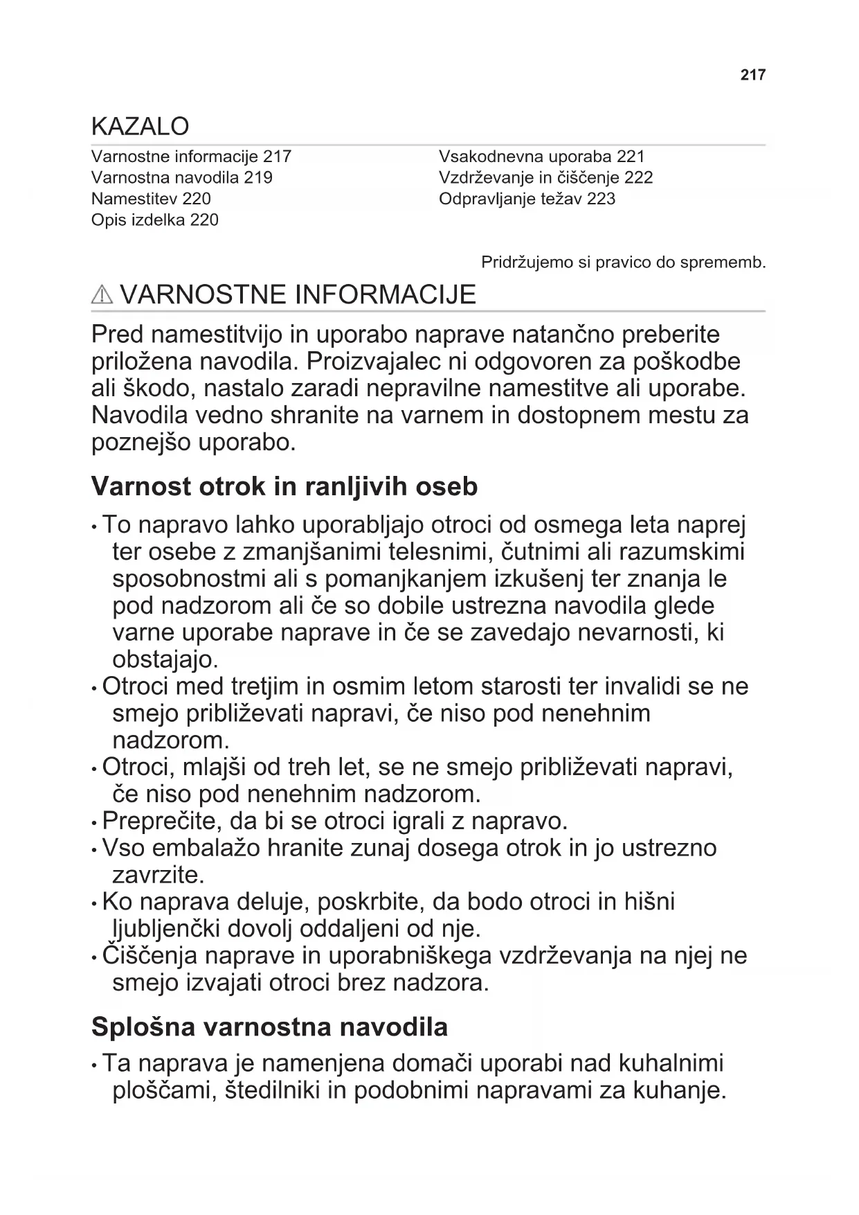 - Ta naprava je namenjena domači uporabi nad kuhalnimi ploščami, štedilniki in podobnimi napravami za kuhanje. 217• Pred vzdrževalnimi deli napravo izključite iz napajanja.