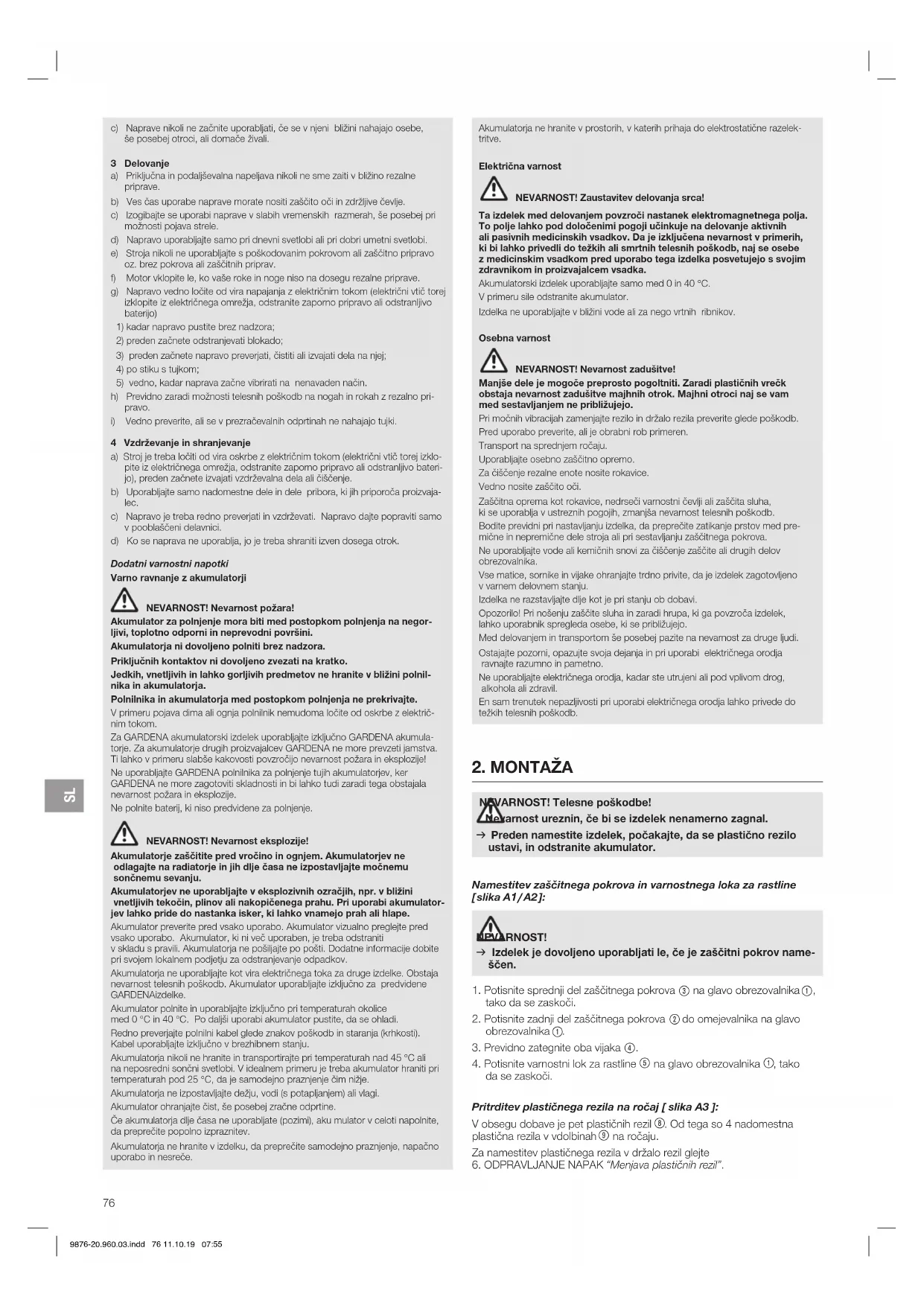 4 Vzdrževanje in shranjevanje a) Stroj je treba ločiti od vira oskrbe z električnim tokom (električni vtič torej izklo- pite iz električnega omrežja, odstranite zaporno pripravo ali odstranljivo bateri- jo), preden začnete izvajati vzdrževalna dela ali čiščenje. b) Uporabljajte samo nadomestne dele in dele pribora, ki jih priporoča proizvaja- lec. c) Napravo je treba redno preverjati in vzdrževati. Napravo dajte popraviti samo v pooblaščeni delavnici. d) Ko se naprava ne uporablja, jo je treba shraniti izven dosega otrok. Dodatni varnostni napotki Varno ravnanje z akumulatorji NEVARNOST! Nevarnost požara! Akumulator za polnjenje mora biti med postopkom polnjenja na negor- ljivi, toplotno odporni in neprevodni površini. Akumulatorja ni dovoljeno polniti brez nadzora. Priključnih kontaktov ni dovoljeno zvezati na kratko. Jedkih, vnetljivih in lahko gorljivih predmetov ne hranite v bližini polnil- nika in akumulatorja. Polnilnika in akumulatorja med postopkom polnjenja ne prekrivajte. V primeru pojava dima ali ognja polnilnik nemudoma ločite od oskrbe z električ- nim tokom. Za GARDENA akumulatorski izdelek uporabljajte izključno GARDENA akumula- torje. Za akumulatorje drugih proizvajalcev GARDENA ne more prevzeti jamstva. Ti lahko v primeru slabše kakovosti povzročijo nevarnost požara in eksplozije! Ne uporabljajte GARDENA polnilnika za polnjenje tujih akumulatorjev, ker GARDENA ne more zagotoviti skladnosti in bi lahko tudi zaradi tega obstajala nevarnost požara in eksplozije. Ne polnite baterij, ki niso predvidene za polnjenje. NEVARNOST! Nevarnost eksplozije! Akumulatorje zaščitite pred vročino in ognjem. Akumulatorjev ne odlagajte na radiatorje in jih dlje časa ne izpostavljajte močnemu sončnemu sevanju. Akumulatorjev ne uporabljajte v eksplozivnih ozračjih, npr. v bližini vnetljivih tekočin, plinov ali nakopičenega prahu. Pri uporabi akumulator- jev lahko pride do nastanka isker, ki lahko vnamejo prah ali hlape. Akumulator preverite pred vsako uporabo. Akumulator vizualno preglejte pred vsako uporabo. Akumulator, ki ni več uporaben, je treba odstraniti v skladu s pravili. Akumulatorja ne pošiljajte po pošti. Dodatne informacije dobite pri svojem lokalnem podjetju za odstranjevanje odpadkov. Akumulatorja ne uporabljajte kot vira električnega toka za druge izdelke. Obstaja nevarnost telesnih poškodb. Akumulator uporabljajte izključno za predvidene GARDENA izdelke. Akumulator polnite in uporabljajte izključno pri temperaturah okolice med 0 °C in 40 °C. Po daljši uporabi akumulator pustite, da se ohladi. Redno preverjajte polnilni kabel glede znakov poškodb in staranja (krhkosti). Kabel uporabljajte izključno v brezhibnem stanju. Akumulatorja nikoli ne hranite in transportirajte pri temperaturah nad 45 °C ali na neposredni sončni svetlobi. V idealnem primeru je treba akumulator hraniti pri temperaturah pod 25 °C, da je samodejno praznjenje čim nižje. Akumulatorja ne izpostavljajte dežju, vodi (s potapljanjem) ali vlagi. Akumulator ohranjajte čist, še posebej zračne odprtine. Če akumulatorja dlje časa ne uporabljate (pozimi), aku mulator v celoti napolnite, da preprečite popolno izpraznitev. Akumulatorja ne hranite v izdelku, da preprečite samodejno praznjenje, napačno uporabo in nesreče. Akumulatorja ne hranite v prostorih, v katerih prihaja do elektrostatične razelek- tritve. Električna varnost NEVARNOST! Zaustavitev delovanja srca! Ta izdelek med delovanjem povzroči nastanek elektromagnetnega polja. To polje lahko pod določenimi pogoji učinkuje na delovanje aktivnih ali pasivnih medicinskih vsadkov. Da je izključena nevarnost v primerih, ki bi lahko privedli do težkih ali smrtnih telesnih poškodb, naj se osebe z medicinskim vsadkom pred uporabo tega izdelka posvetujejo s svojim zdravnikom in proizvajalcem vsadka. Akumulatorski izdelek uporabljajte samo med 0 in 40 °C. V primeru sile odstranite akumulator. Izdelka ne uporabljajte v bližini vode ali za nego vrtnih ribnikov. Osebna varnost NEVARNOST! Nevarnost zadušitve! Manjše dele je mogoče preprosto pogoltniti. Zaradi plastičnih vrečk obstaja nevarnost zadušitve majhnih otrok. Majhni otroci naj se vam med sestavljanjem ne približujejo. Pri močnih vibracijah zamenjajte rezilo in držalo rezila preverite glede poškodb. Pred uporabo preverite, ali je obrabni rob primeren. Transport na sprednjem ročaju. Uporabljajte osebno zaščitno opremo. Za čiščenje rezalne enote nosite rokavice. Vedno nosite zaščito oči. Zaščitna oprema kot rokavice, nedrseči varnostni čevlji ali zaščita sluha, ki se uporablja v ustreznih pogojih, zmanjša nevarnost telesnih poškodb. Bodite previdni pri nastavljanju izdelka, da preprečite zatikanje prstov med pre- mične in nepremične dele stroja ali pri sestavljanju zaščitnega pokrova. Ne uporabljajte vode ali kemičnih snovi za čiščenje zaščite ali drugih delov obrezovalnika. Vse matice, sornike in vijake ohranjajte trdno privite, da je izdelek zagotovljeno v varnem delovnem stanju. Izdelka ne razstavljajte dlje kot je pri stanju ob dobavi. Opozorilo! Pri nošenju zaščite sluha in zaradi hrupa, ki ga povzroča izdelek, lahko uporabnik spregleda osebe, ki se približujejo. Med delovanjem in transportom še posebej pazite na nevarnost za druge ljudi. Ostajajte pozorni, opazujte svoja dejanja in pri uporabi električnega orodja ravnajte razumno in pametno. Ne uporabljajte električnega orodja, kadar ste utrujeni ali pod vplivom drog, alkohola ali zdravil. En sam trenutek nepazljivosti pri uporabi električnega orodja lahko privede do težkih telesnih poškodb.