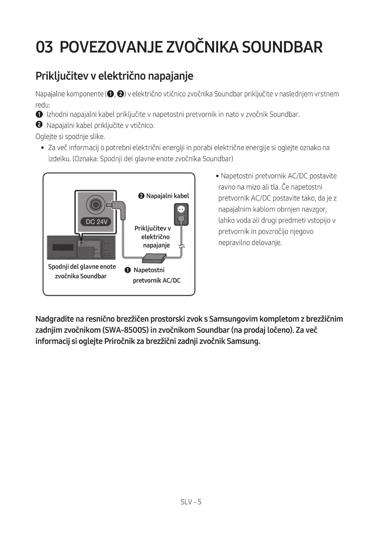 - Napetostni pretvornik AC/DC postavite ravno na mizo ali tla. Če napetostni pretvornik AC/DC postavite tako, da je z napajalnim kablom obrnjen navzgor, lahko voda ali drugi predmeti vstopijo v pretvornik in povzročijo njegovo nepravilno delovanje. Nadgradite na resnično brezžičen prostorski zvok s Samsungovim kompletom z brezžičnim zadnjim zvočnikom (SWA-8500S) in zvočnikom Soundbar (na prodaj ločeno). Za več informacij si oglejte Priročnik za brezžični zadnji zvočnik Samsung.SLV - 6