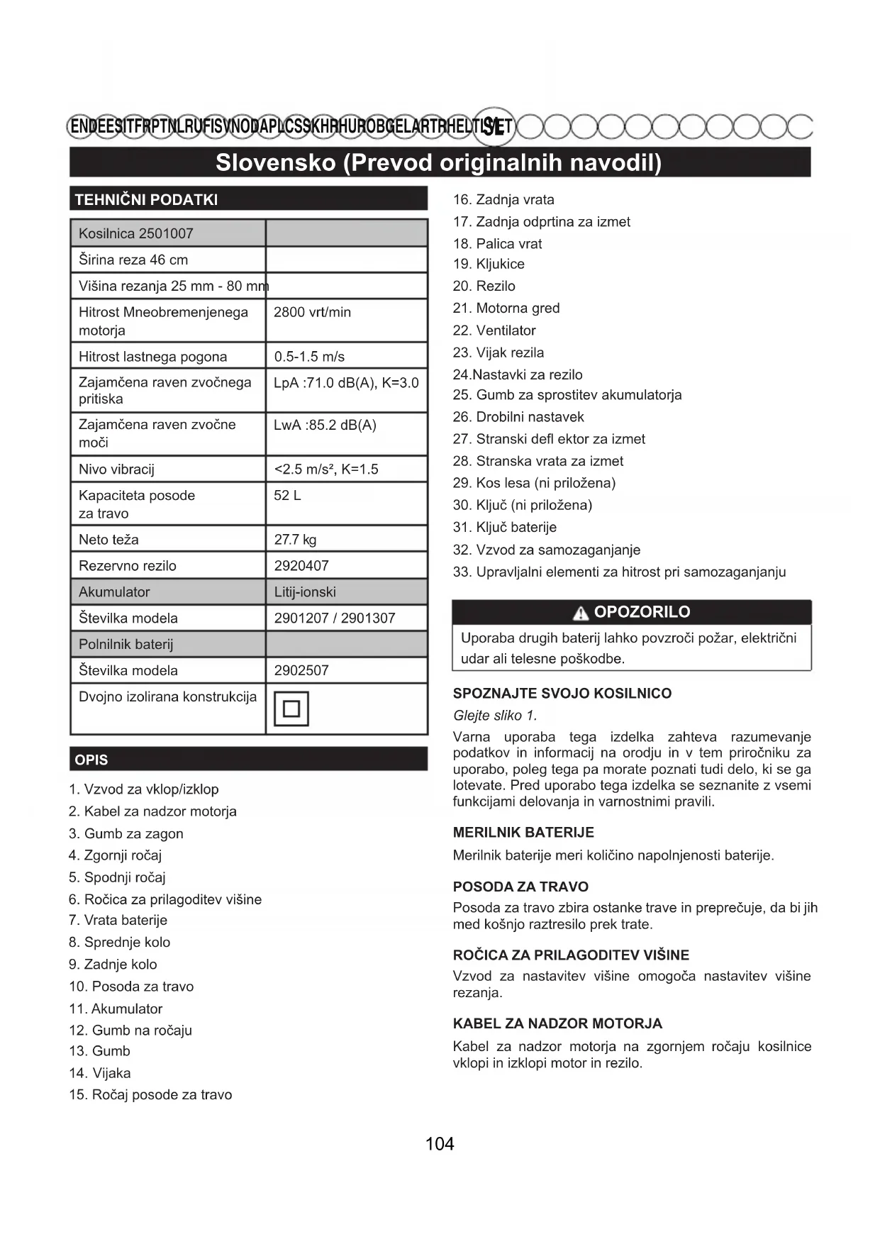 EN DE ES IT FR PT NL RU FI SV NO DA PL CS SK HR HU RO BG EL AR TR HE LT LV ET TEHNIČNI PODATKIKosilnica 2501007Širina reza 46 cmVišina rezanja 25 mm - 80 mmHitrost Mneobremenjenegamotorja2800 vrt/minHitrost lastnega pogona 0.5-1.5 m/sZajamčena raven zvočnega pritiskaLpA :71.0 dB(A), K=3.0Zajamčena raven zvočne moči LwA :85.2 dB(A)Nivo vibracij <2.5 m/s², K=1.5Kapaciteta posodeza travo 52 L Neto teža 27.7 kg Rezervno rezilo 2920407Akumulator Litij-ionskiŠtevilka modela 2901207 / 2901307Polnilnik baterijŠtevilka modela 2902507Dvojno izolirana konstrukcija OPIS 1. Vzvod za vklop/izklop2. Kabel za nadzor motorja3. Gumb za zagon4. Zgornji ročaj5. Spodnji ročaj6. Ročica za prilagoditev višine7. Vrata baterije8. Sprednje kolo9. Zadnje kolo10. Posoda za travo11. Akumulator12. Gumb na ročaju13. Gumb Vijaka15. Ročaj posode za travo16. Zadnja vrata17. Zadnja odprtina za izmet18. Palica vrat19. Kljukice20. Rezilo21. Motorna gred22. Ventilator23. Vijak rezila24.Nastavki za rezilo25. Gumb za sprostitev akumulatorja26. Drobilni nastavek27. Stranski defl ektor za izmet28. Stranska vrata za izmet29. Kos lesa (ni priložena)30. Ključ (ni priložena)31. Ključ baterije32. Vzvod za samozaganjanje 33. Upravljalni elementi za hitrost pri samozaganjanju OPOZORILO Uporaba drugih baterij lahko povzroči požar, električniudar ali telesne poškodbe. SPOZNAJTE SVOJO KOSILNICOGlejte sliko 1.Varna uporaba tega izdelka zahteva razumevanje podatkov in informacij na orodju in v tem priročniku za uporabo, poleg tega pa morate poznati tudi delo, ki se ga lotevate. Pred uporabo tega izdelka se seznanite z vsemi funkcijami delovanja in varnostnimi pravili.MERILNIK BATERIJEMerilnik baterije meri količino napolnjenosti baterije.POSODA ZA TRAVOPosoda za travo zbira ostanke trave in preprečuje, da bi jih med košnjo raztresilo prek trate.ROČICA ZA PRILAGODITEV VIŠINE Vzvod za nastavitev višine omogoča nastavitev višine rezanja.KABEL ZA NADZOR MOTORJA Kabel za nadzor motorja na zgornjem ročaju kosilnice vklopi in izklopi motor in rezilo. 104Slovensko (Prevod originalnih navodil)