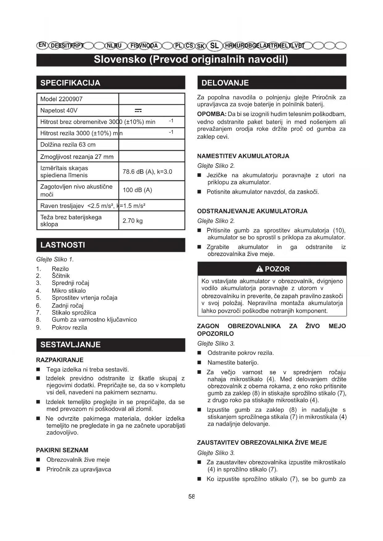MEJO OPOZORILO Naprav z baterijami ni potrebno vklapljati v vtičnico, saj so vedno pripravljene za delovanje. Da bi preprečili težko telesno poškodbo, vedno odstranite baterijo in bodite posebno pazljivi in previdni med vzdrževanjem, servisiranjem ali zamenjavo rezila. 59Slovensko (Prevod originalnih navodil)