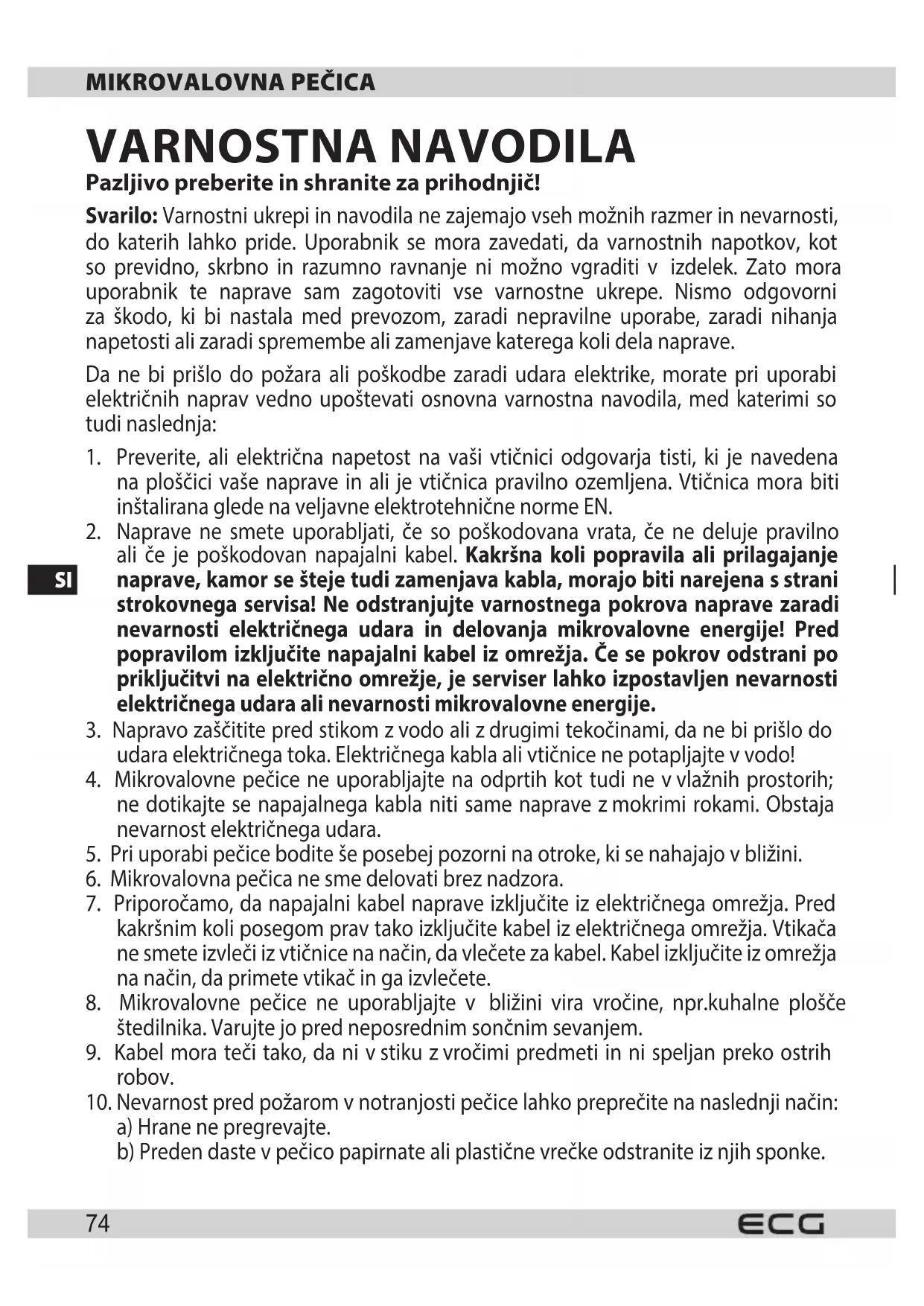 3. Umazan okvir vrat, tesnila in sosednji deli se morajo temeljito očistiti zvlažno krpo, namočeno vraztopini detergenta, in nato suho obrisati. Pečica mora biti ozemljena. Vtikalo električnega kabla je lahko vključeno le vvtičnico, ki je pravilno ozemljena. V primeru kakršnih koli dvomov glede pravilnosti el. inštalacije ali pri okvarah kontaktirajte kvaliciranega električarja ali servisnega tehnika. 1. Mikrovalovna pečica je opremljena skratkim el. kablom, da se zmanjša tveganje poškodbe zaradi spotikanja ali zapletanja.