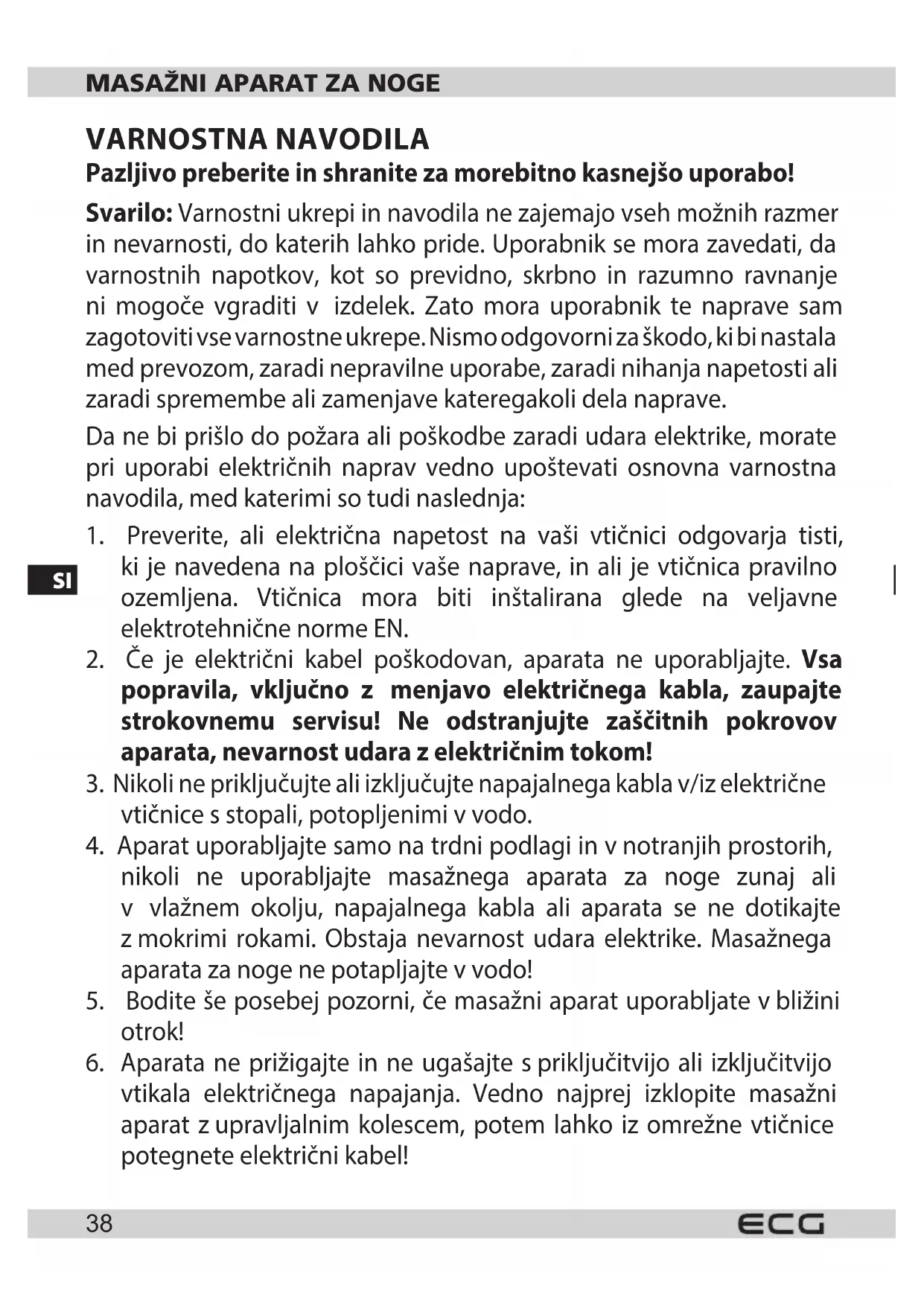 Odstranjevanje električne in elektronske opreme (velja za države članice Evropske unije in druge evropske države, ki izvajajo sistem recikliranja).Simbol na izdelku ali embalaži pomeni, da se izdelek ne sme obravnavati kot komunalni odpadek. Dostaviti izdelek na lokacijo, namenjeno za recikliranje električne in elektronske opreme. Preprečite negativni vpliv na zdravje ljudi in okolje z pravilnim recikliranjem izdelka. Recikliranje ohranja naravne vire. Za več informacij orecikliranju tega izdelka se lahko obrnite na lokalne oblasti, lokalne organizacije ali trgovino, kjer ste izdelek kupili. Ta izdelek je vskladu zEU zahtevami oelektromagnetni skladnosti in električni varnosti. Pridržujemo si pravico do urejanja besedila in tehničnih parametrov. Navodila za uporabo so na razpolago na spletnih straneh www.ecg-electro.eu.