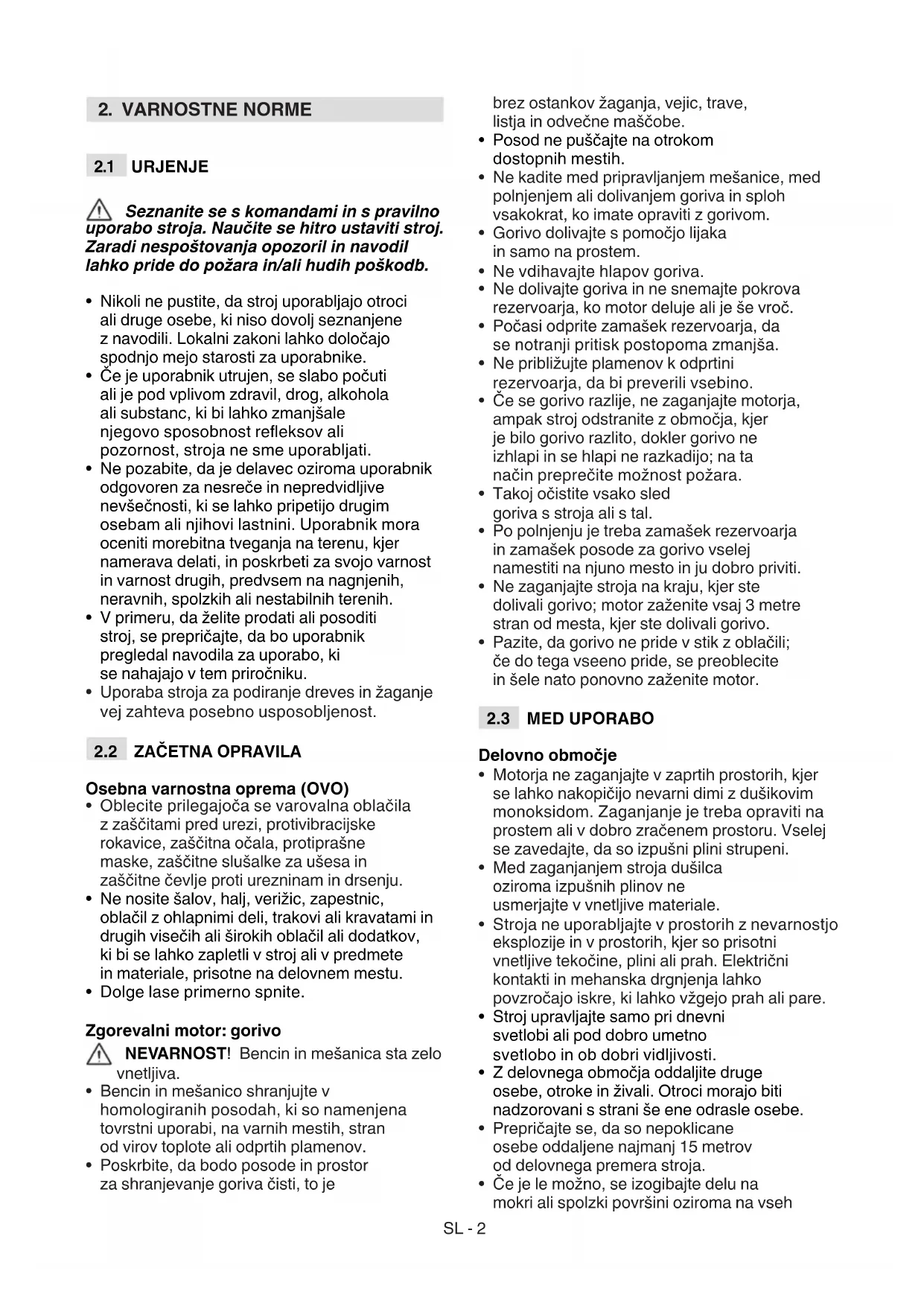 - Ne pozabite, da je delavec oziroma uporabnik odgovoren za nesreče in nepredvidljive nevšečnosti, ki se lahko pripetijo drugim osebam ali njihovi lastnini. Uporabnik mora oceniti morebitna tveganja na terenu, kjer namerava delati, in poskrbeti za svojo varnost in varnost drugih, predvsem na nagnjenih, neravnih, spolzkih ali nestabilnih terenih.