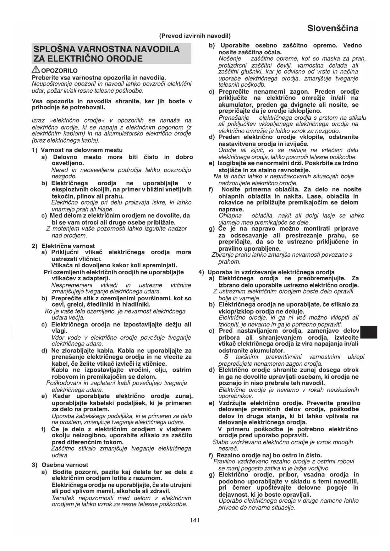 OPOZORILO Preberite vsa varnostna opozorila in navodila. Neupoštevanje opozoril in navodil lahko povzroči električni udar, požar in/ali resne telesne poškodbe. Vsa opozorila in navodila shranite, ker jih boste v prihodnje še potrebovali. Izraz »električno orodje« v opozorilih se nanaša na električno orodje, ki se napaja z električnim pogonom (z električnim kablom) in na akumulatorsko električno orodje (brez električnega kabla).