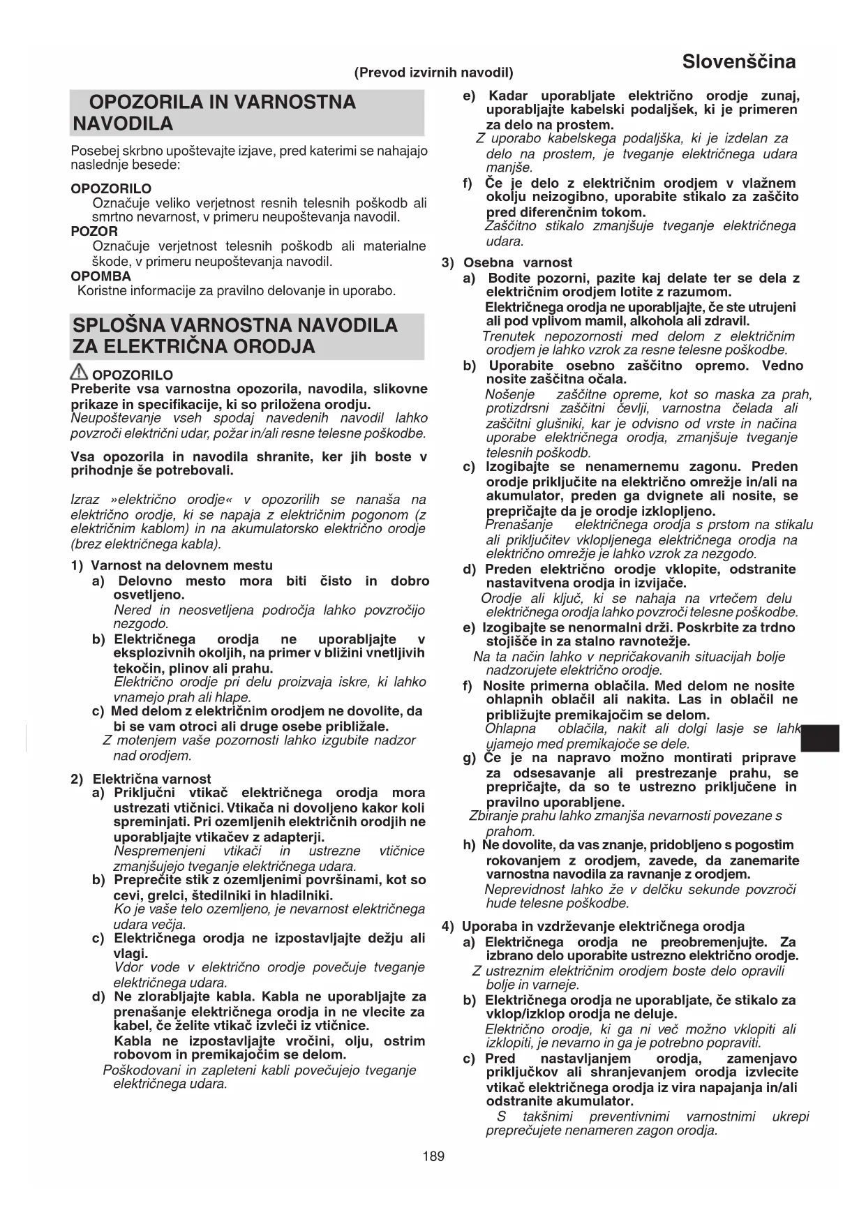 OPOZORILO Preberite vsa varnostna opozorila, navodila, slikovne prikaze in specifi kacije, ki so priložena orodju. Neupoštevanje vseh spodaj navedenih navodil lahko povzroči električni udar, požar in/ali resne telesne poškodbe. Vsa opozorila in navodila shranite, ker jih boste v prihodnje še potrebovali. Izraz »električno orodje« v opozorilih se nanaša na električno orodje, ki se napaja z električnim pogonom (z električnim kablom) in na akumulatorsko električno orodje (brez električnega kabla).