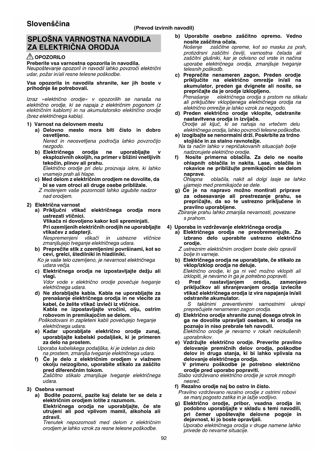 OPOZORILO Preberite vsa varnostna opozorila in navodila. Neupoštevanje opozoril in navodil lahko povzroči električni udar, požar in/ali resne telesne poškodbe. Vsa opozorila in navodila shranite, ker jih boste v prihodnje še potrebovali. Izraz »električno orodje« v opozorilih se nanaša na električno orodje, ki se napaja z električnim pogonom (z električnim kablom) in na akumulatorsko električno orodje (brez električnega kabla).