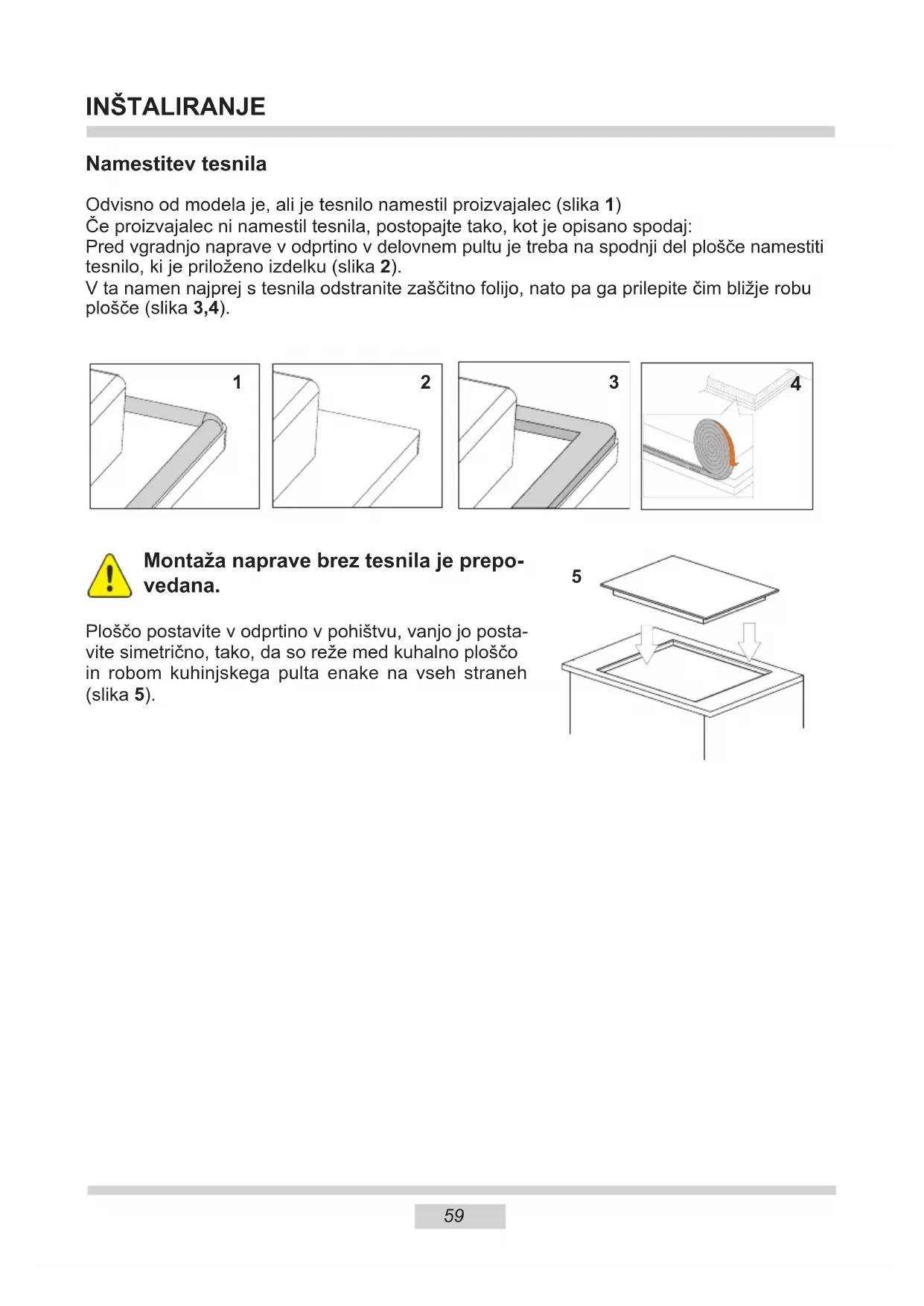 +269 INSTALACE Montaža naprave brez tesnila je prepo- vedana. Ploščo postavite v odprtino v pohištvu, vanjo jo posta- vite simetrično, tako, da so reže med kuhalno ploščo in robom kuhinjskega pulta enake na vseh straneh (slika 5). Namestitev tesnila Odvisno od modela je, ali je tesnilo namestil proizvajalec (slika 1) Če proizvajalec ni namestil tesnila, postopajte tako, kot je opisano spodaj: Pred vgradnjo naprave v odprtino v delovnem pultu je treba na spodnji del plošče namestiti tesnilo, ki je priloženo izdelku (slika 2). V ta namen najprej s tesnila odstranite zaščitno folijo, nato pa ga prilepite čim bližje robu plošče (slika 3,4).