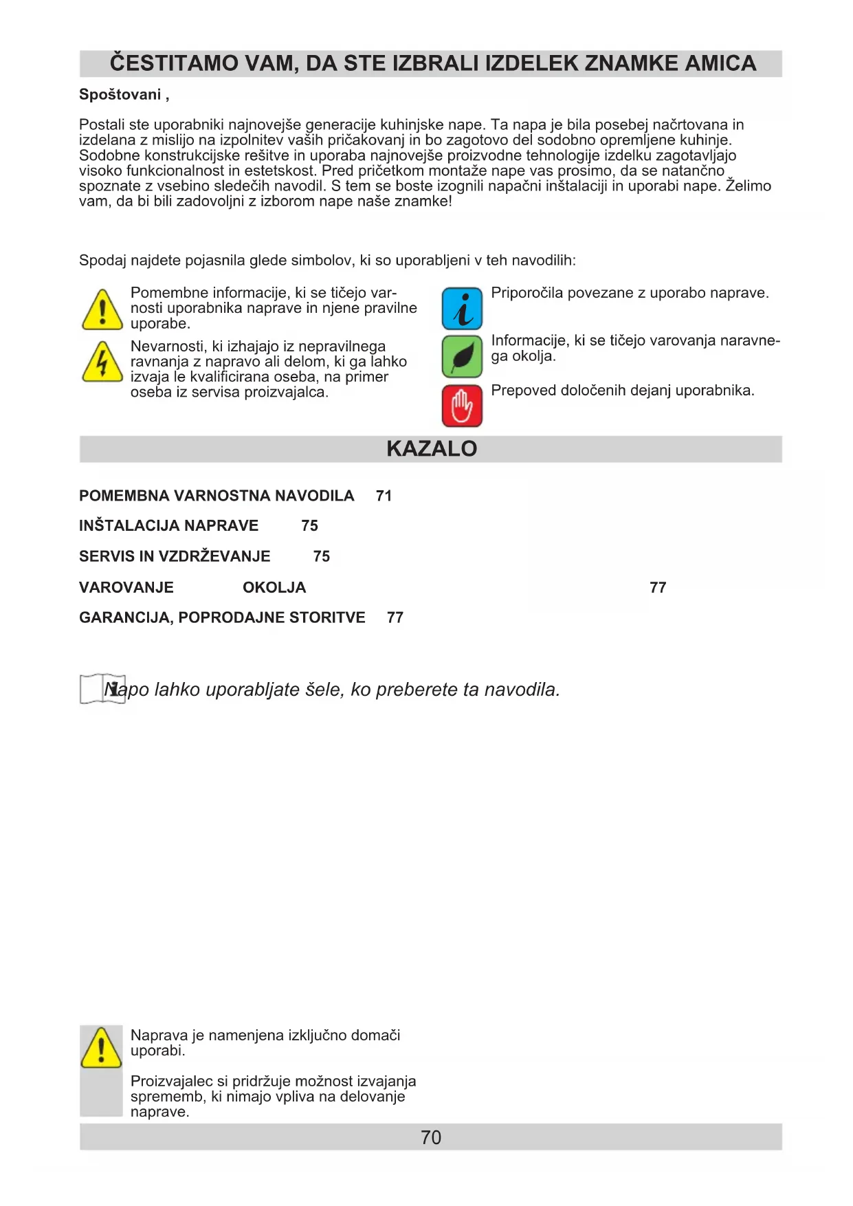 - uredbe RoHS 2011/65/EC i zato je proizvod označen te je izdana izjava o sukladnosti koja je dostupna ustanovama za nadzor tržišta.70 KAZALO Spoštovani , Postali ste uporabniki najnovejše generacije kuhinjske nape. Ta napa je bila posebej načrtovana in izdelana z mislijo na izpolnitev vaših pričakovanj in bo zagotovo del sodobno opremljene kuhinje. Sodobne konstrukcijske rešitve in uporaba najnovejše proizvodne tehnologije izdelku zagotavljajo visoko funkcionalnost in estetskost. Pred pričetkom montaže nape vas prosimo, da se natančno spoznate z vsebino sledečih navodil. S tem se boste izognili napačni inštalaciji in uporabi nape. Želimo vam, da bi bili zadovoljni z izborom nape naše znamke! ČESTITAMO VAM, DA STE IZBRALI IZDELEK ZNAMKE AMICA Spodaj najdete pojasnila glede simbolov, ki so uporabljeni v teh navodilih: Prepoved določenih dejanj uporabnika. Nevarnosti, ki izhajajo iz nepravilnega ravnanja z napravo ali delom, ki ga lahko izvaja le kvalicirana oseba, na primer oseba iz servisa proizvajalca. Pomembne informacije, ki se tičejo var- nosti uporabnika naprave in njene pravilne uporabe. Priporočila povezane z uporabo naprave.